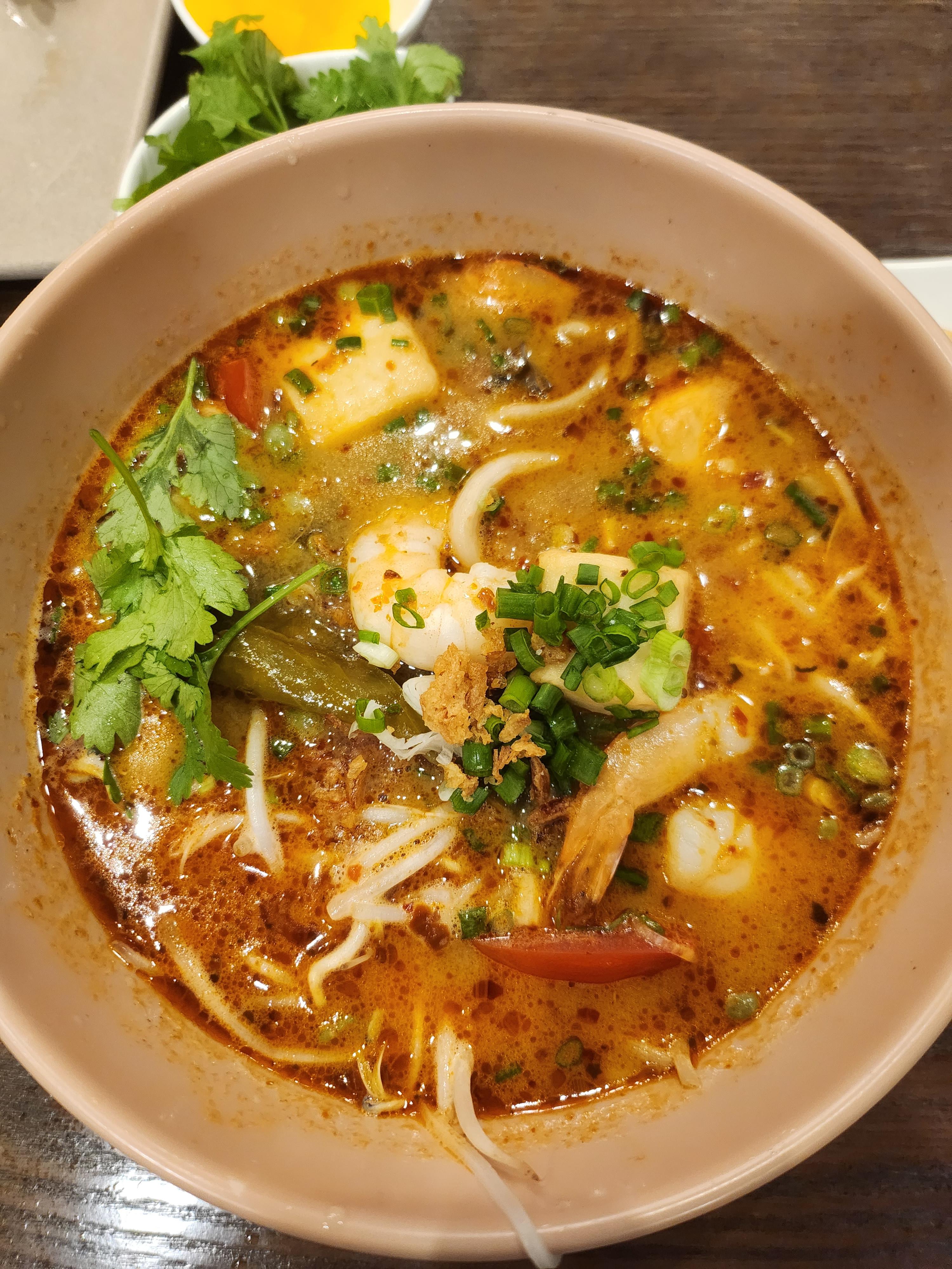 이건 가장 최근에 먹었던 똠양꿍쌀국수! 태국 본토의 맛을 그리워하는 분이나 이국적이고 색다른 메뉴가 끌리신다면 똠양꿍쌀국수를 주문하세요. 저는 전날 숙취로 힘겨워하다 똠양꿍쌀국수 한입에 다시 사람의 행색을 하게 되었습니다. 고수는 따로 주문하면 주시는데, 그걸 왕창 넣은 후에 토마토와 쪽파가 담긴 국물을 떠먹으면 극락의 맛이 따로 없습니다. 큼지막한 새우와 어묵 피쉬볼도 들어있어요. 새큼한 맛을 떠올리니 또 침고이네요. 앞으로 [먹어요] 카테고리는 밥 시간엔 쓰지 말아야겠다.