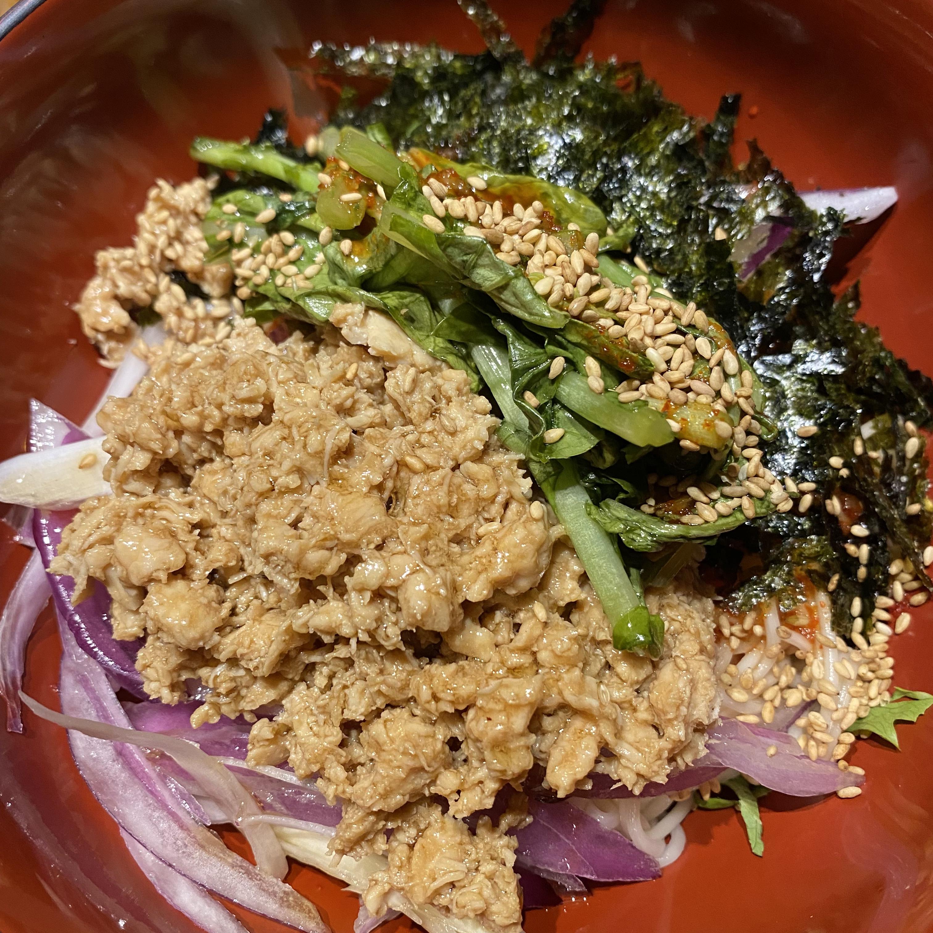 함께 주문한 비빔면과 오니기리. 송계옥도 기름기가 많은 고기류 위주이다 보니 깔끔하게 무쳐낸 열무김치와 백김치, 그리고 달콤(마늘)/매콤(유자마늘)/매운(고추)에 준하는 다양한 소스들까지 반찬류가 깔끔하고 정갈했어요.