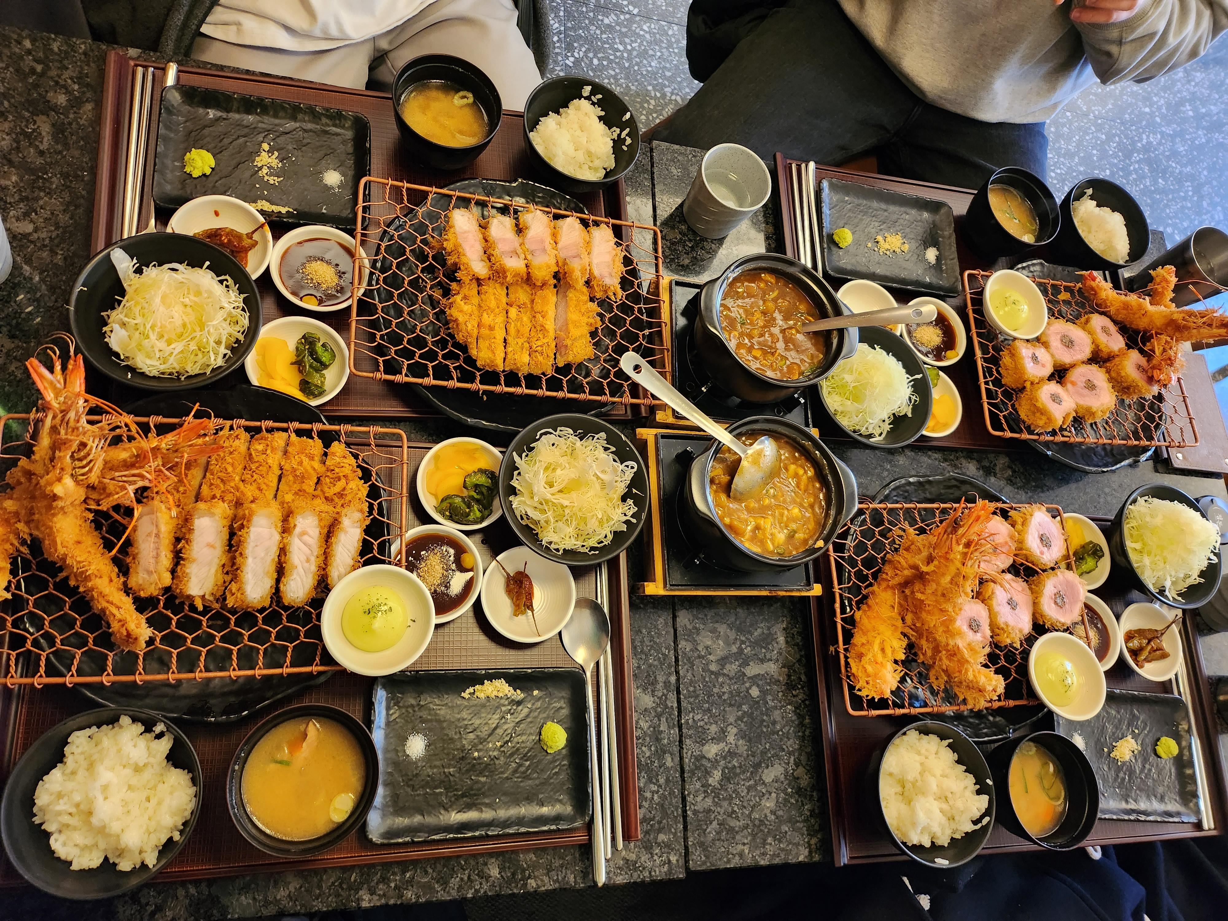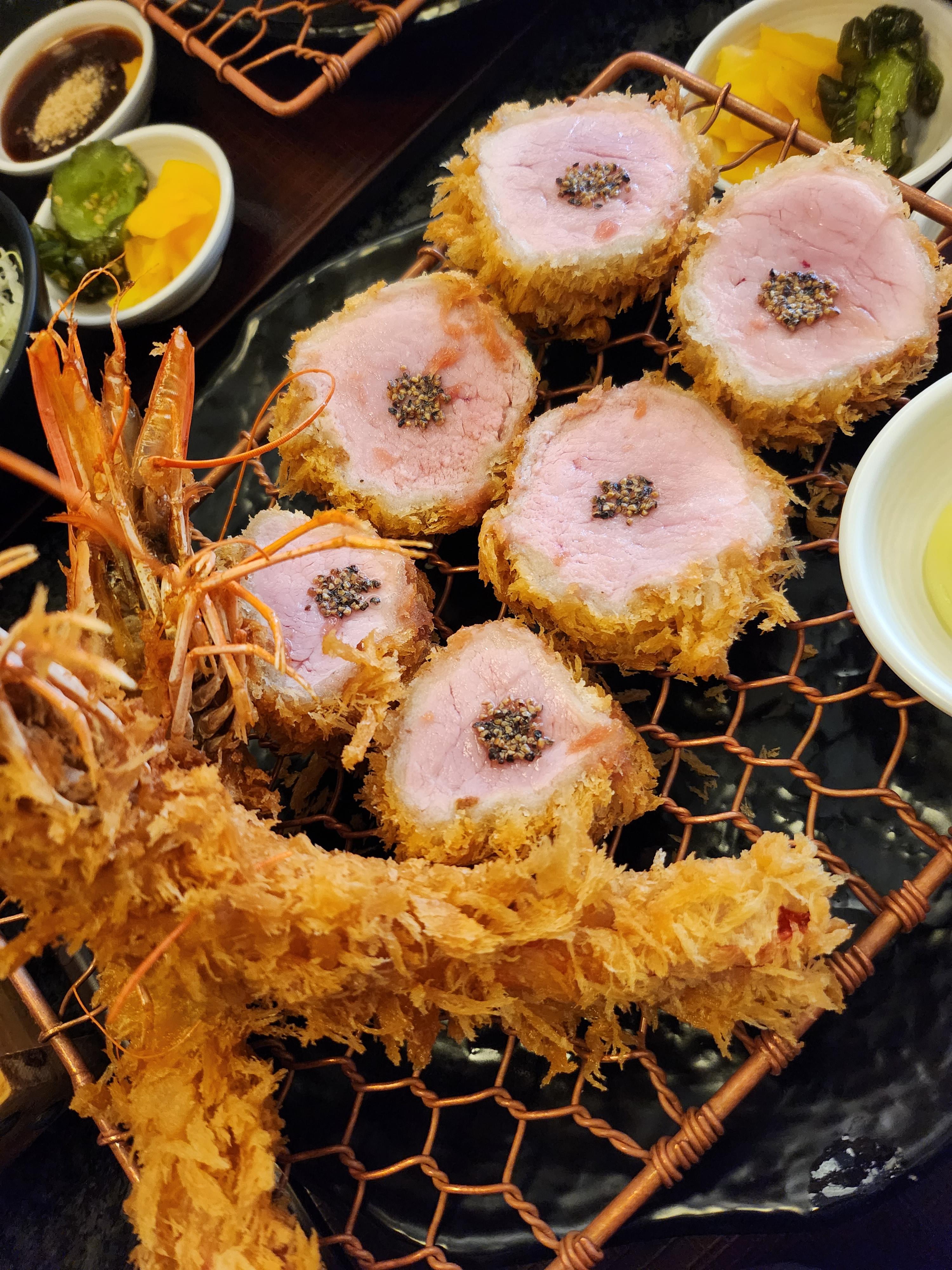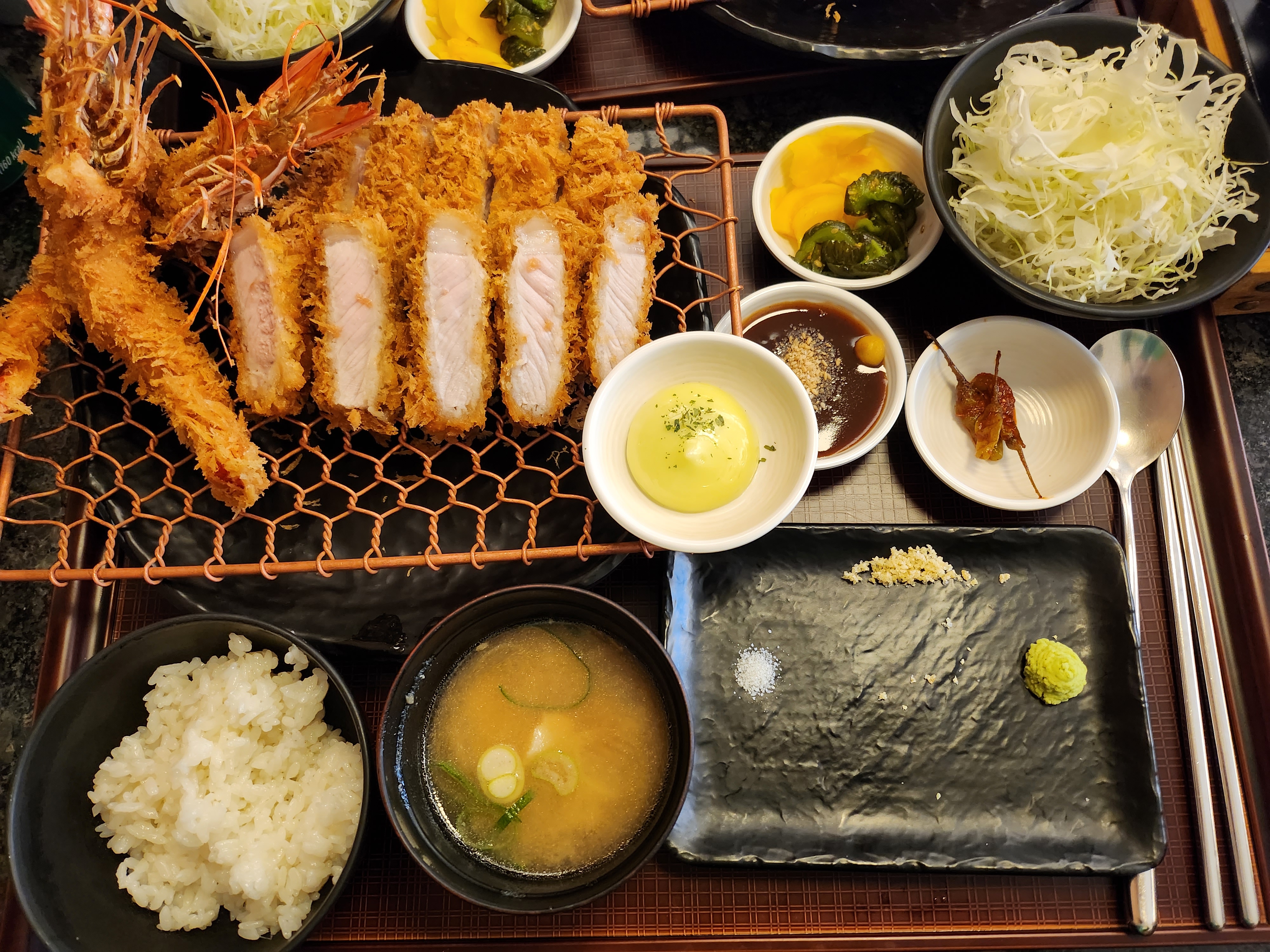 곧이어 서빙된 새우+안심 돈카츠 세트. 너어무 맛있어 보이죠? 많은 분들이 등심과 안심을 취향에 따라 고르시는 것 같더라구요. 골고루 주문이 들어가는 걸 보니 안심이라고 가장 먼저 소진되거나, 등심이라고 흔한 건 아닌 것 같았습니다. 각각 나눠서 먹어보니 안심도, 등심도, 나름의 매력이 있어서 한번씩 맛보길 추천.