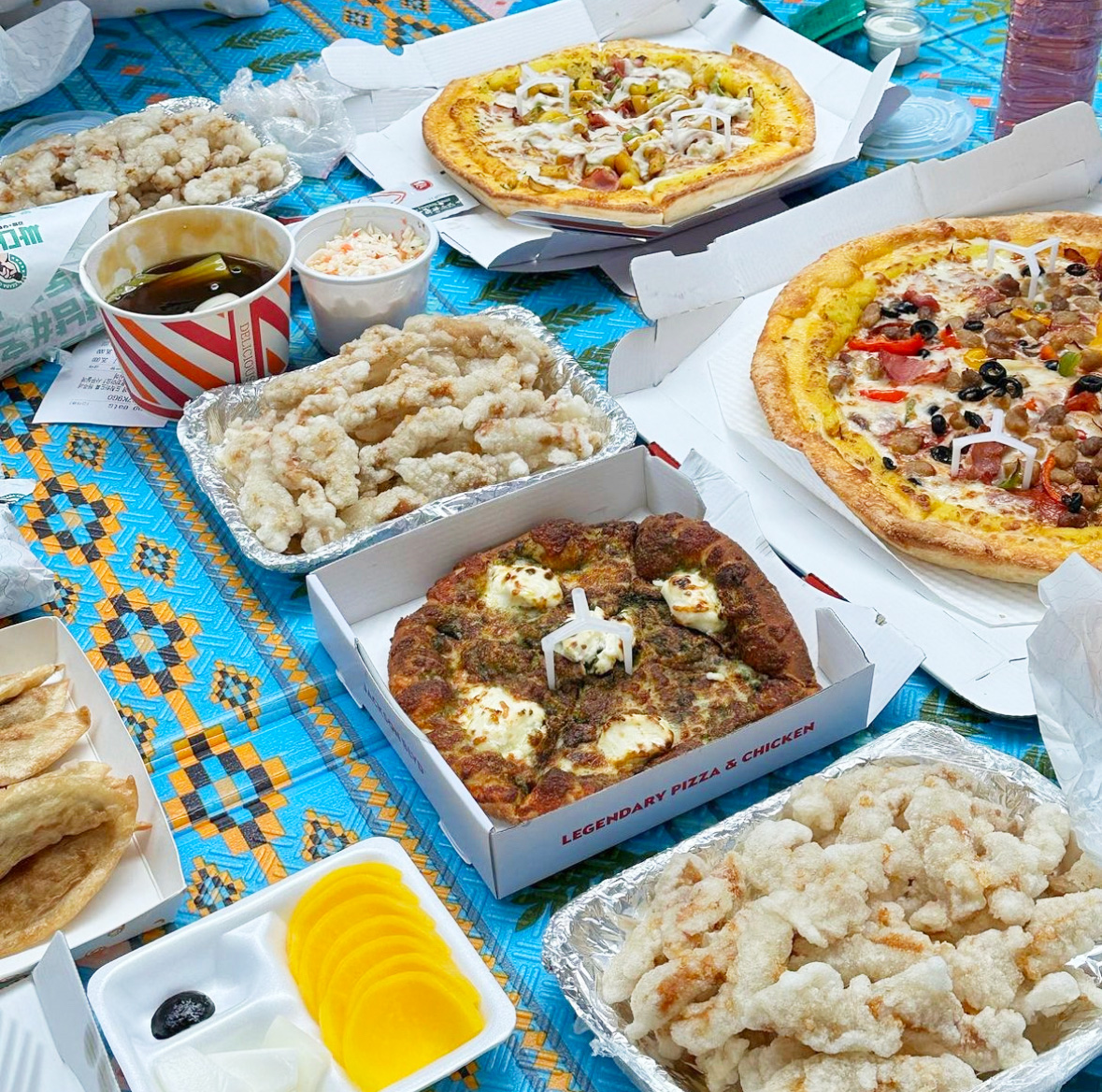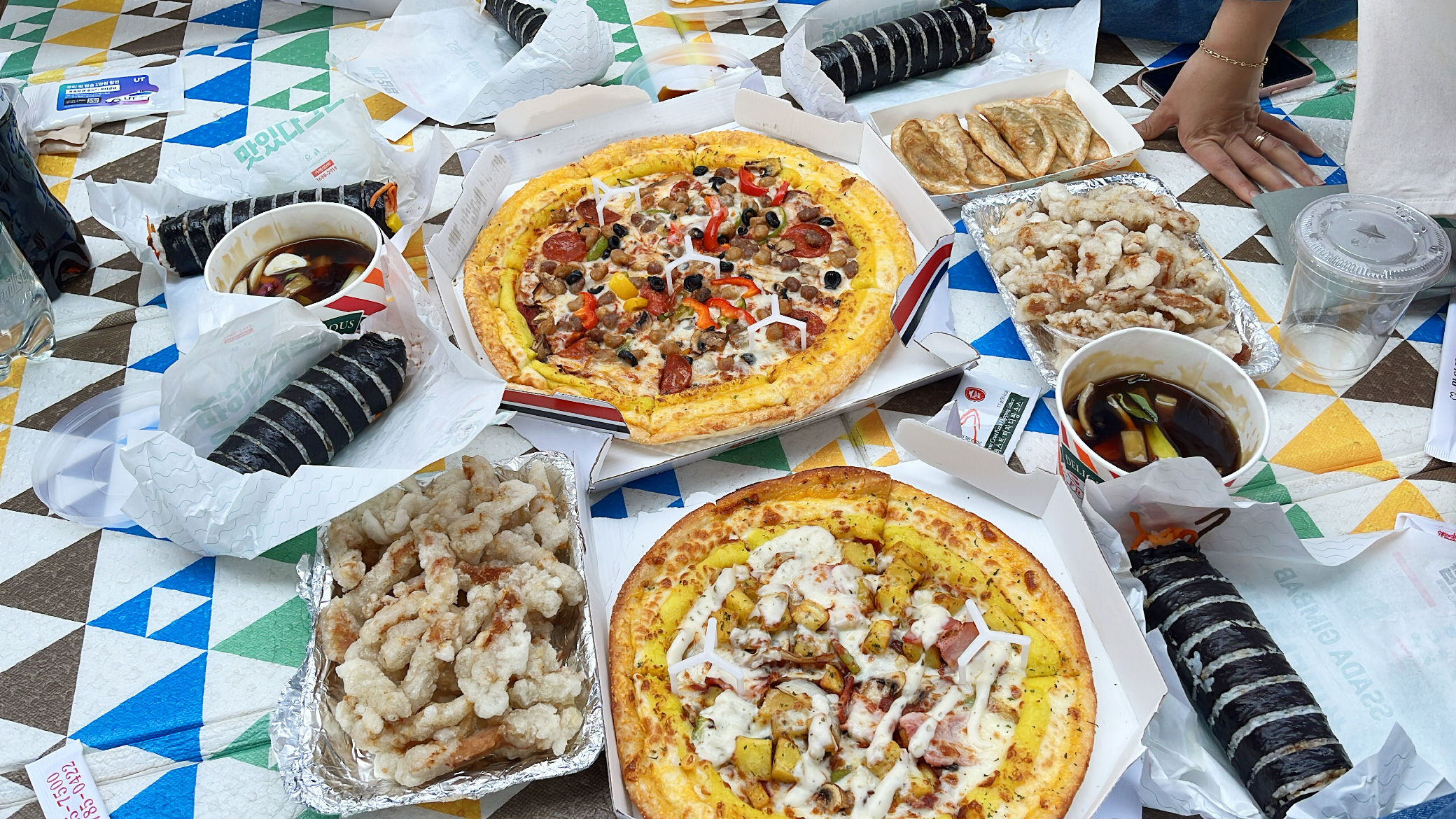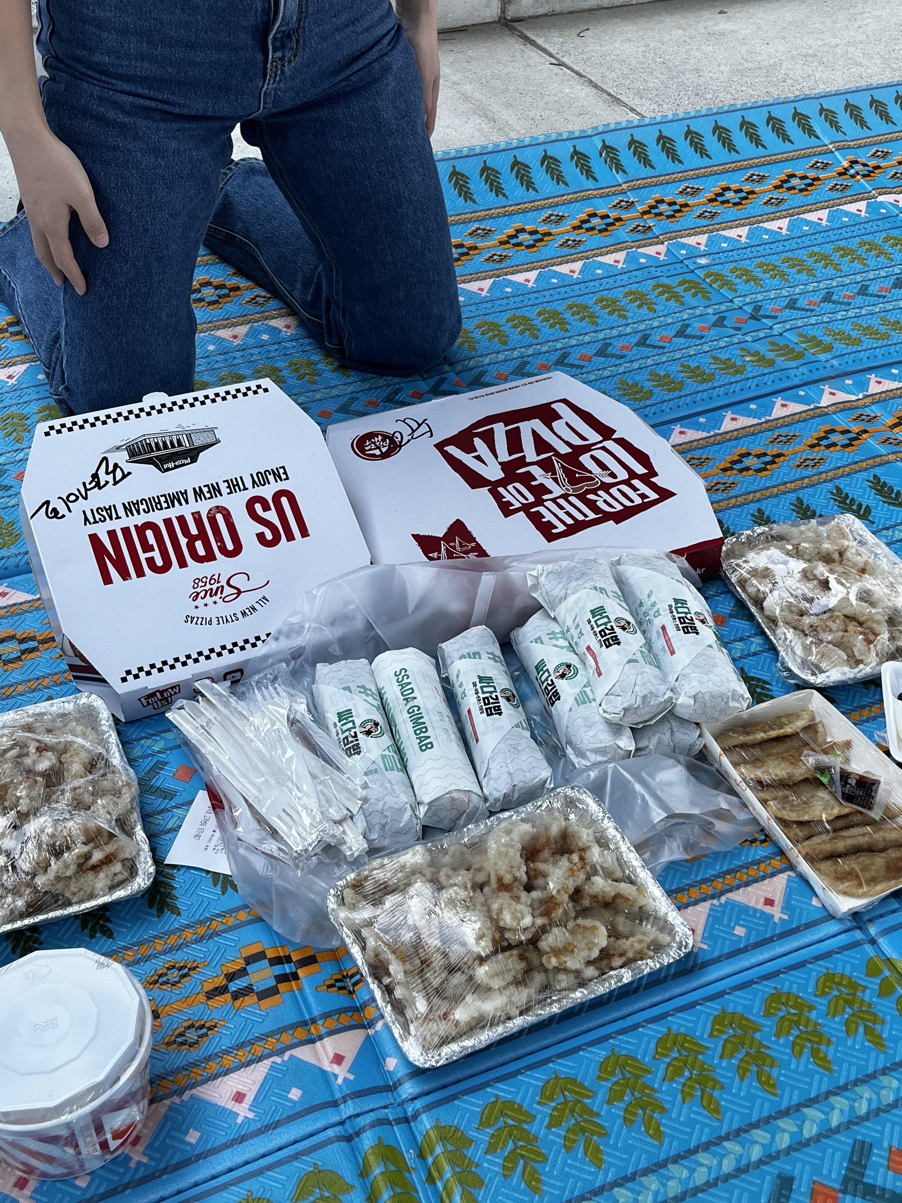 평상에서 먹을 생각을 하고 이동했는데 생각보다 자리 확보하기가 쉽지 않아서 돗자리를 대여했어요. 초특대형 사이즈로 두개를 얼른 빌려서 마포대교 아래 그늘에 널찍하게 펼쳐봅니다. 배달음식이 하나둘씩 도착하기 시작.