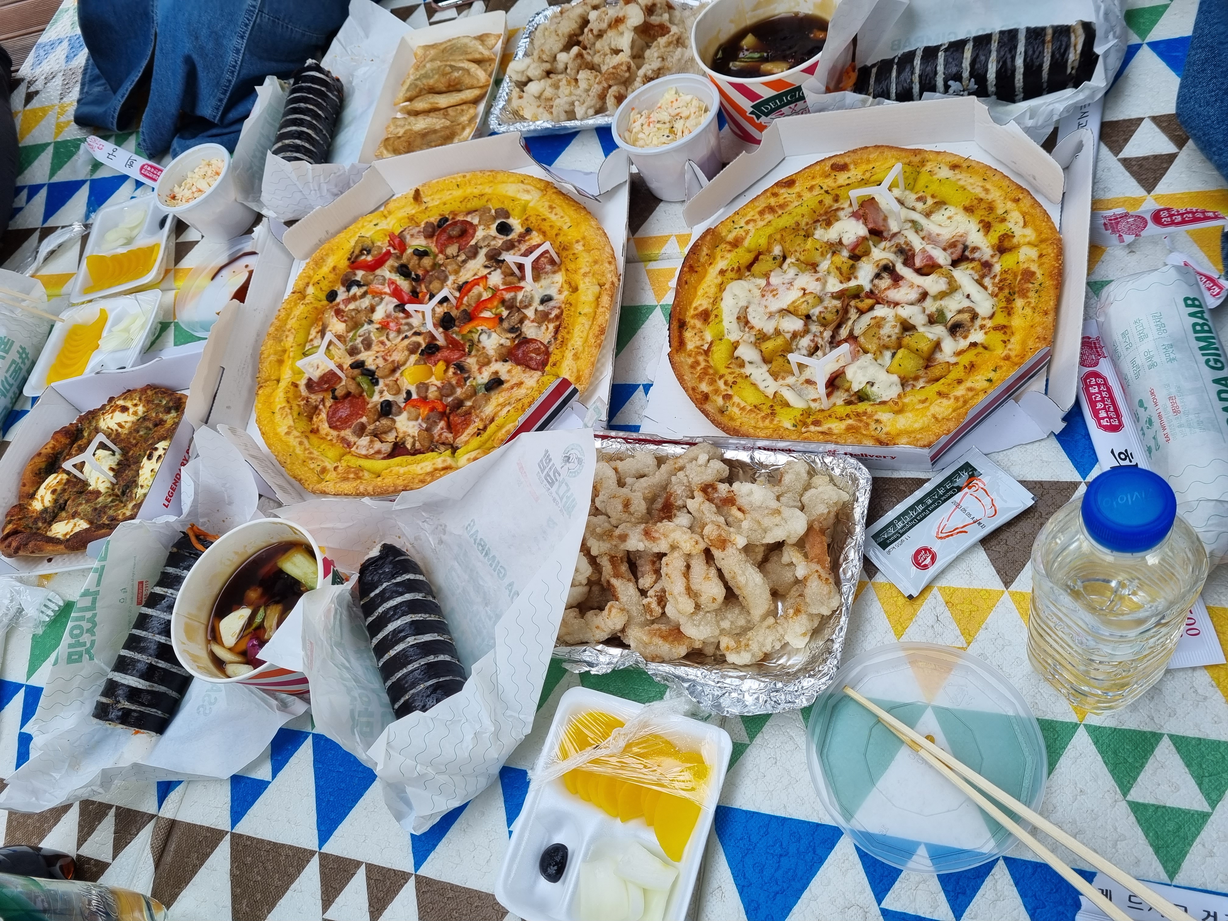일단 싸다김밥에서 김밥 8줄이랑 비빔만두를 픽업하고, 잭슨피자에서 피자도 여러 판 시키고, 중국집 희궁에서 탕수육도 주문하고 이 자리 저 자리로 분배하고 먹을 준비 완료.