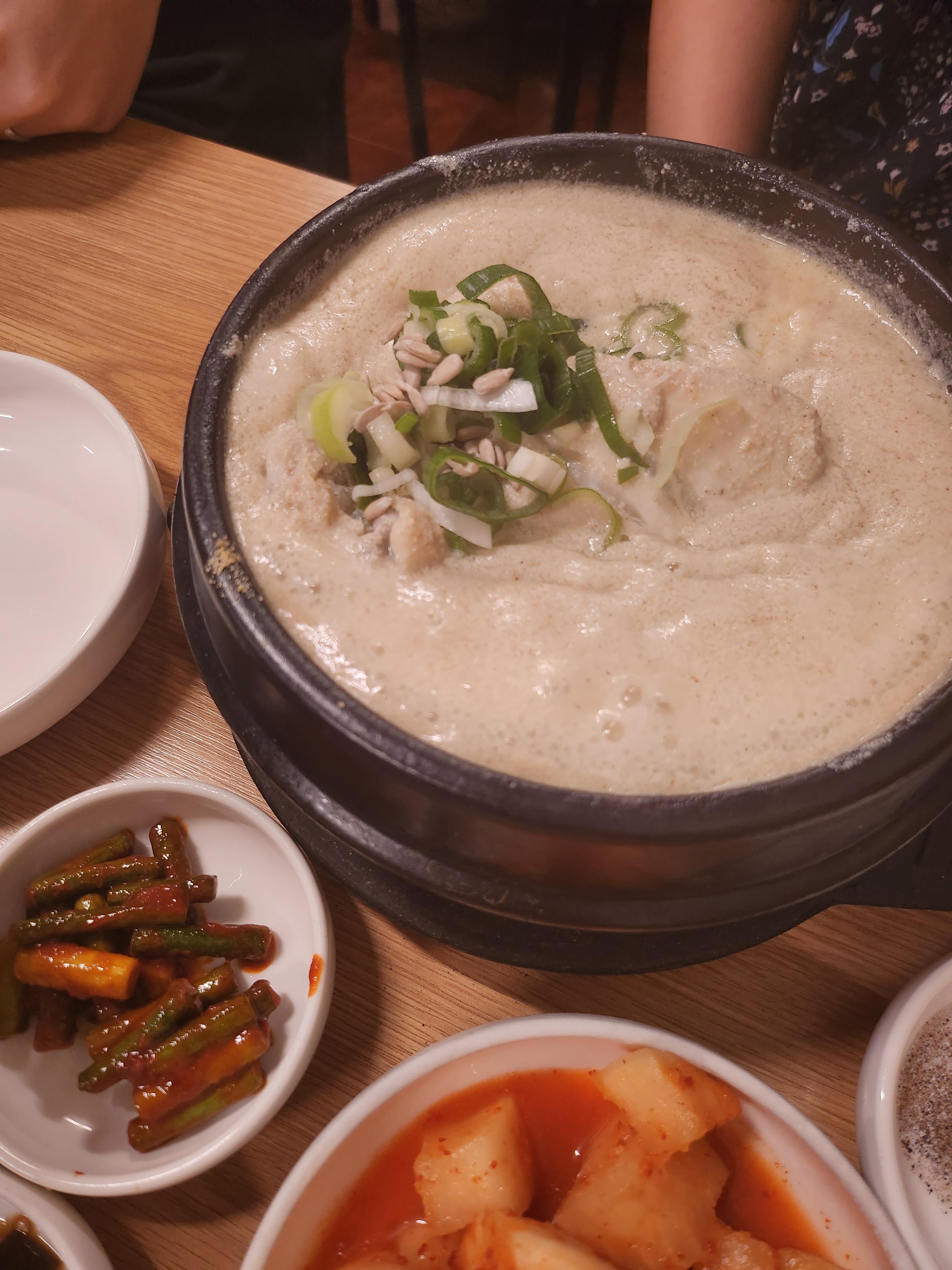 저는 기본 중에 기본, 그냥 삼계탕을 시킬까 하다가 회사에서 사주는 거니까 한방 삼계탕을 주문했습니다. 처음 나올 땐 한약재의 향이 물씬 나는데, 먹으면 막상 그런 맛이 너무 강하다거나 역하지는 않았어요. 깔끔하고 쌉싸름한 뒷맛이랄까. 구수한 들깨의 맛을 좋아하는 친구들은 들깨 삼계탕을 주문했어요. 그 사진도 함께 보시죠.