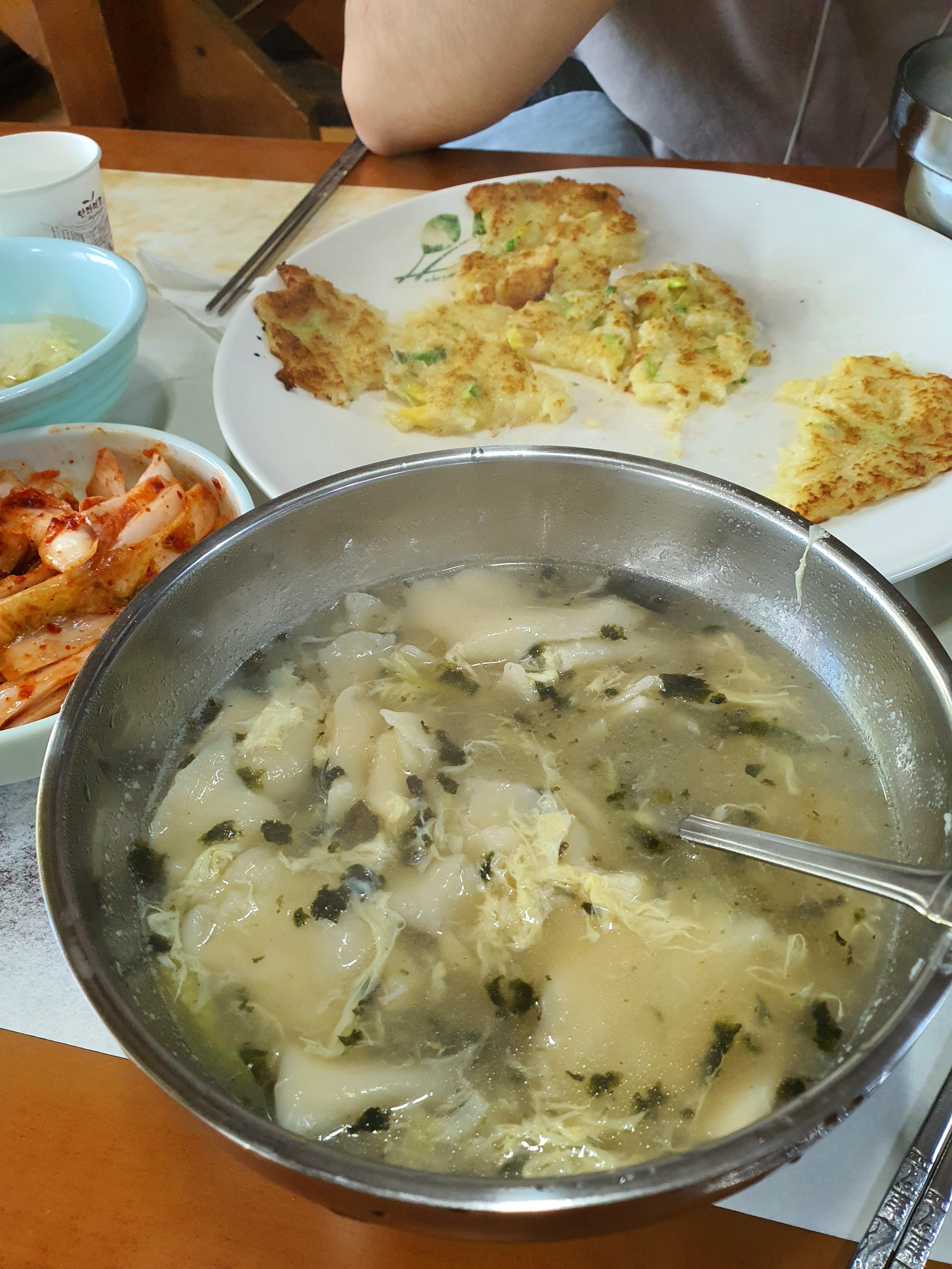 점심 주문은, 간단합니다. 인원 수 대로 들어가면, 식사 메뉴는 수제비 하나이므로 자동 주문되고 '감자전' 또는 '해물파전' 둘 중 하나만 외치시면 현지인 느낌 낭낭하게 입장하실 수 있습니다. 배가 좀 작다 싶은 분들은 수제비만 먹어도 든든합니다. 하지만 적어도 3인 이상이 가신다면 둘중 하나 골라서 시켜보세요. 수제비만으로 입이 심심할 것 같다 싶으면 해물파전을, 수제비의 맛을 더 진하게 느끼고 싶다하면 감자전을.