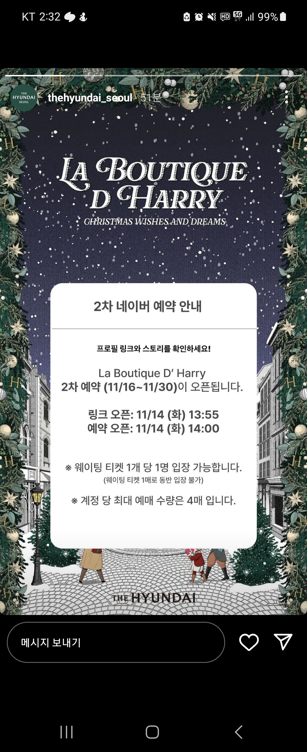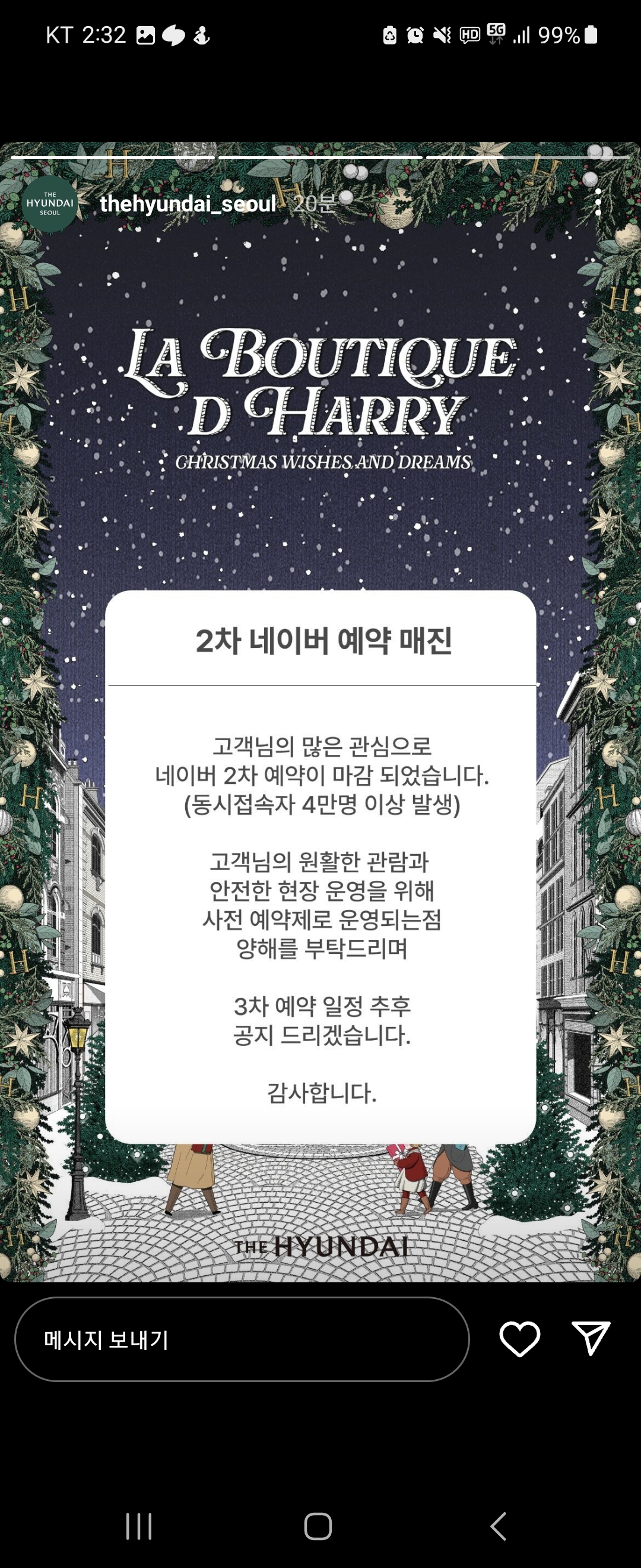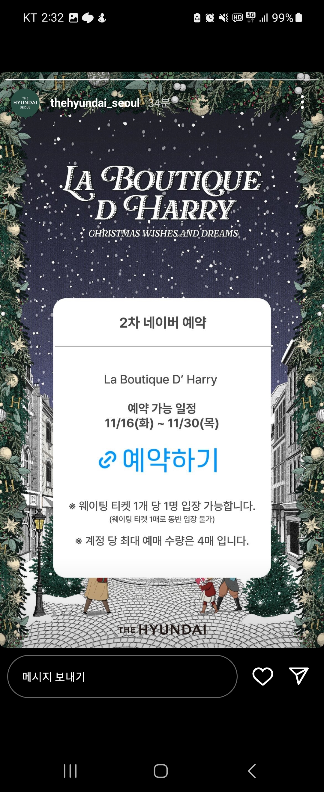 더현대 크리스마스 빌리지 성공하신 분들, 축하드립니다. 저희는 3차 예약 때... 또 할 수 있을까요? (빈정 상해서) 하지만 누군가 채팅창에 남겼듯이 노쇼가 빈번하고 현장 웨이팅은 QR코드로 대기 예약 후 평균 1시간 30분만 기다리면 볼 수 있는 가능성이 있다고 하니 꼭 보고 싶다, 하는 분들은 도전해보시는 것도 좋을 것 같습니다.
