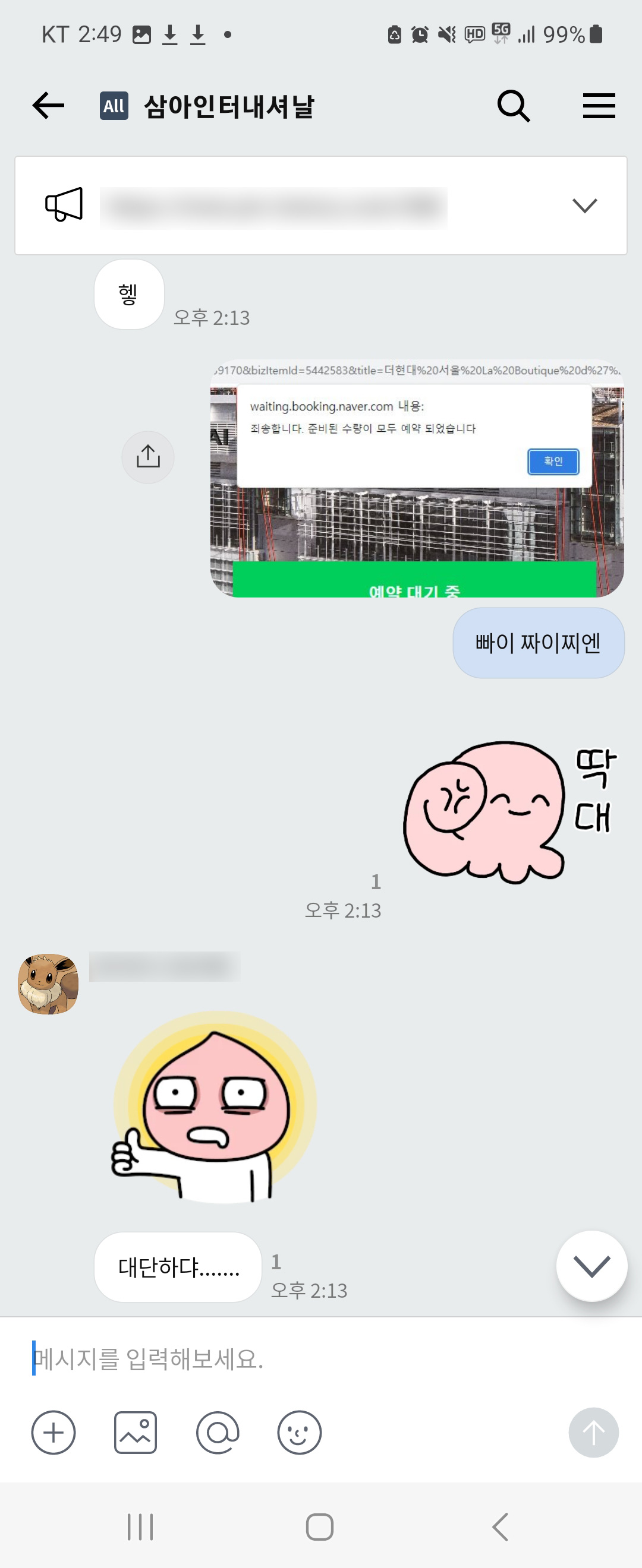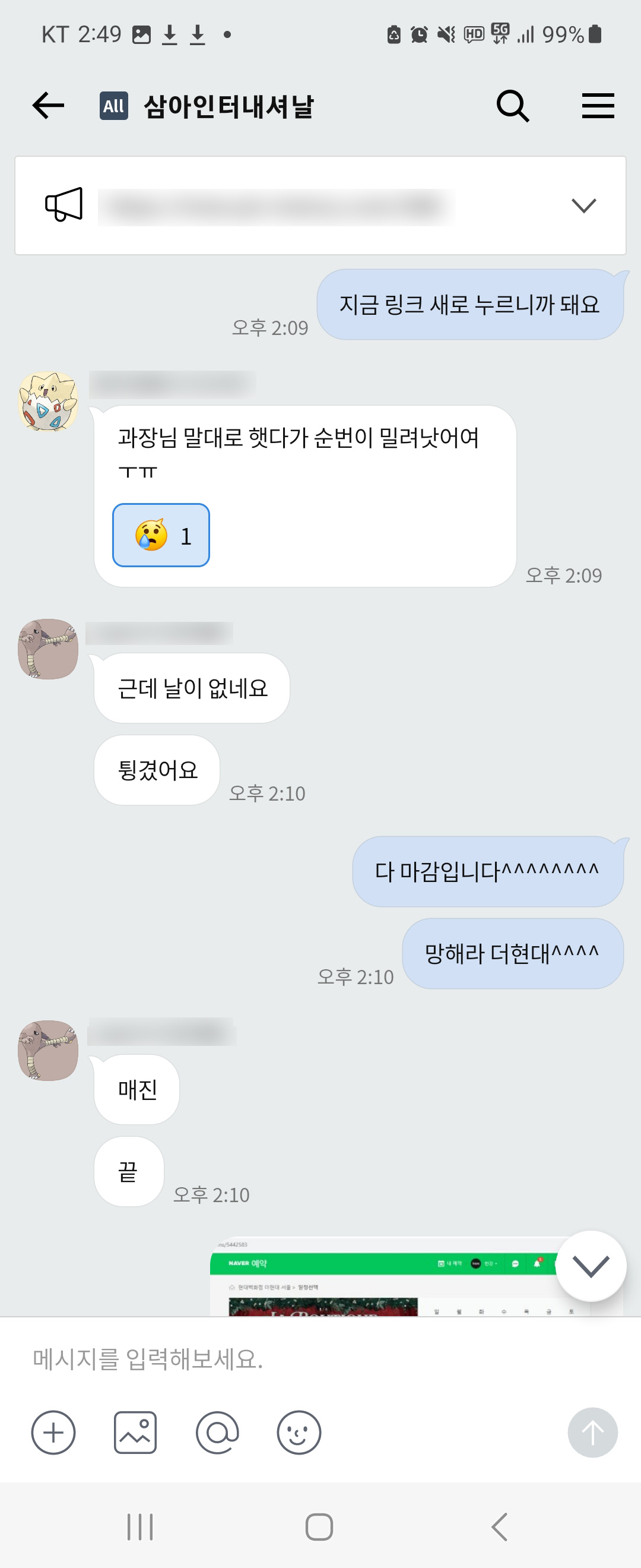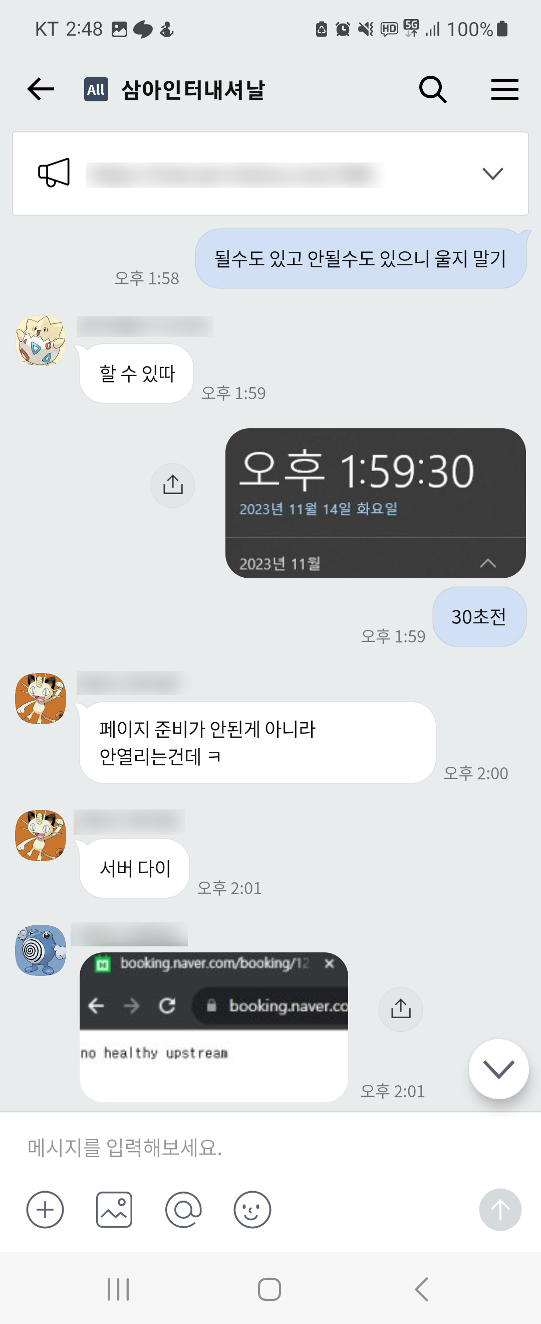 예약 링크가 1시 55분에 공개되고 미리 링크를 공유했더니 안뜬다고 당황하는 동료들의 원성 5초간 발사. 침착해, 침착해.