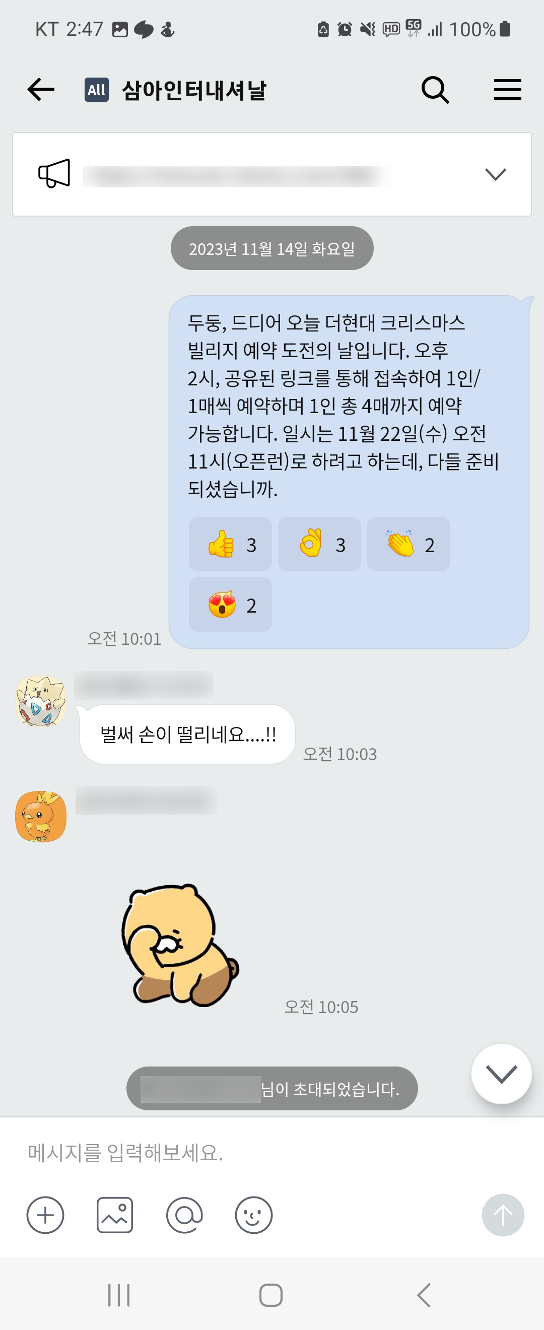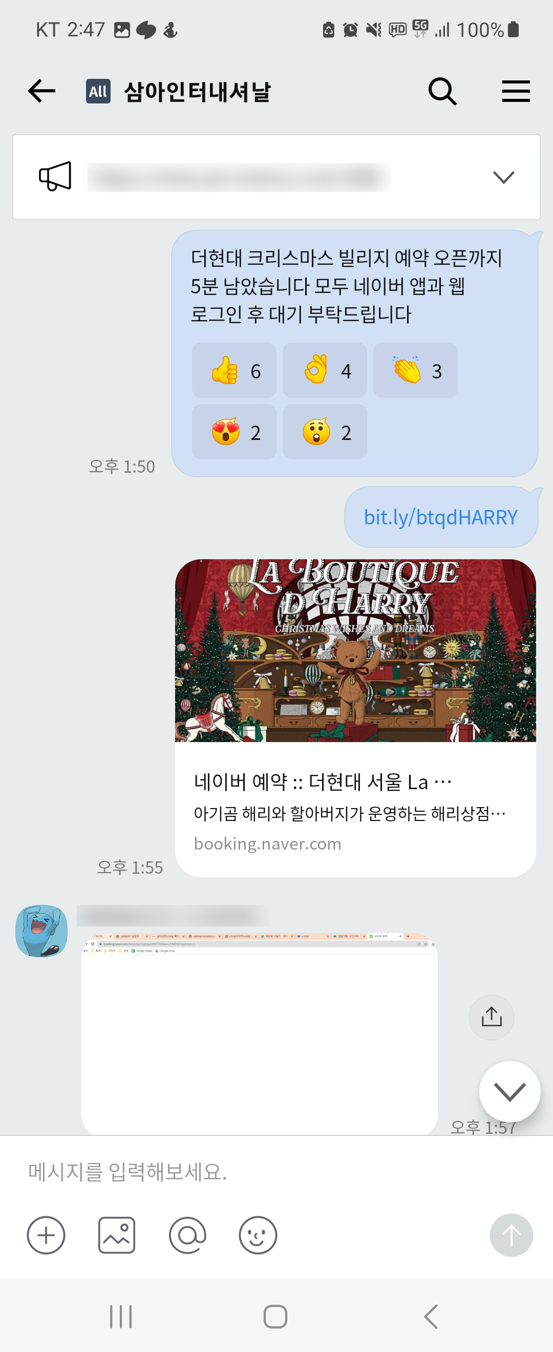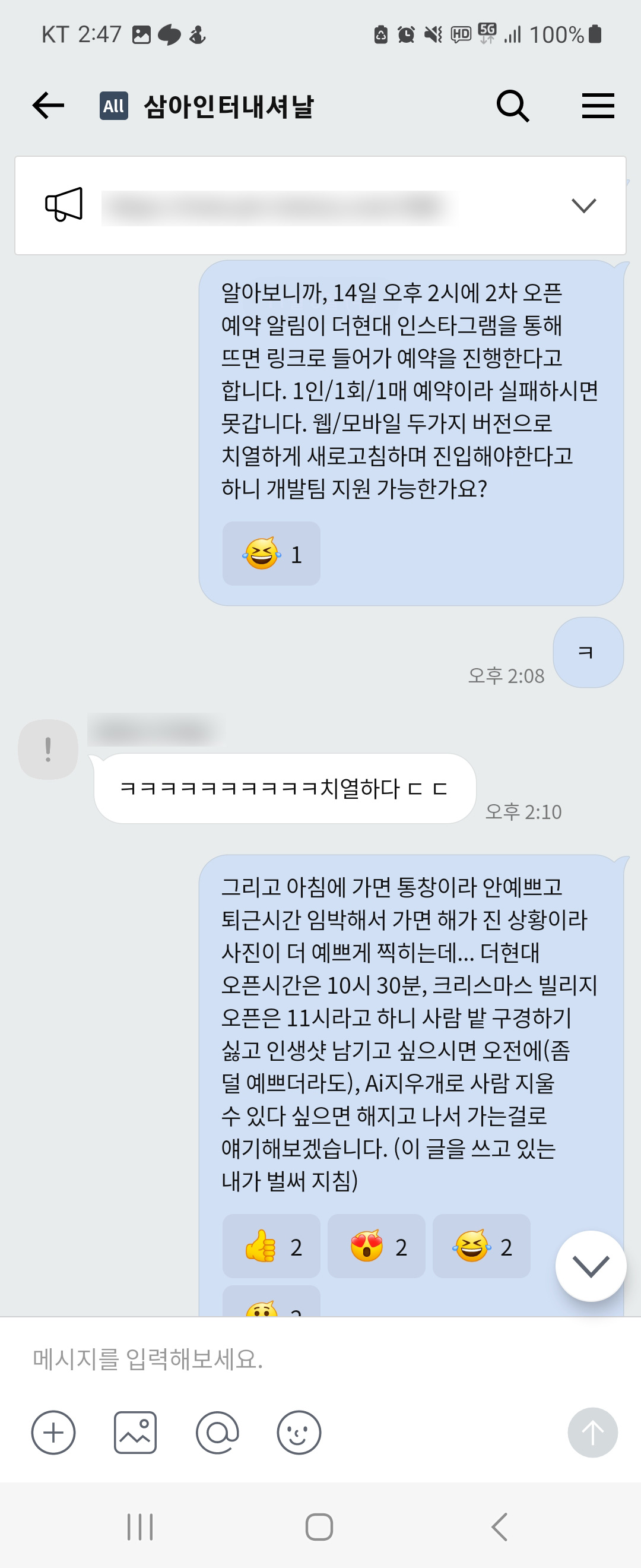 그렇게, 저희의 단체 예약 도전은 13분만에 모든 것이 처참한 실패로 끝났습니다. 앞서 올린 것 처럼, 대표님이 더현대 한시간만 대관해주시면 좋겠다^^는 말도 안되는 소리는 그냥 해본거예요. 모든 게 디지털이 되는 시대, 물론 저희 사업부의 주요 업무도 디지털 산업이긴 합니다만... 음식점 주문창도, 야구 예매 티켓도, 택시 예약도 전부 키오스크나 모바일 앱으로 변경되어 어르신들이 할 수 있는 게 없다는 기사가 하루에도 몇 개씩 올라는 요즘. 쓰디쓴 경험이긴 합니다. 하지만 성공담도 아니고, 실패 기록을 이렇게 남기는 이유는, 오랜만에 대부분의 임직원이 한 마음 한 뜻으로 도전해본 경험이라 남겨두고 싶었달까요.