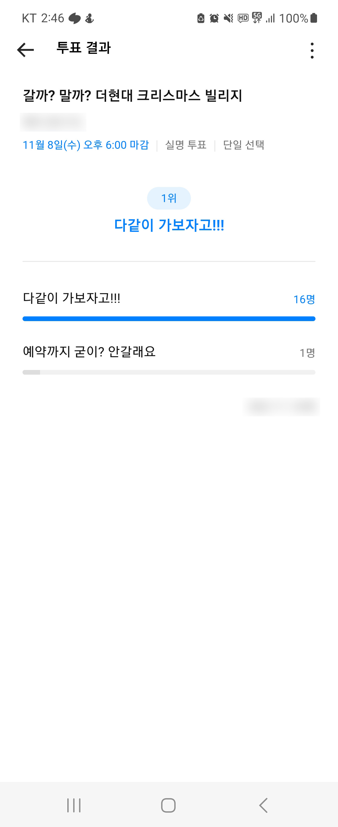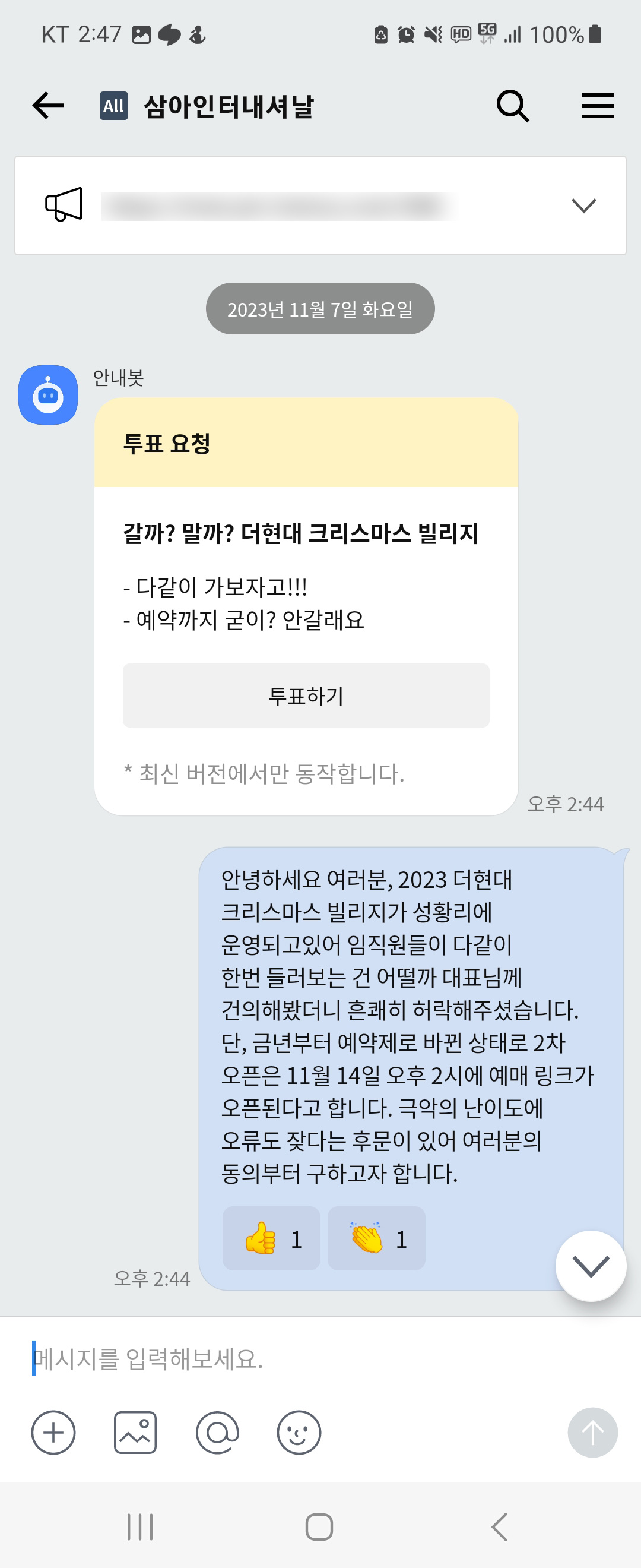 대표님이 흔쾌히 허락해주시면서, 임직원 중 참석 의사가 있는지 투표에 붙여보았는데요. 말그대로 실명 투표였던지라 투표에 임하지 않은 분도 있었고 당당하게 '싫소만'이라고 응답해주신 분도 계셨습니다. 하지만 뭐, 늘 그렇듯이, 저희는 빡세게 일한 만큼 노는 것도 좋아하니까. 다함께 해보는 걸로 결정이 났다죠.