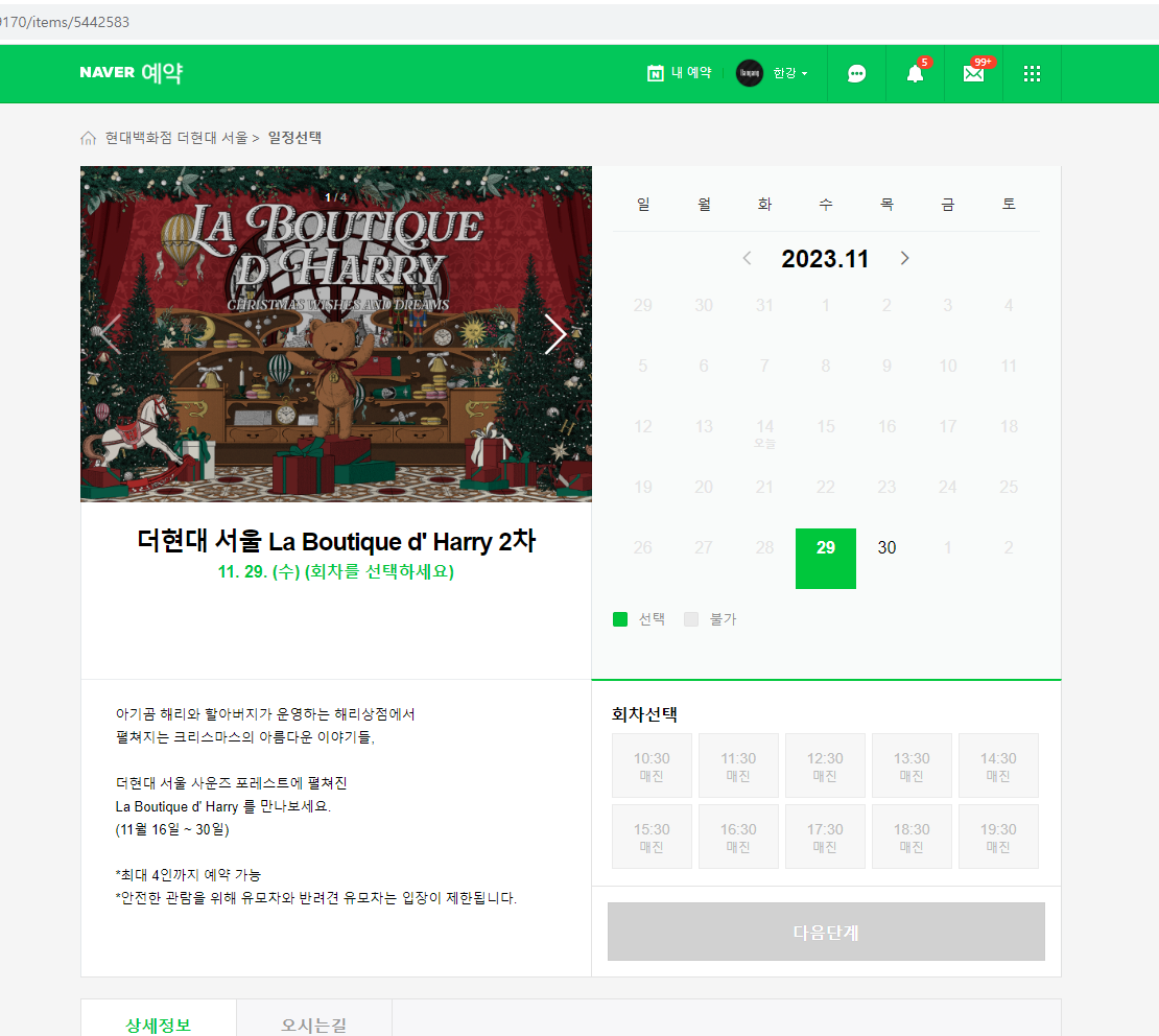 2시 6분이 지나자 달력창이 뜨긴 했으나 이미 모든 날짜와 시간이 매진이었답니다하하하하핳하하하핳ㅎ. 그나마 저는 17:30 초록불 하나를 발견해서 다음 단계 진입까지는 성공했지만 기쁜 소식을 공유하느라 캡쳐 뜨고 있는 동안 다른 분이 채가셨습니다... 그 이후로 다시 대기순번이 뱅뱅 돌기 시작하더니.