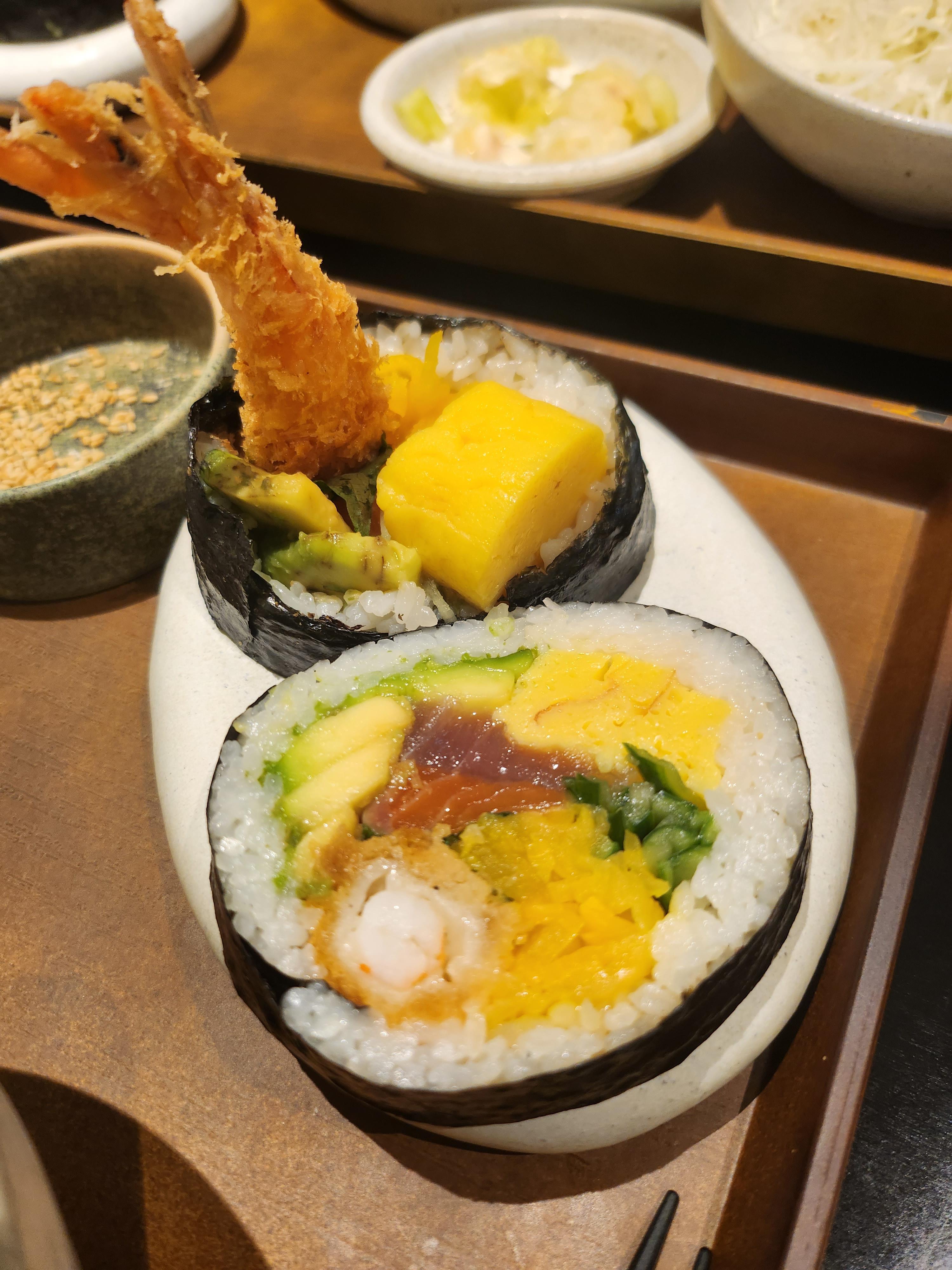통깨 자동 디스펜서가 잠깐 고장이 났는지 갈린 깨가 아니라 진짜 통깨가 그대로 와르르 쏟아져서 그냥 냅다 치즈카츠위에 부어버리고, 후토마끼는 저는 처음 먹어보는거라 조금 더 근접샷으로 찍어봤습니다. 한 입에 먹기 힘든 김밥 느낌이었는데, 아시다시피 저는 한식파라 4,500원짜리 삼형제김밥이 더 맛있는 것 같은 느낌. 미식하시는 분들은 차이점을 아시겠죠...
