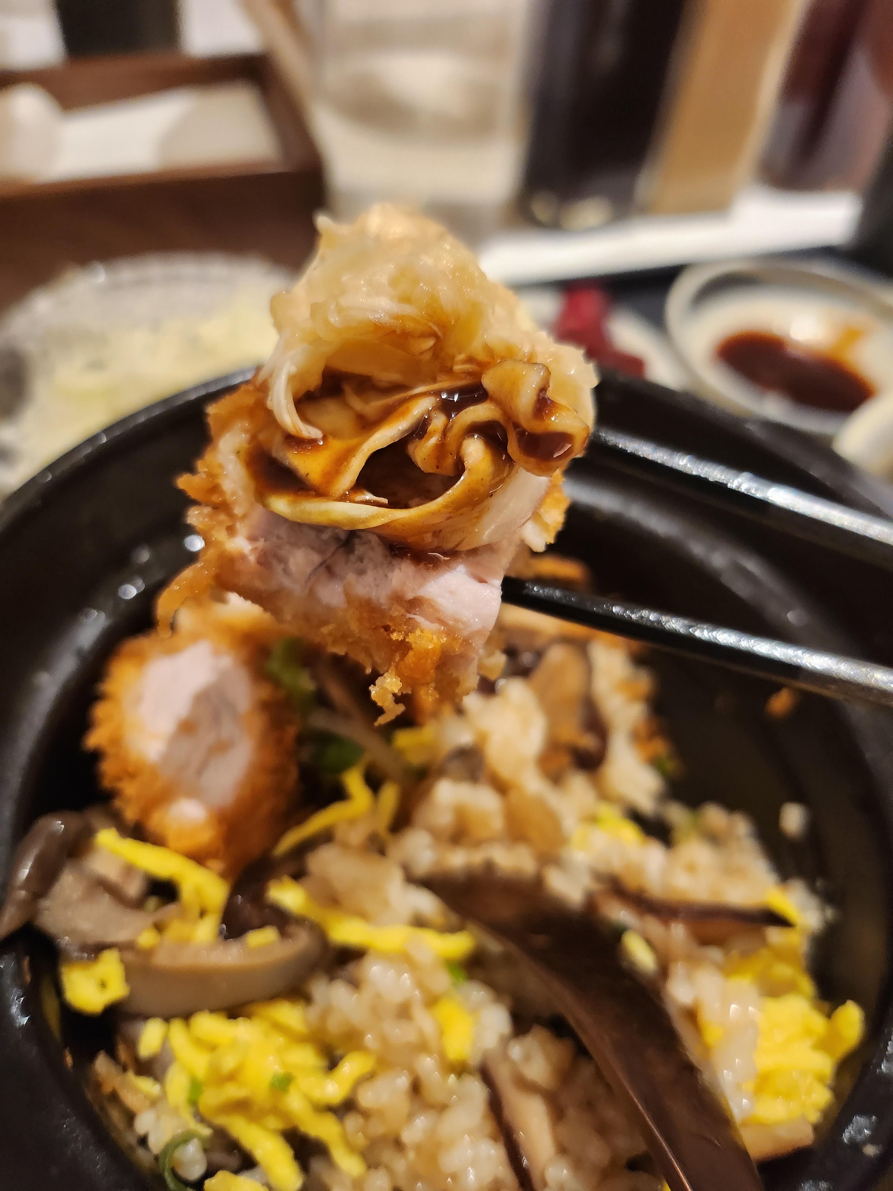 이 날의 예산에 맞춰 1만8천원 이내의 메뉴를 주문하라는 지시 하에 저는 안심카츠동 반상을 주문했습니다. 모든 메뉴가 깔끔하게 트레이에 담겨 나오더라고요. 직각으로 딱 떨어지는 새까만 물컵과 티슈 위에 얹어진 흰 조약돌까지 대접받는 것 같은 느낌입니다. 안심카츠와 달걀 지단 아래로 표고버섯과 소스가 뿌려진 솥밥 같은 것이 나오고, 생각보다 양이 꽤 많았습니다.