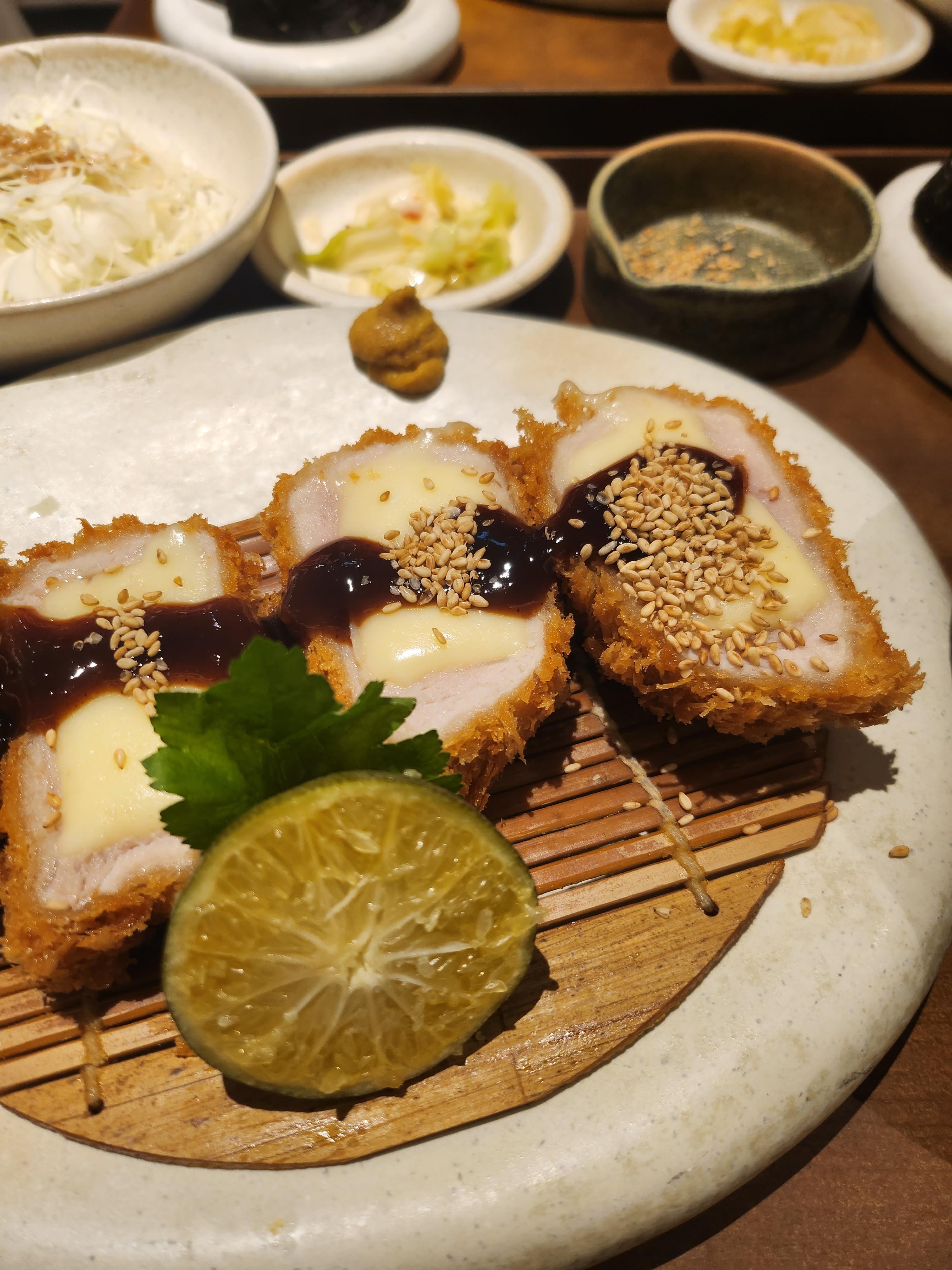 연이어 등심카츠와 트리플치즈카츠도 서빙되었습니다. '반상'이라는 네이밍이 포함된 게 아니면 주로 하얗고 말끔한 규격 오차 -0.5cm의 트레이에 각맞춰 나오네요. 그래서인지 바삭한 튀김과 촉촉한 육즙이 생생하게 살아보이는 장점이 있어요. 와사비, 히말라야, 레몬 소금 3종이 카츠류에는 함께 나옵니다. 적당히 바꿔서 곁들여 먹으면 더 맛있겠죠?