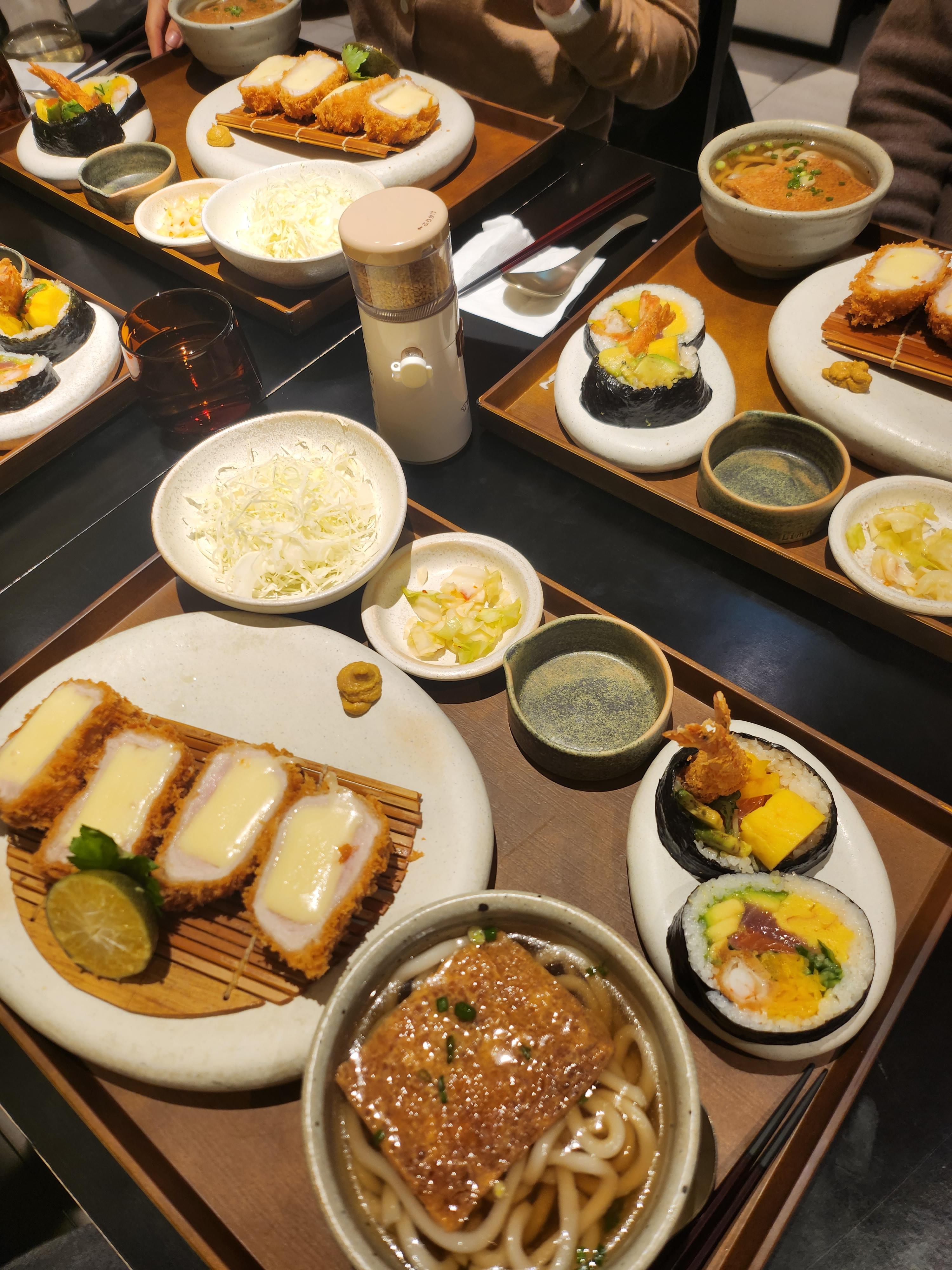 이 곳은 후토마끼가 포함된 반상 메뉴가 위주입니다. 대표메뉴인 카츠반상은 치즈카츠와, 위에서 봤던 히바린의 반상처럼 유부우동과 함께 후토마끼가 저렇게 나와요. 동글동글한 접시에 나오니 트레이 구성이 상당부분 비슷한데도 불구하고 다른 느낌이네요.