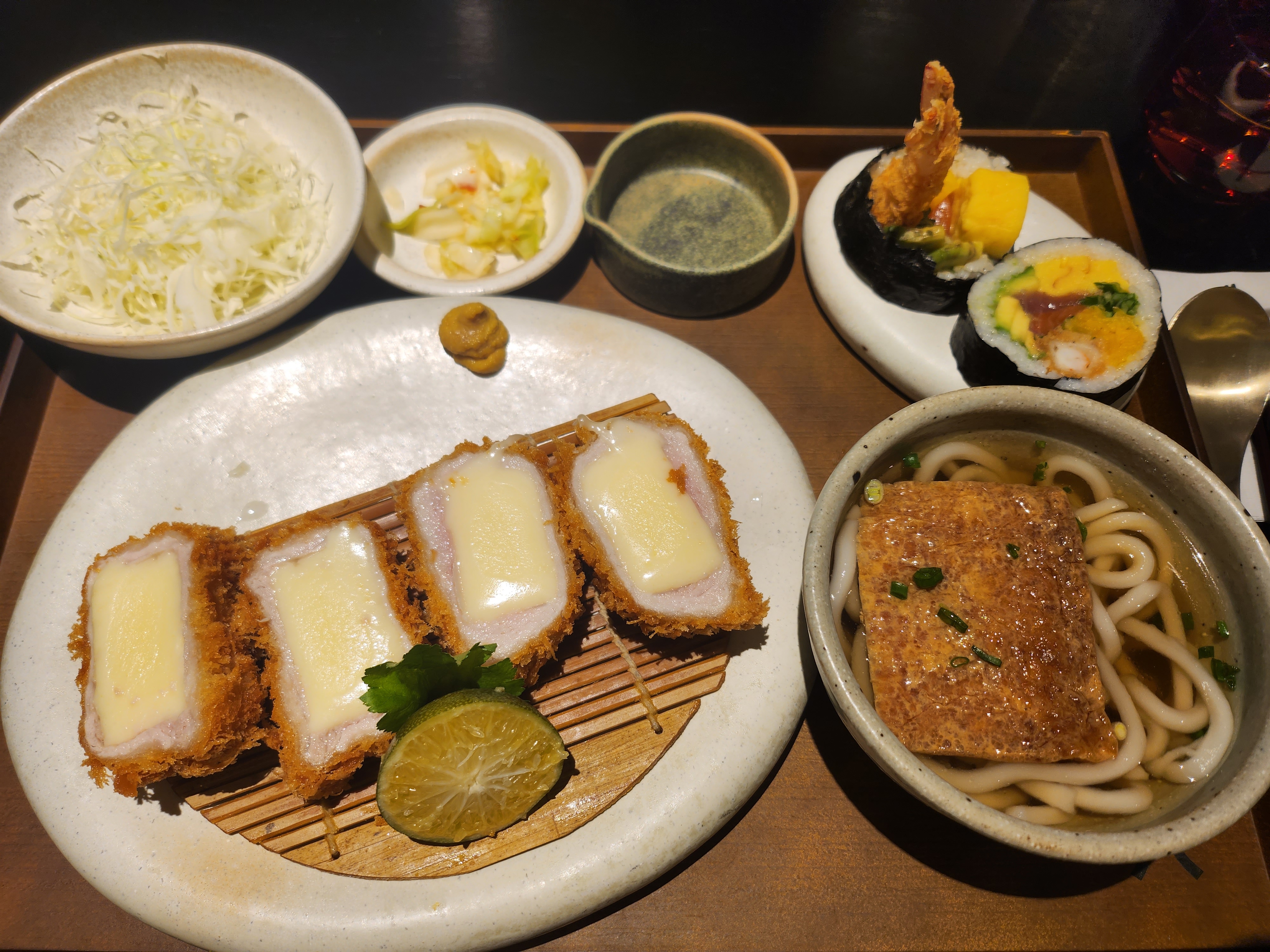 이 곳은 후토마끼가 포함된 반상 메뉴가 위주입니다. 대표메뉴인 카츠반상은 치즈카츠와, 위에서 봤던 히바린의 반상처럼 유부우동과 함께 후토마끼가 저렇게 나와요. 동글동글한 접시에 나오니 트레이 구성이 상당부분 비슷한데도 불구하고 다른 느낌이네요.