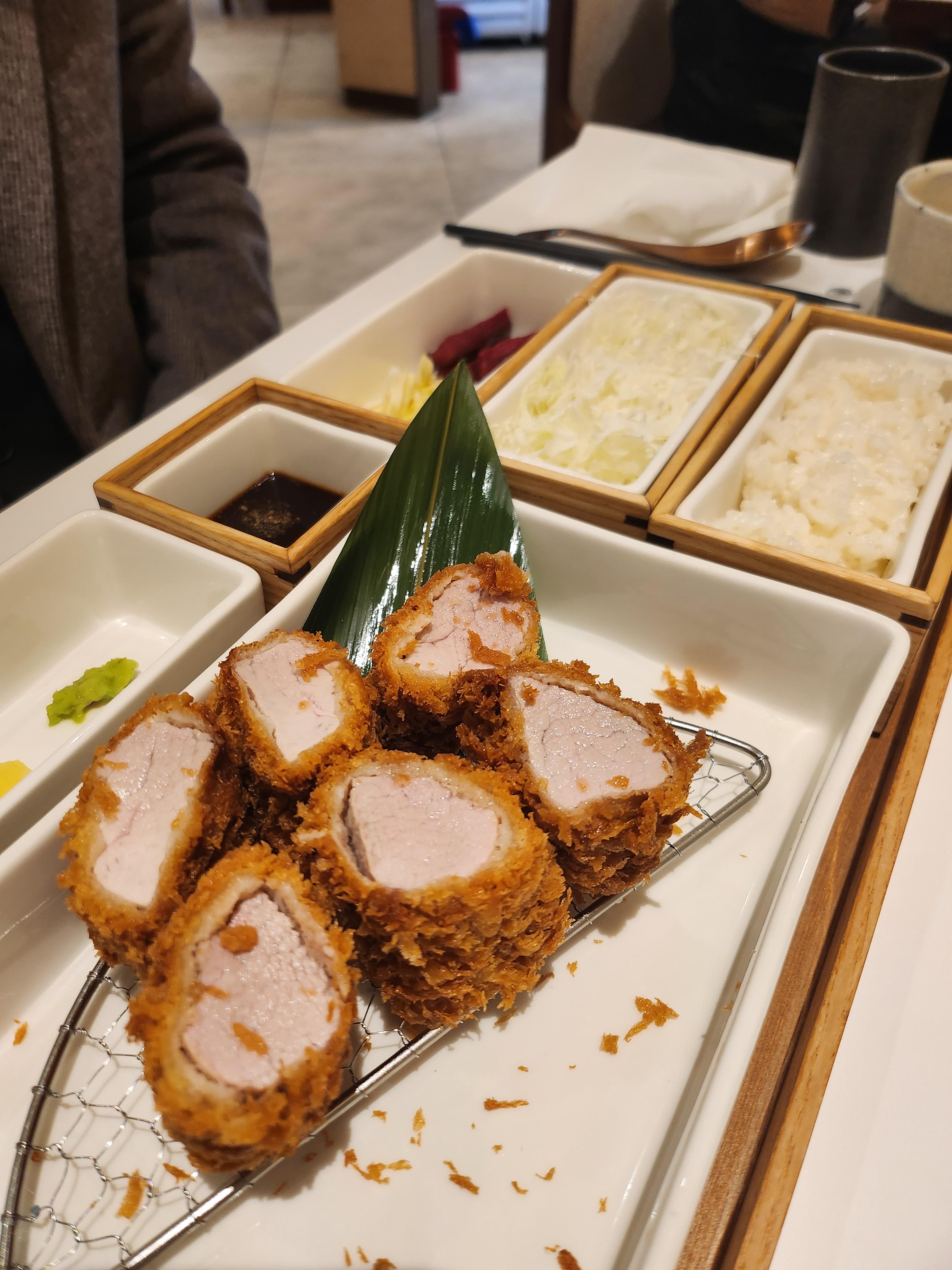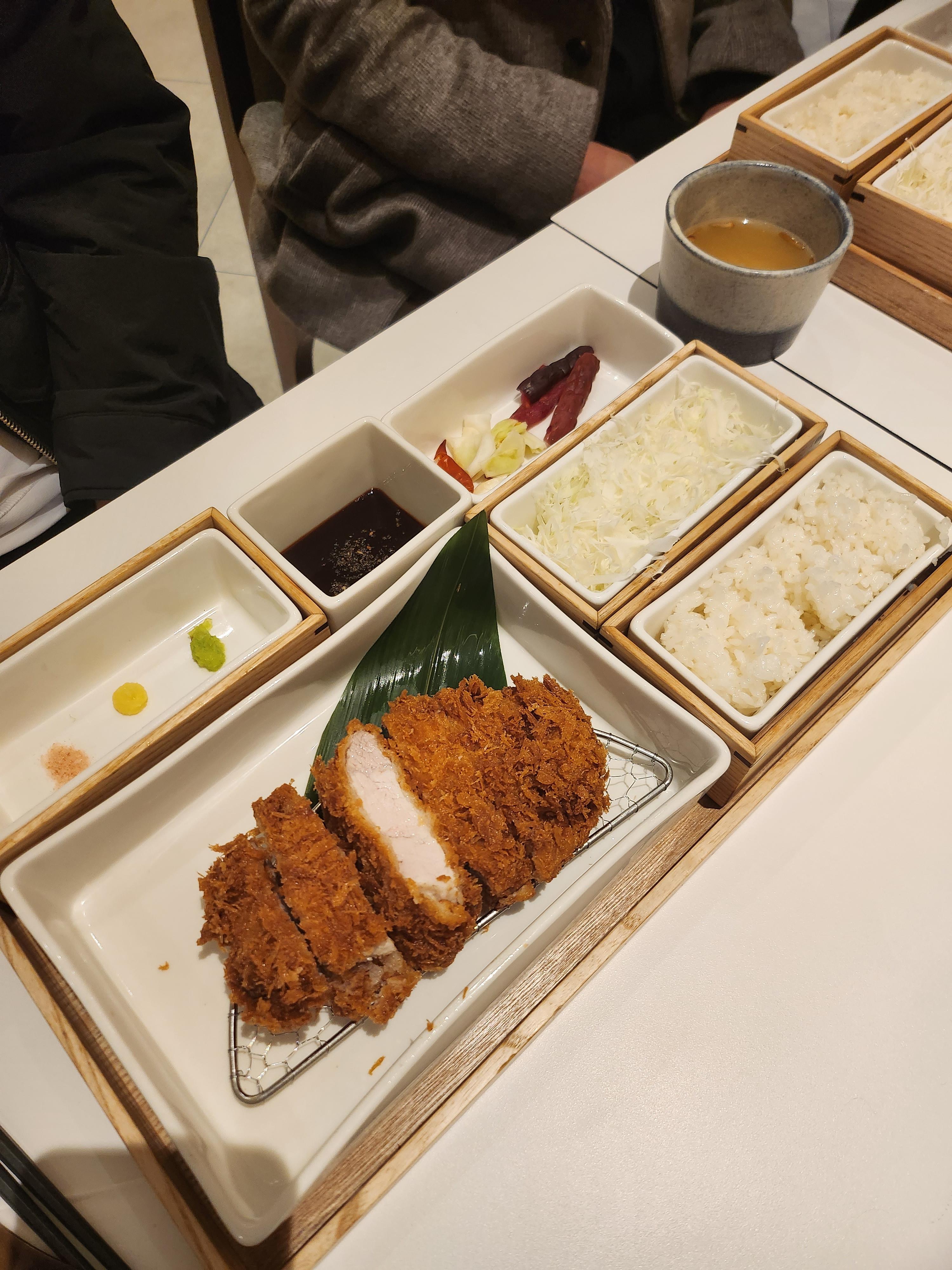 잇따라 서빙된 안심카츠. 사진으로만 봐도 육즙이 그득한 게 딱 보이죠? 히바린으로 입장할 때 좌측 월을 보면 편백나무 관련된 영상이 쭉 나오는데, 트레이에 담긴 나무 케이스도 모두 편백인지 아닌지 잠깐 고민. 함께 식사하는 분들이 자취러가 많아서 이렇게 직각으로 된 그릇은 설거지가 하기가 힘들다로 대화를 마무리하고 본격적으로 먹을 준비 시작.