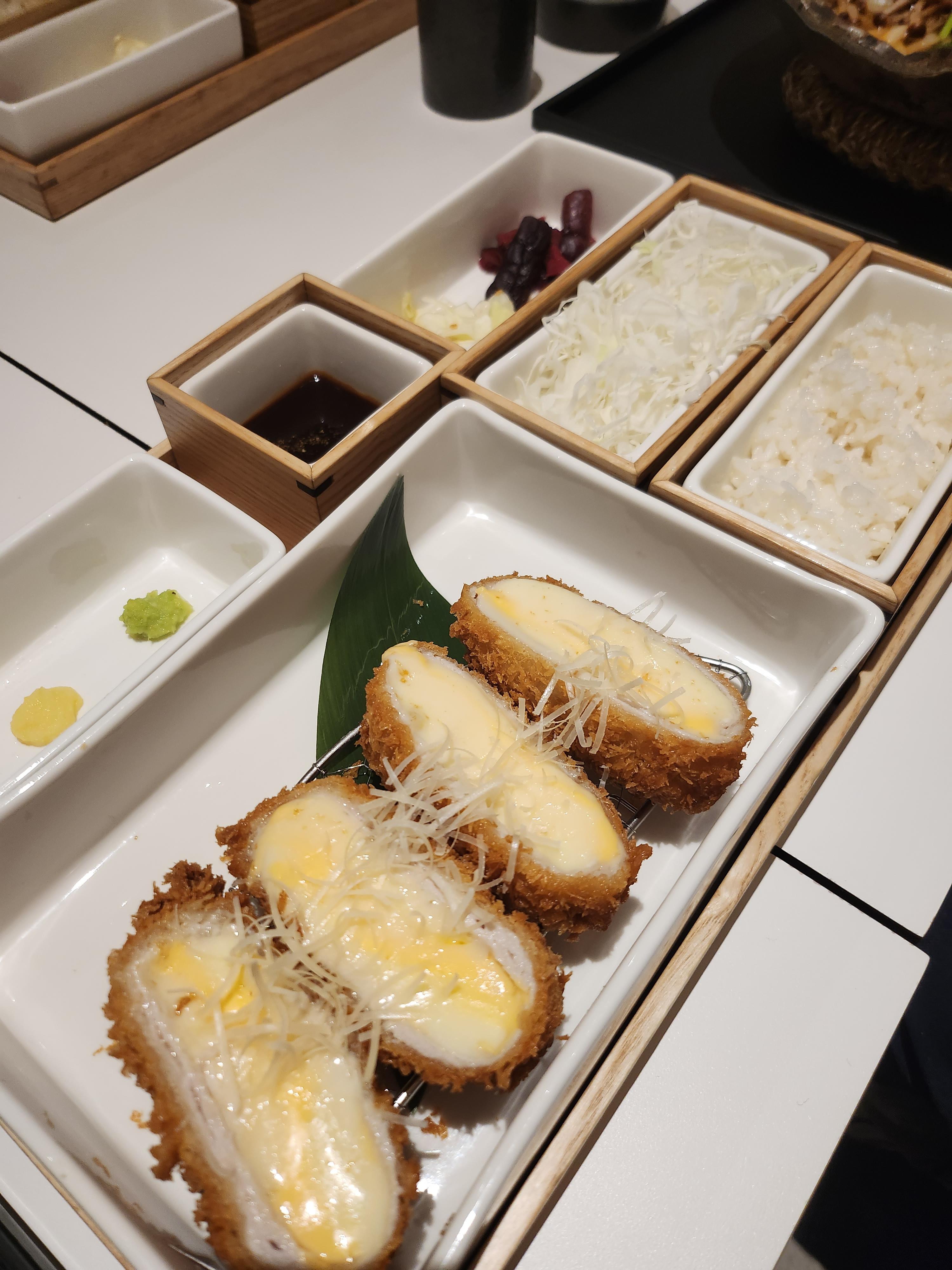 연이어 등심카츠와 트리플치즈카츠도 서빙되었습니다. '반상'이라는 네이밍이 포함된 게 아니면 주로 하얗고 말끔한 규격 오차 -0.5cm의 트레이에 각맞춰 나오네요. 그래서인지 바삭한 튀김과 촉촉한 육즙이 생생하게 살아보이는 장점이 있어요. 와사비, 히말라야, 레몬 소금 3종이 카츠류에는 함께 나옵니다. 적당히 바꿔서 곁들여 먹으면 더 맛있겠죠?