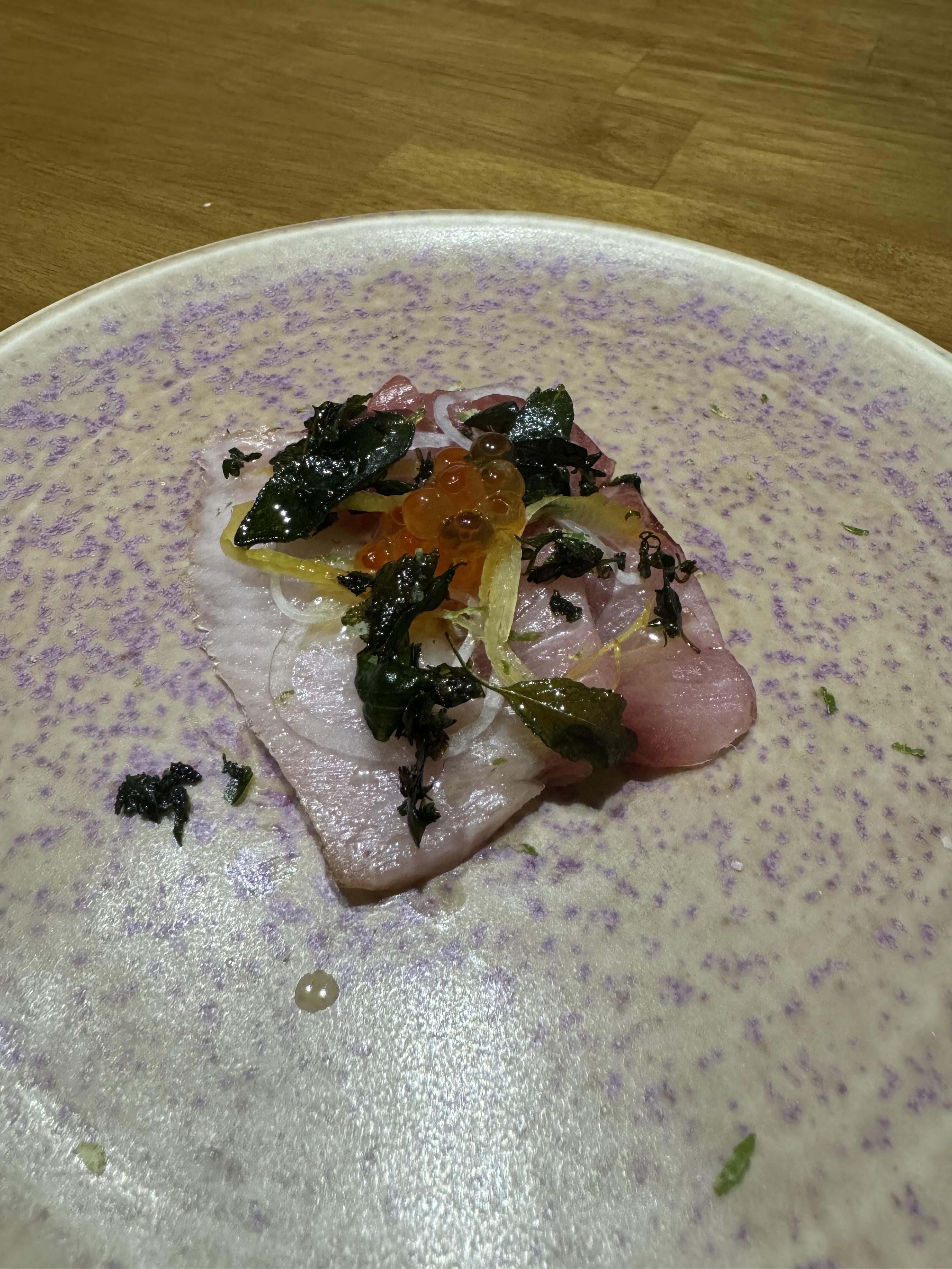 두 번째. 부라타와 토마토가 나올 차례였는데 제철 음식으로 변경되었다네요. 이 겨울, 온갖 애주가와 해산물 애호가를 울리는 그 이름! 방어! 마침 방어가 제철이라 신선한 원재료로 손질한 방어 카르파치오가 나올 예정이라는 점과, 혹시 날 것을 못먹는지 먼저 물어봐주셨다네요. 방어에 연어알, 청귤 슬라이스, 오일 등이 올라가 바다의 맛과 향이 듬뿍 나면서도 비리지는 않았대요. 상큼한 맛이 식전 애피타이저로 제격이었다는 후문. 입맛을 확실하게 돋궈줘서 다음 메뉴가 두근두근 기대되는 중.