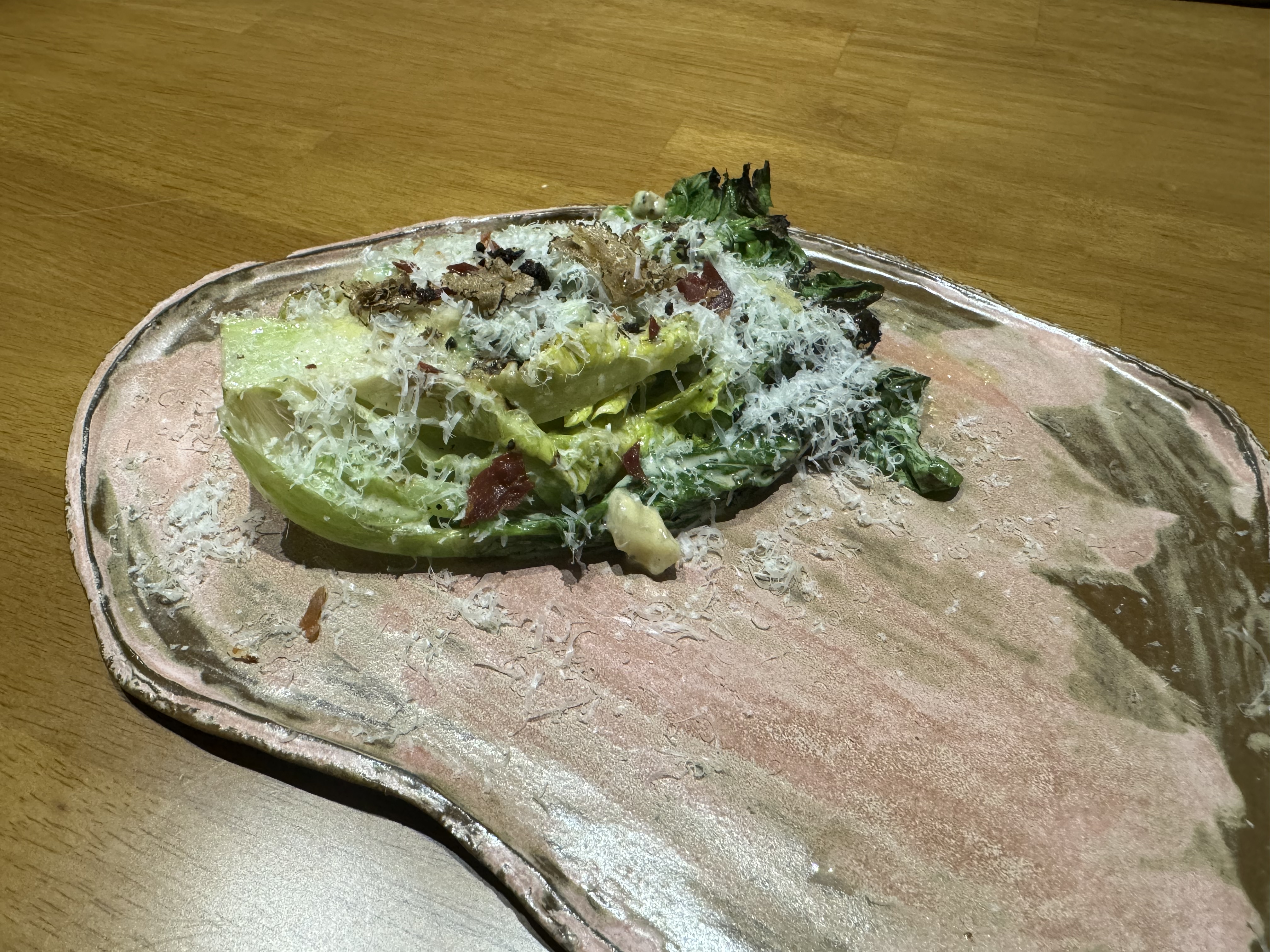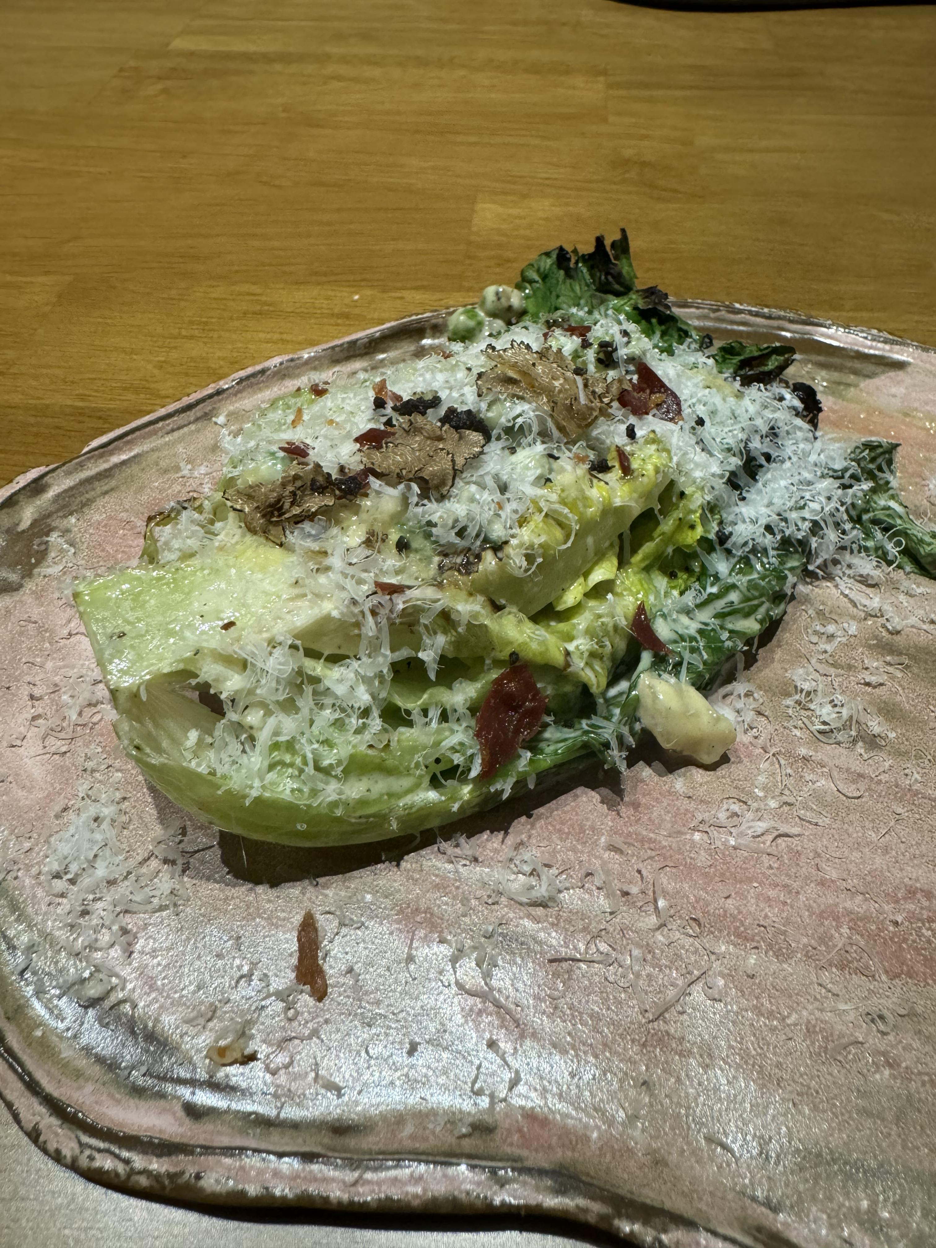 줄기는 아삭, 잎은 연한 로메인을 살짝 굽고 완두콩을 갈아서 만든 시저 소스를 얹어 만든 그릴 시저 샐러드가 나왔습니다. 베이컨과 두 종류의 치즈를 갈아 올리고, 덩달아 얇게 갈아낸 트러플도 올리고, 가루를 낸 포르치니 버섯, 트러플 오일이 마리네이드되어 풍부한 맛을 경험할 수 있었다고 합니다. 사실, CS팀은 트러플을 별로 좋아하지 않았는데 향이 전혀 역하지 않고 은은해서 싹싹 긁어 먹었대요. 후기를 들으니 직접 한번 먹고 보고 싶은 마음이 생기네요!