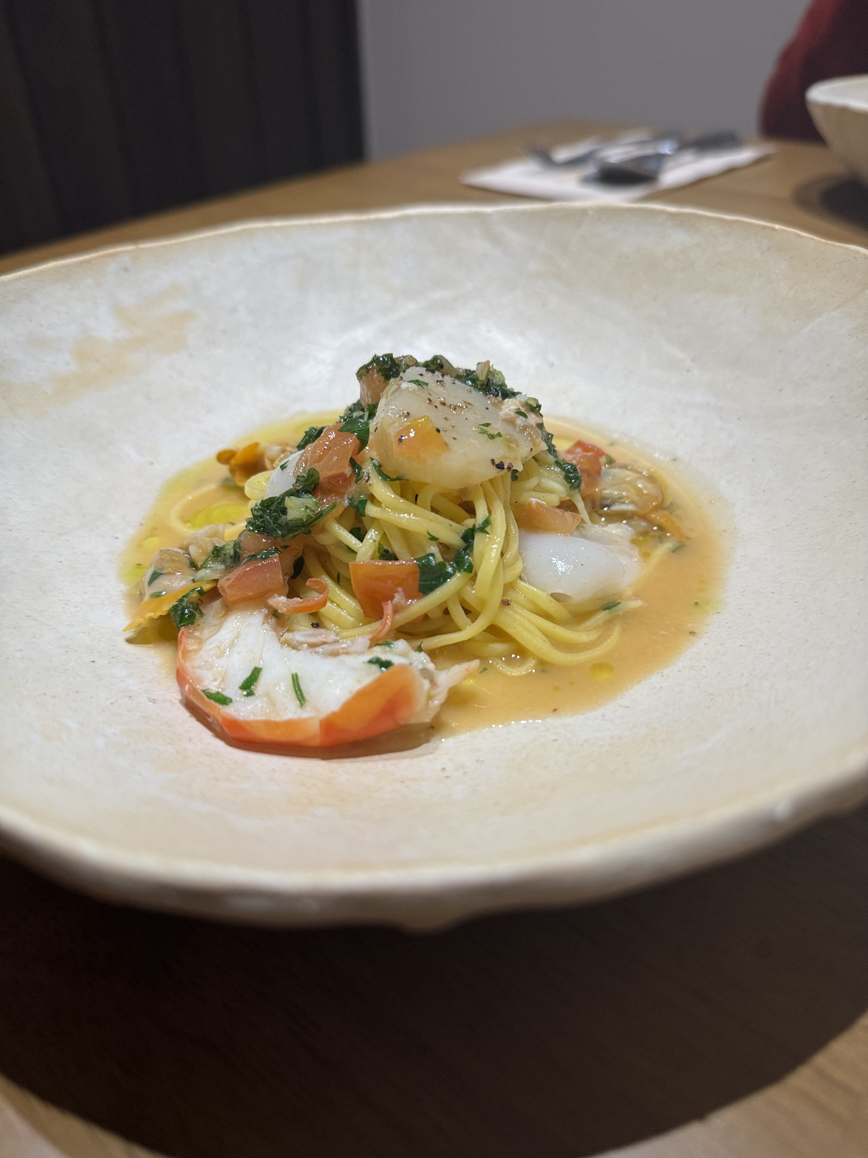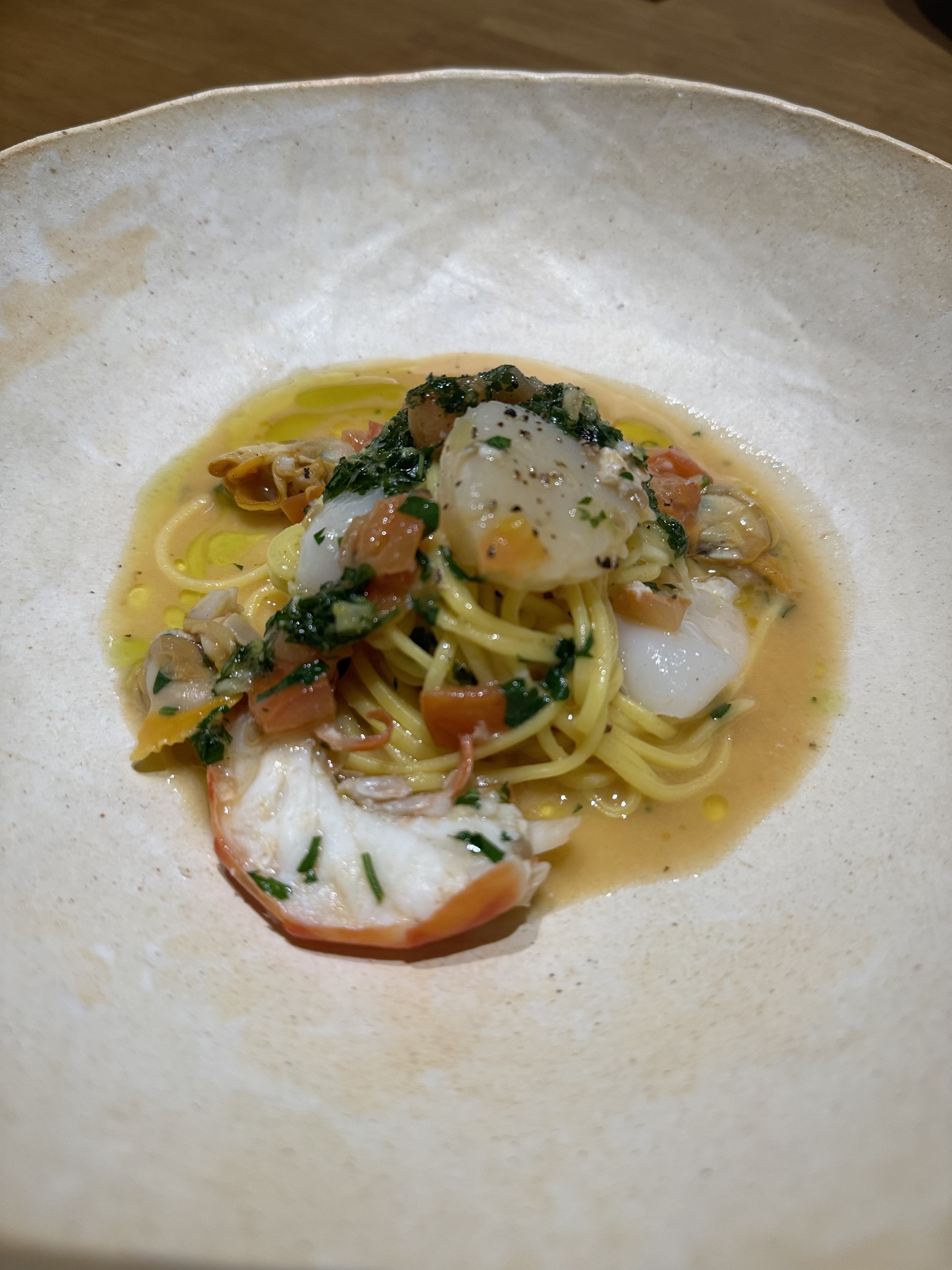 세 번째 메뉴. 오늘의 파스타로 스콜리오 파스타가 나왔습니다. 계란으로 만든 생면에 해감 잘 된 조개와 야들야들한 관자, 질기지 않은 오징어와 새우가 들어간 오일 파스타래요. 간간히 조각처럼 들어간 토마토가 각종 재료들과 잘 어울려 입맛에 딱 맞았다네요. 이건 실제로 먹어봐야 해. 설명을 들으면 들을수록 먹고 싶잖아. 플레이팅도 고급지다 고급져.