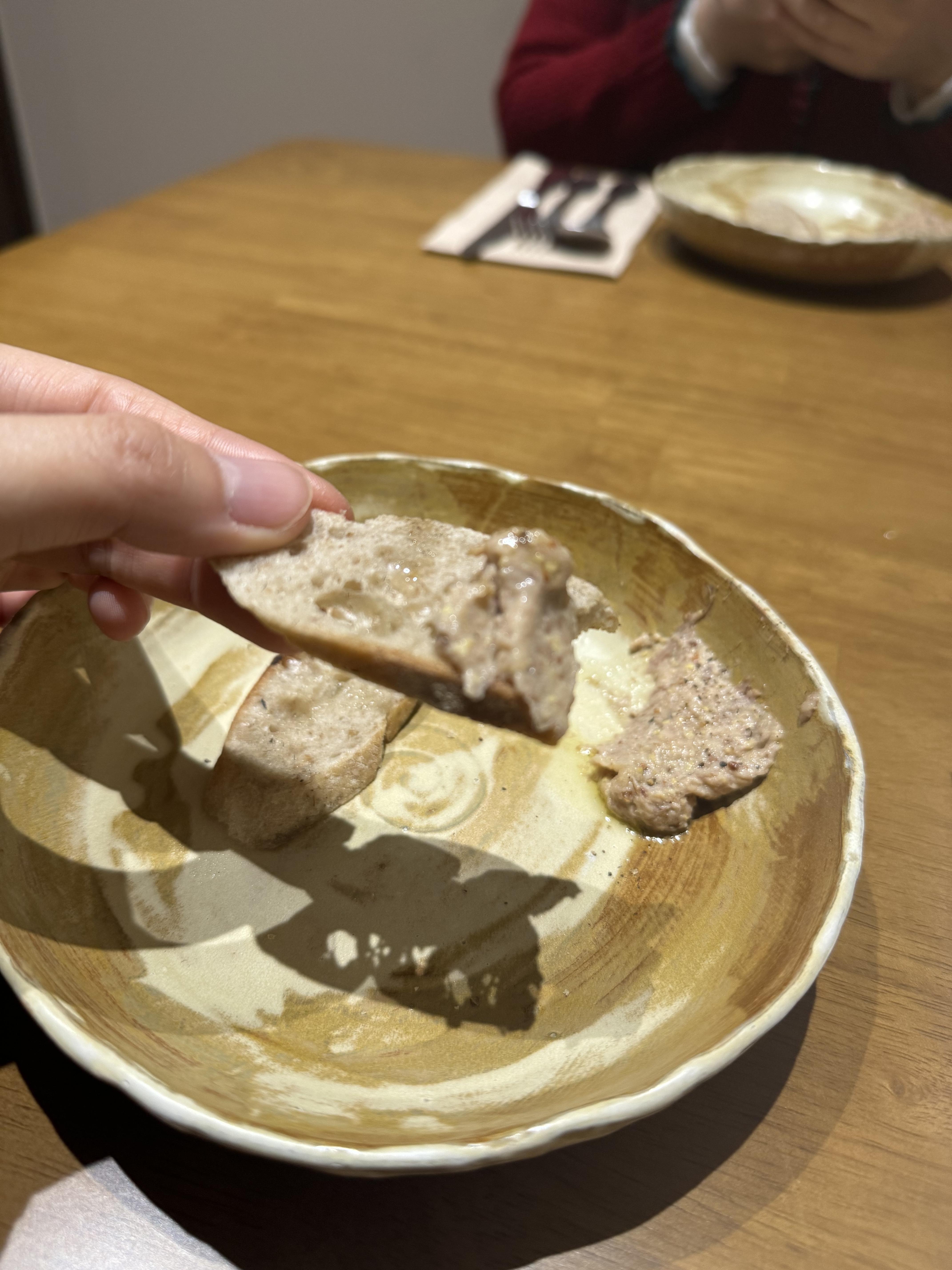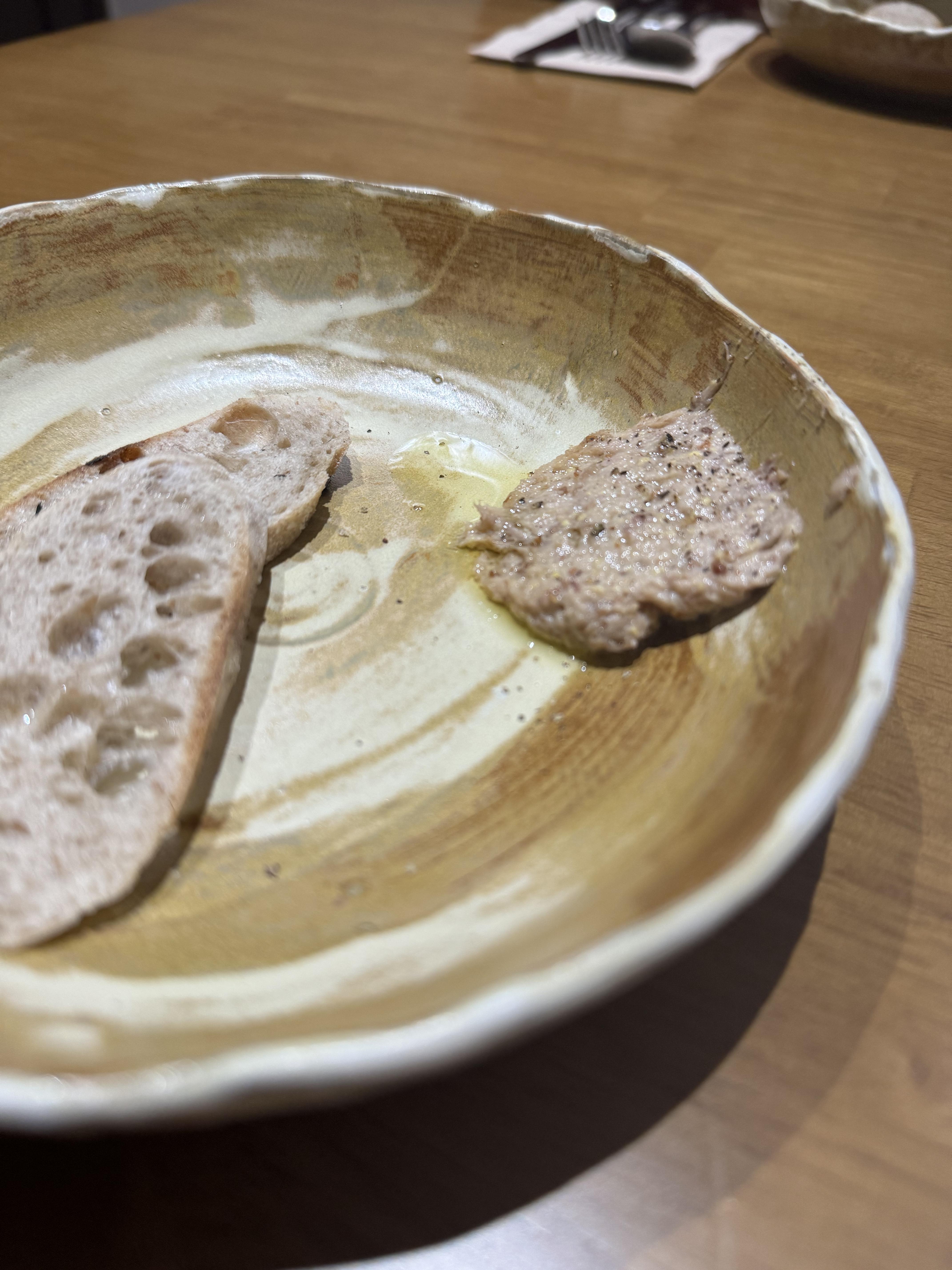 첫 번째. 빵과 곁들임이 나왔습니다. 신선한 올리브 오일과 숯향을 곁들인 빵의 조화. 짚불에 살짝 구운 빵과 오리 미에뜨가 함께 나왔습니다. 겉바속촉으로 구워진 빵은 얇게 슬라이스되어 후추향이 듬뿍 나는 부드러운 미에뜨를 얹어 먹으면 입에서 살살 녹는 카나페의 느낌, 그대로라고 합니다.
