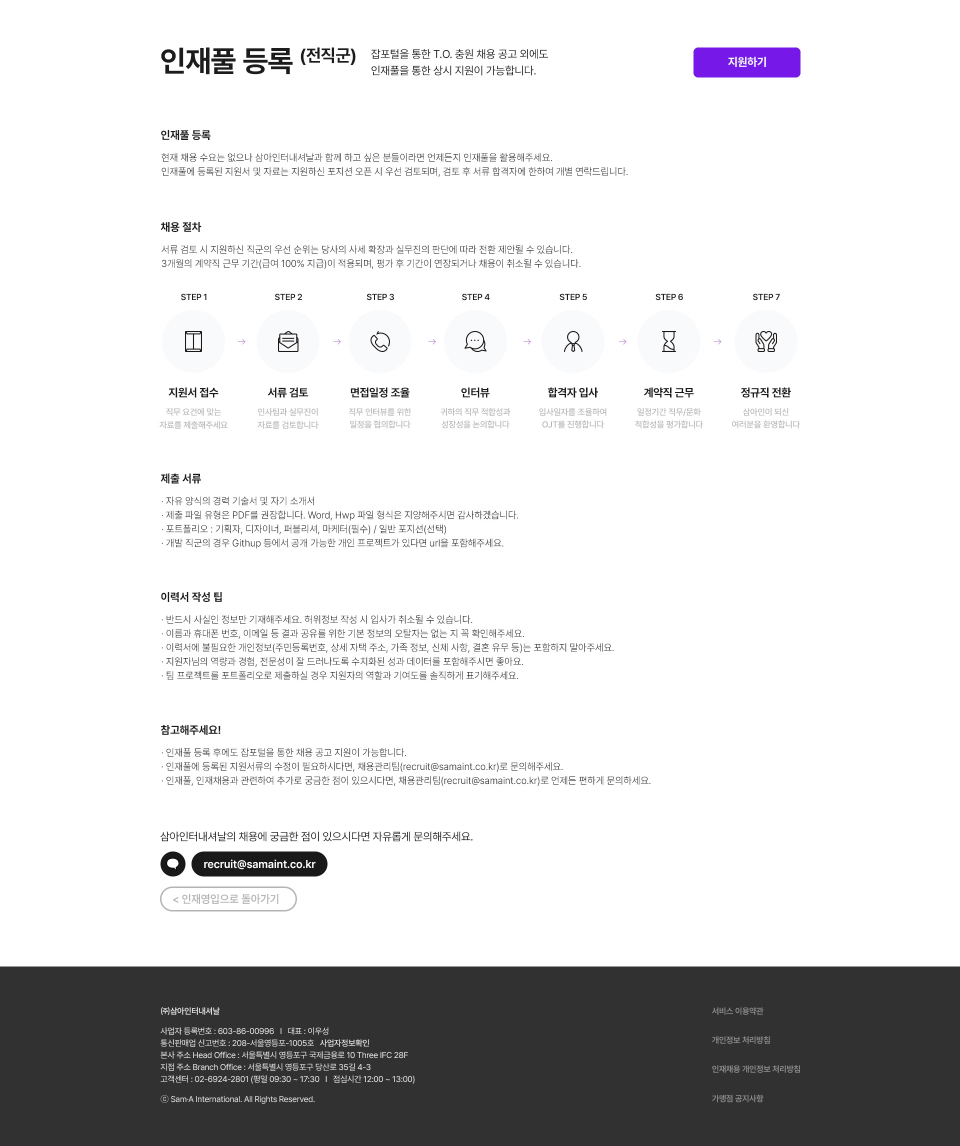 솔직히 말씀드리겠습니다. 지난 버전에서는 시간에 쫓겨 <회사소개>에 인재상을 포함해 경계가 희미했습니다. 다음 리뉴얼의 기회가 저에게 온다면, 반드시 이 구간을 명확하게 분리하리라 다짐했었죠. 그리고 ver.2024버전에서는 T.O.가 발생했을 때에 이용하는 잡포털에서 벗어나, 저희와 함께 일해보고 싶은 분이라면 언제든지 노크를 두드려볼 수 있게끔 인재풀 기능을 추가했습니다. 이 인재풀은 개인정보보호법과 관리 법령 등 참고해야할 부분이 많아 가벼운 아이디어와는 달리 조금 애로를 겪기도 했는데요. 인사팀(Team.HR)과 IT개발팀(Team.R)의 도움으로 무난히 서비스 릴리즈에 성공했답니다. 다시 한 번, 도움주신 여러분들께 감사인사를 전합니다.