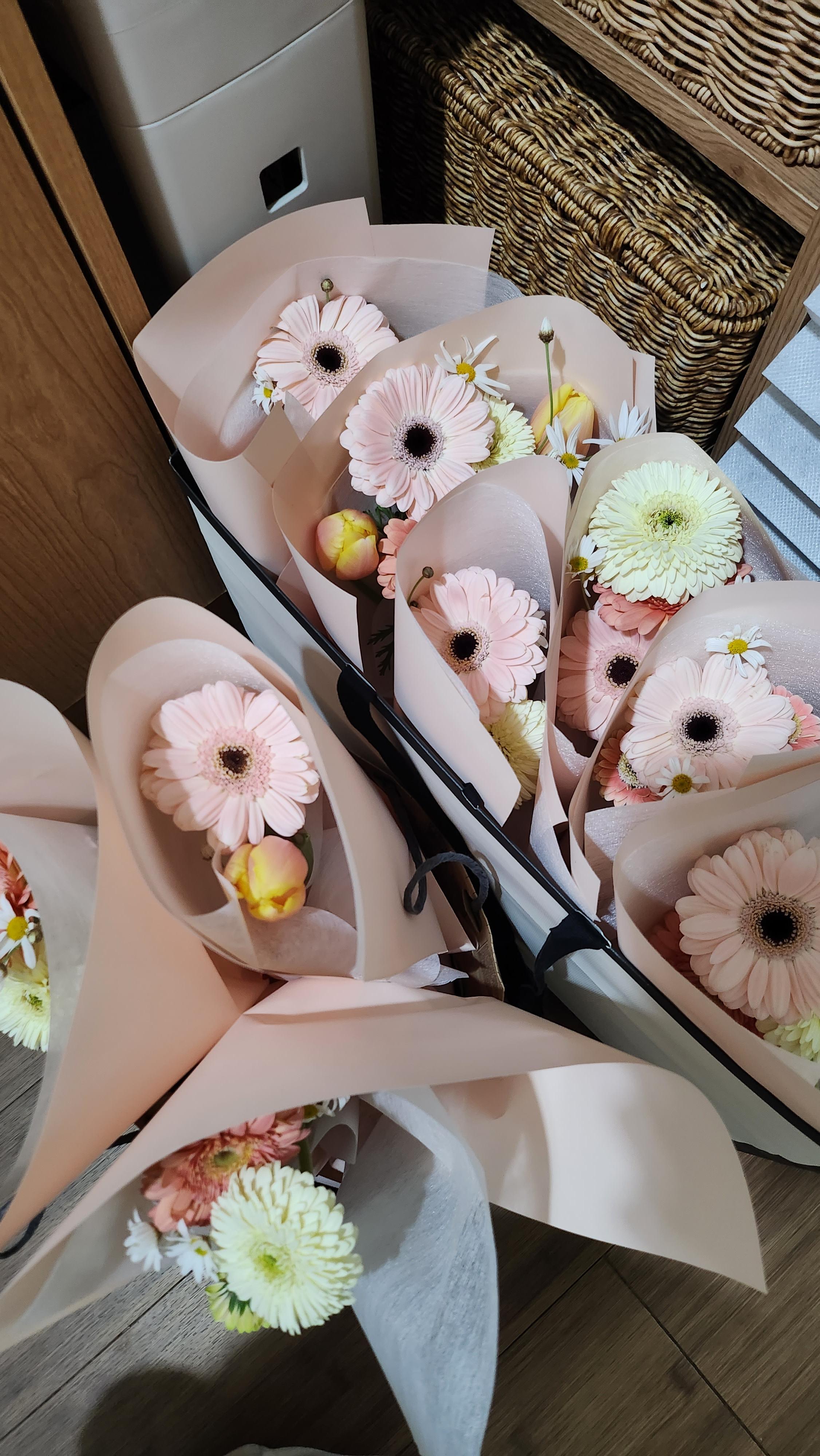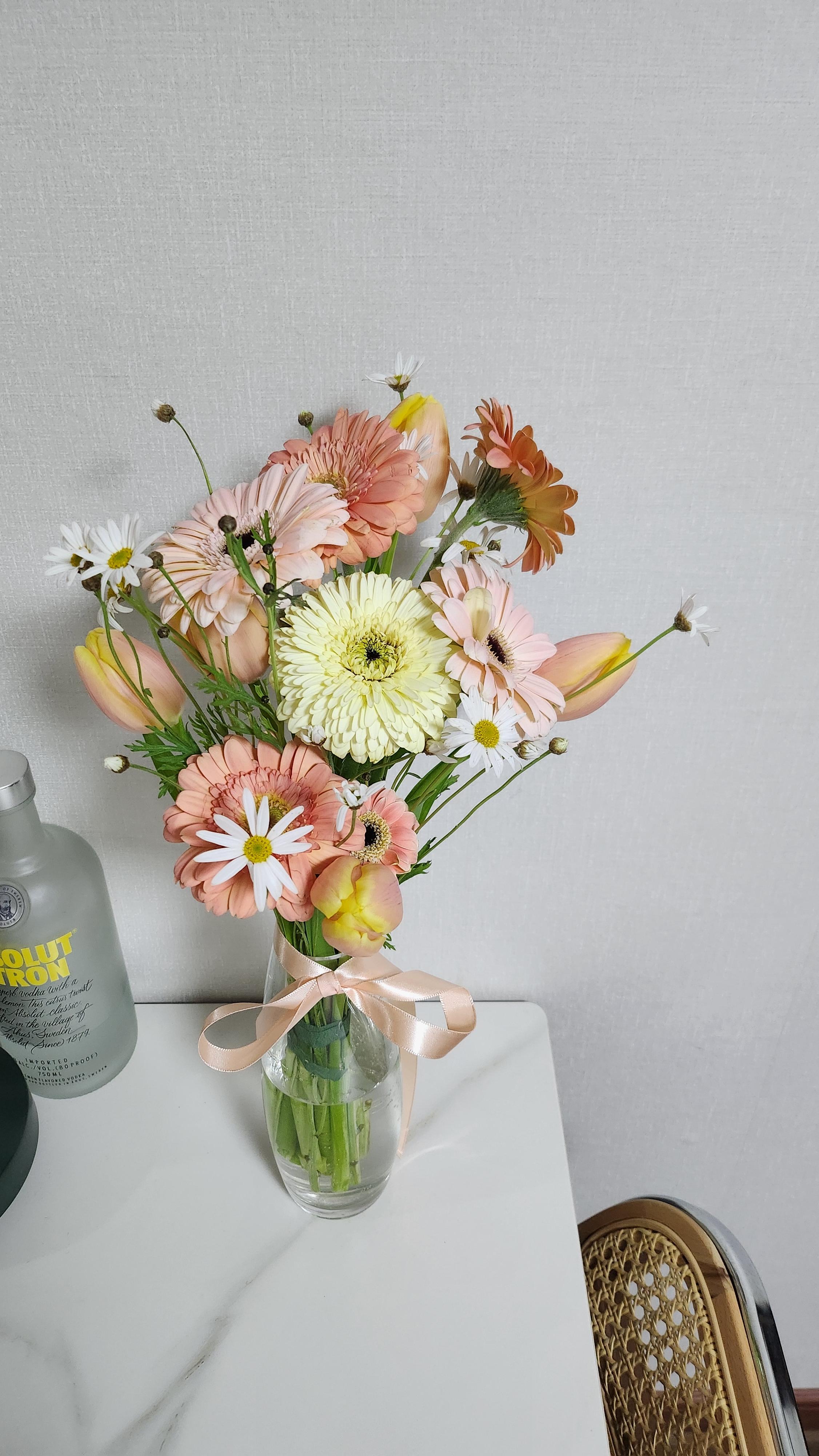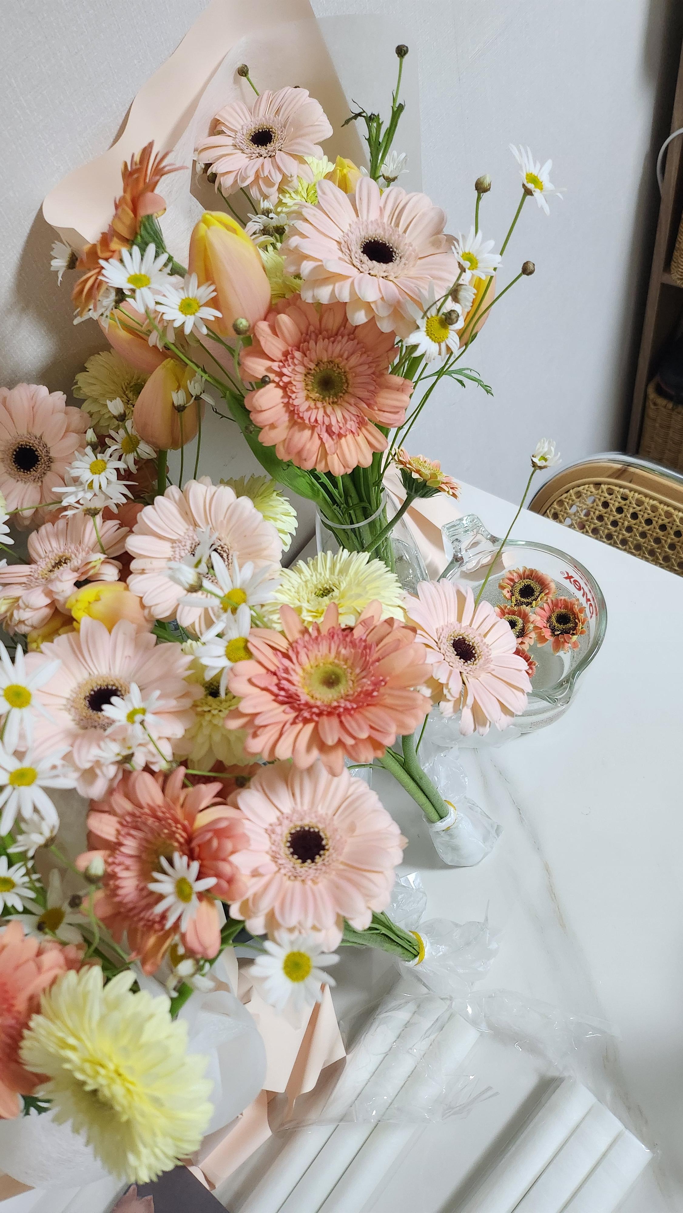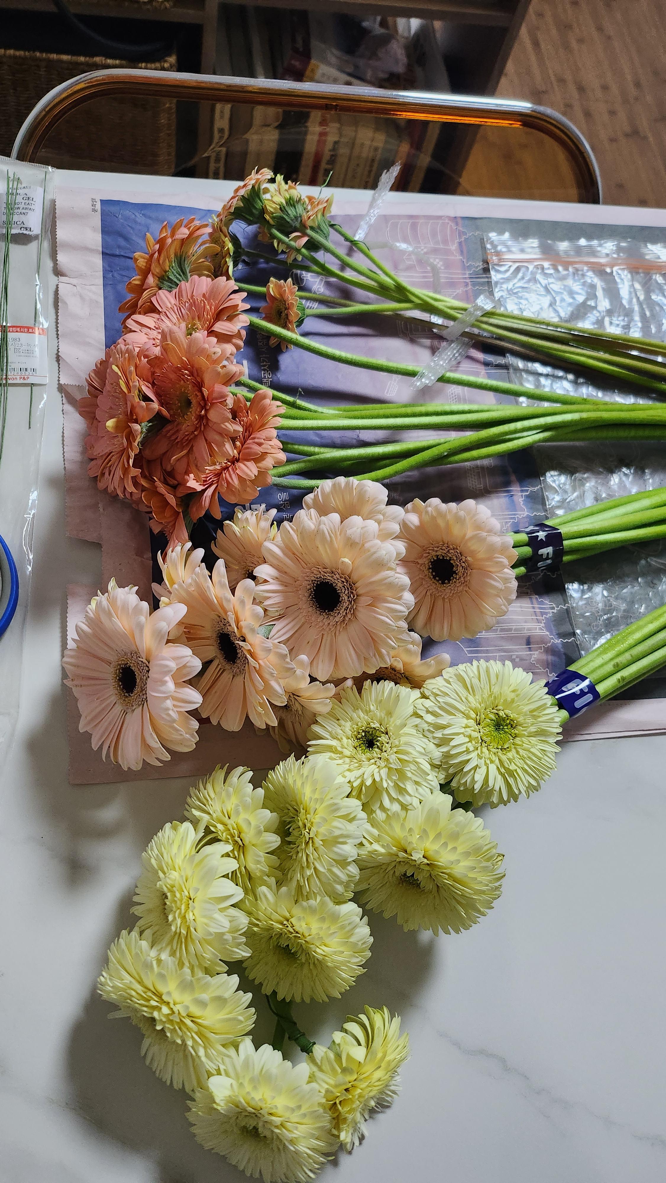제가 산 꽃이 어떤 종류인지 궁금하셨죠? 핑크&살구톤 거베라 3종, 연노랑 거베라, 마가렛, 망고튤립을 각 한단씩 구매했습니다. 일단, 꽃의 잎과 끝단을 정리하고 시원한 얼음물을 받아 물올림을 시작합니다. 여러분이 꽃집에서 구매했던 꽃들은 모두 제가 방금 방문한 꽃 도매시장에서 1차 구매되어 꽃집 사장님에 의해 물올림을 받은 상태라 꽃다발이 며칠동안 최상의 상태로 유지될 수 있는 거랍니다. 얼음물에는 식초 한두방울을 떨어뜨려 주거나 여름철일 땐 락스를 아주 약한 농도로 희석해주면 줄기에 남아있던 오염물과 균이 사라져서 꽃이 조금 더 싱싱할 수 있을 거예요.