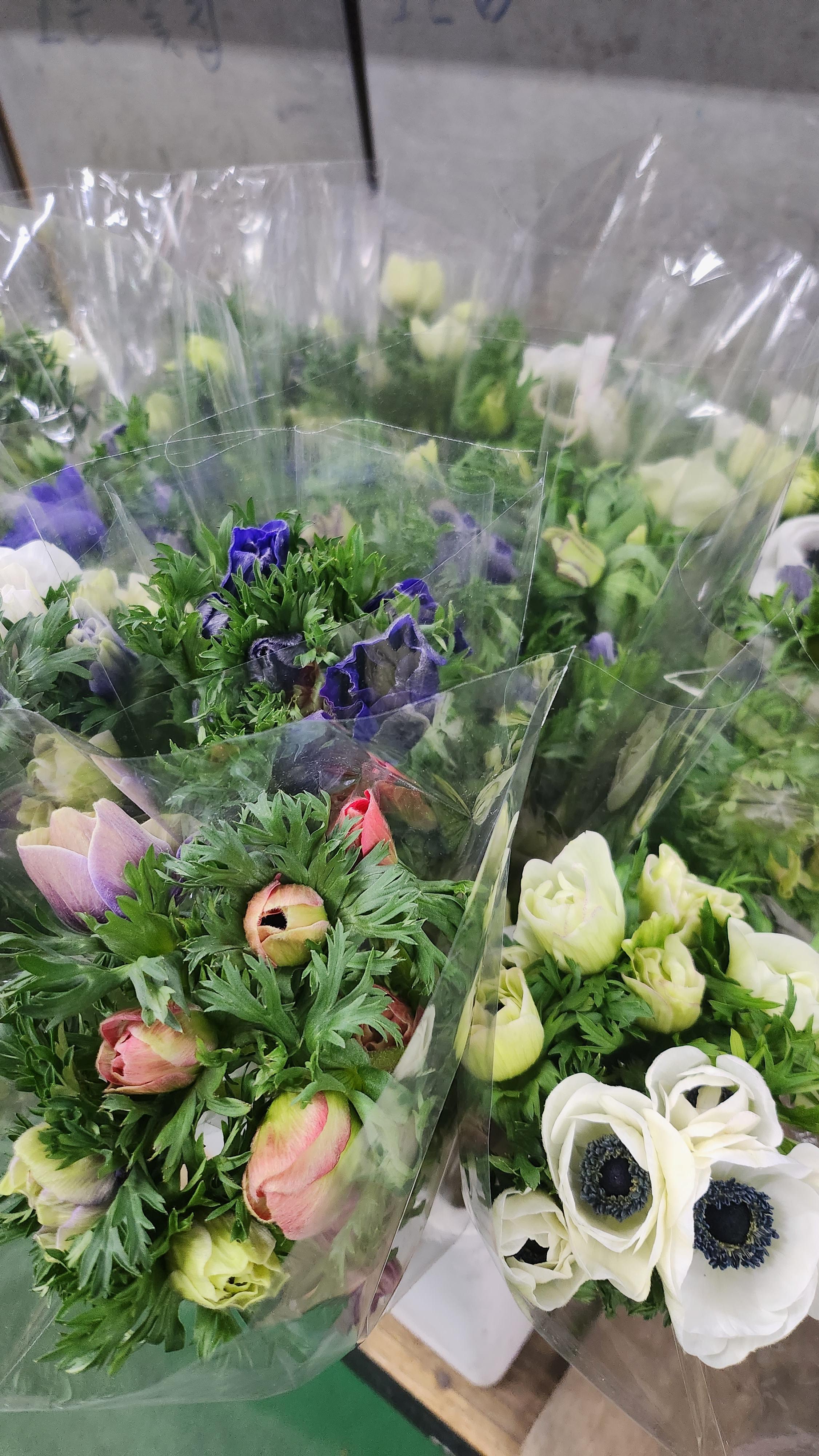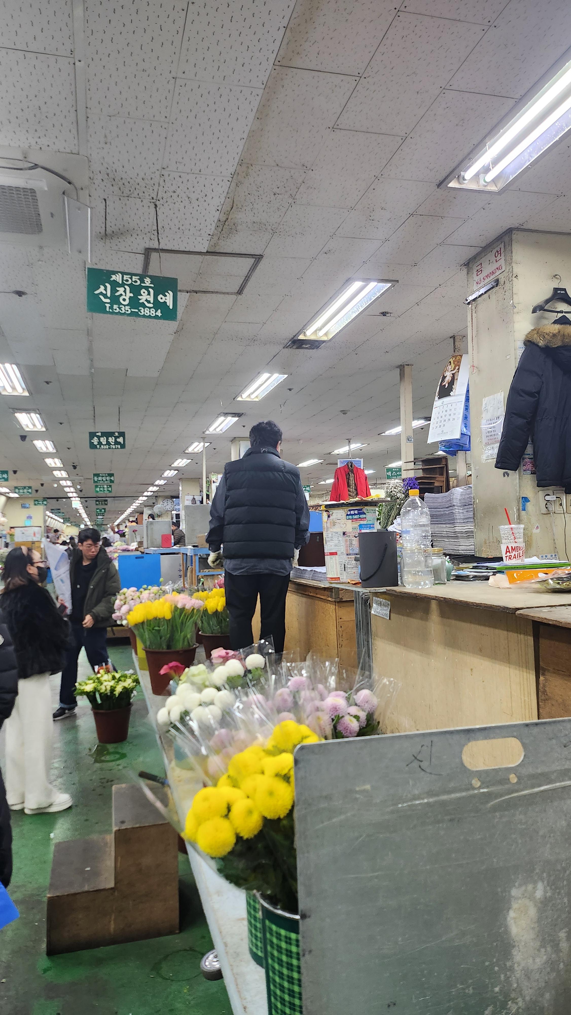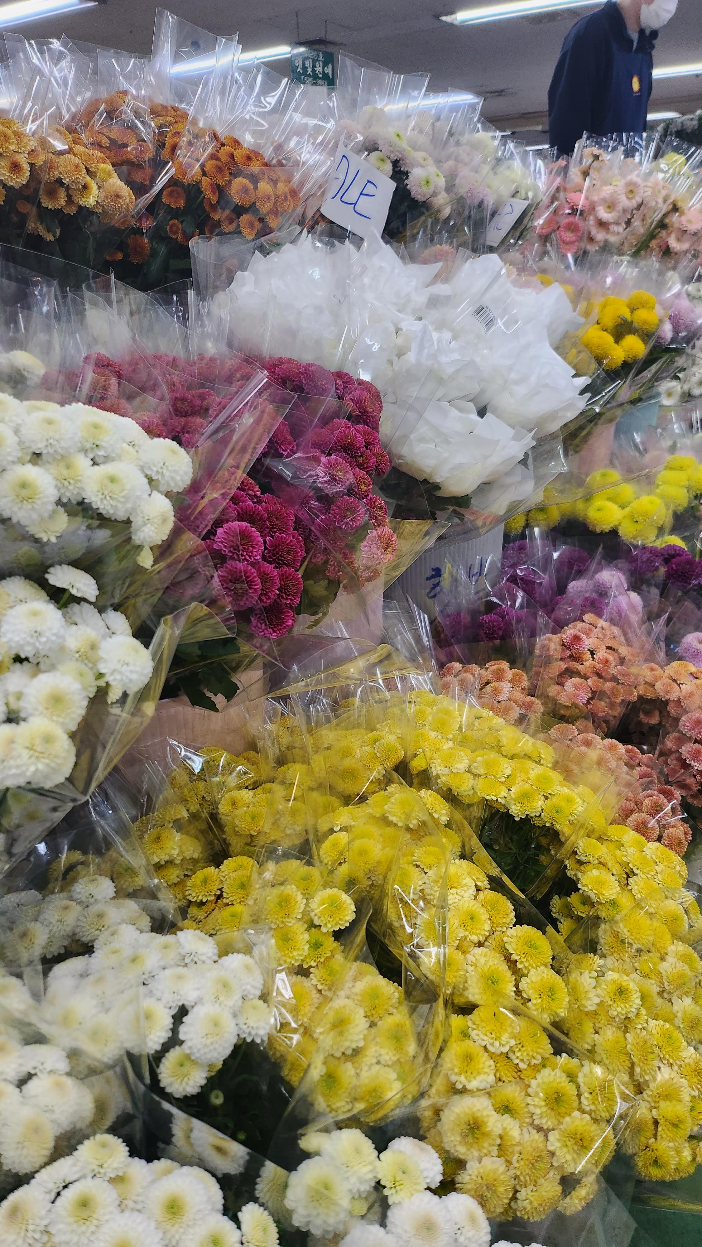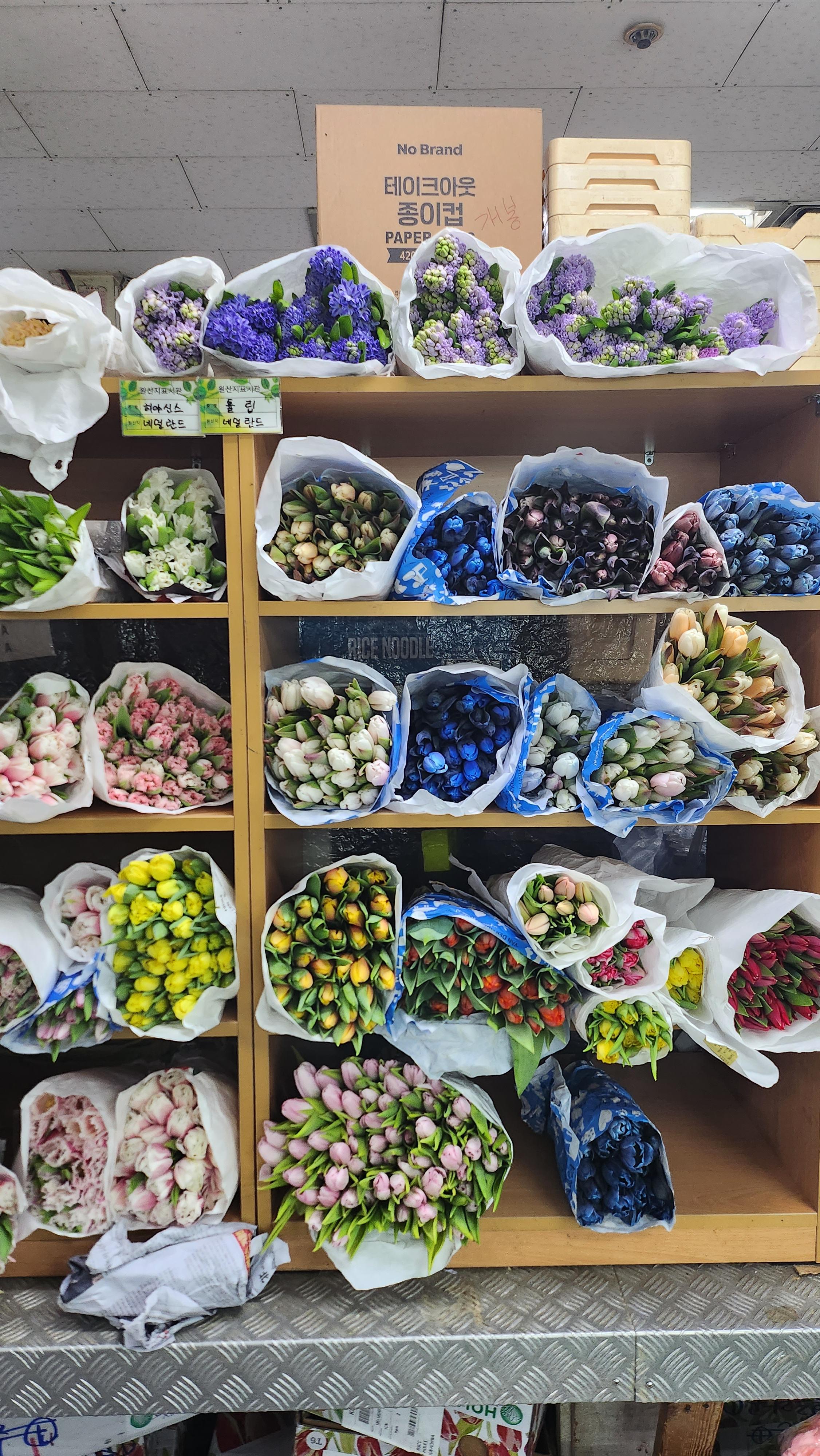 일단, 사려고 했던 꽃이 어느 정도의 금액대로 판매되고 있는지 알아보기 위해 한바퀴를 쭉 돌았습니다. 역시나 예상하지 않았지만 마음을 홀리는 꽃들이 많았습니다. 어떤 꽃을 사야할지, 어떤 색상으로 꽃다발을 완성할지, 계획해두지 않았다면 저는 충동구매로 산 꽃들을 다 가지고 돌아오지도 못했을 거란 생각이 번뜩. 도매상이 빠지고 난 후는 복도도 조금 한산한 편이고, 저처럼 목소리 작은 사람이 '사장님, 망고튤립 한 단 주세요'라고 얘기해도 알아들을 수 있는 정도가 됩니다. 하지만 점포 문 닫을 준비를 하는 사장님들이 끌차를 끌거나 바닥 청소를 하고 있는 곳이 더러 있기 때문에, 조심해야하는 건 매 한가지.