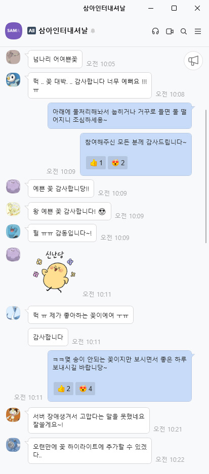 모든 임직원을 위한 선물을 마련할 수 있었다면 좋았겠지만, 개인의 여력을 빌려 진행한 이벤트인지라 소규모 인원에게만 당첨 기회가 갈 수 밖에 없었던 점을 모두가 이해해주리라 생각합니다. 꽃은 뿌리와 줄기, 잎사귀 중에서도 가장 연약합니다. 진화를 했다면 골백번은 더 튼튼하게 진화했을텐데 참 이상하죠? 번식을 위해 가장 아름다운 모습으로 피어나지만 사람의 손길 한 번에, 햇살 한 줌에, 정말 쉽게 짓무르고 생기를 잃어버리잖아요. 그래서 저는 꽃을 선물하는 사람도, 꽃을 받는 사람도, 꽃을 해치지 않기 위해 가장 조심스러운 행동을 취한다고 생각합니다. 그 순간이 중요한 게 아닐까 생각해요. 한 겨울 추위 속에서도 피어나는 꽃이 있다는 사실을 잊지 않고, 짧은 순간 꽃망울을 들여다보며 조금은 더 행복하셨으면 좋겠습니다.
