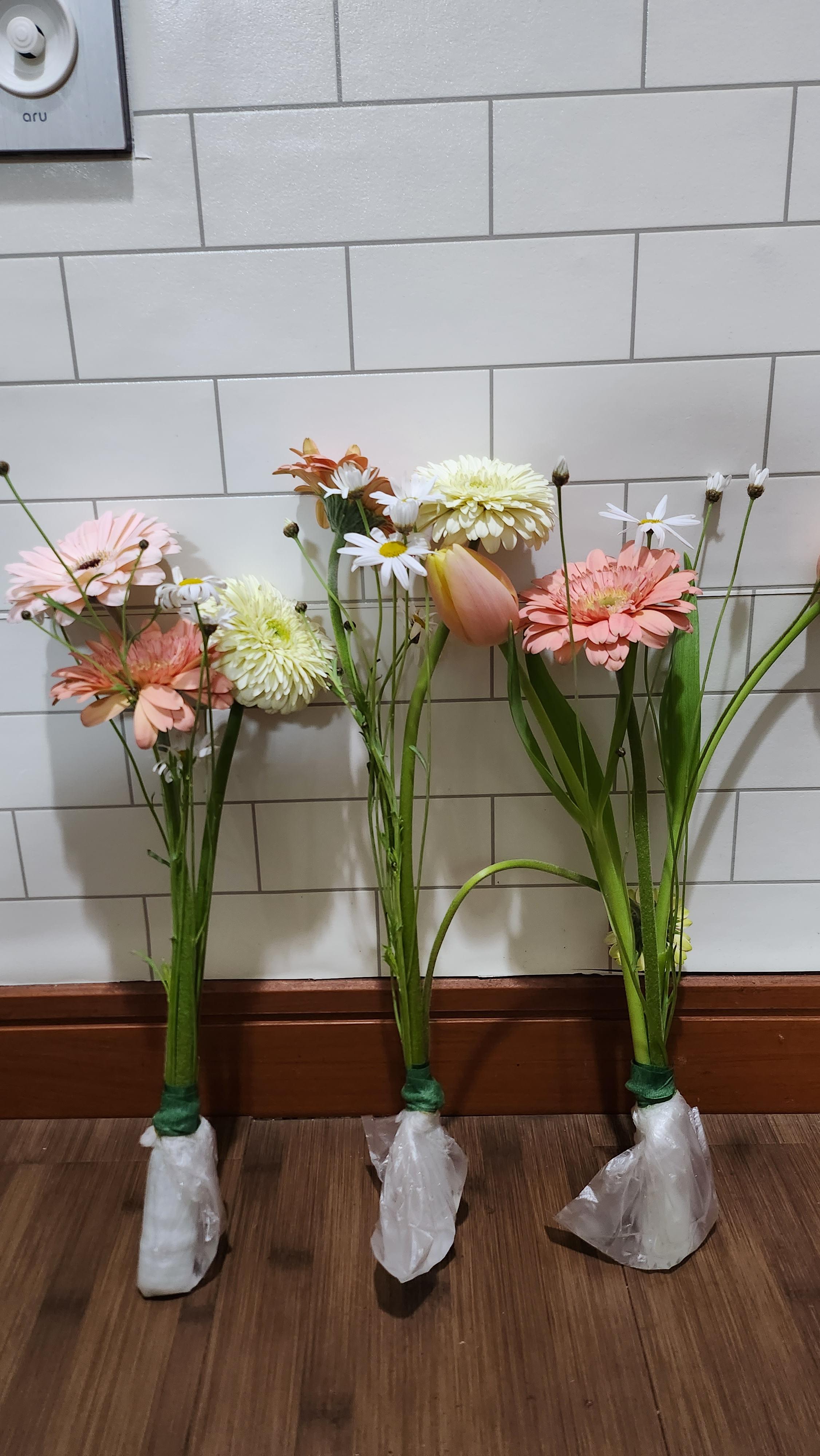 올망졸망 남은 꽃들로 미니 꽃다발을 만들기로 결정한 이후부터는 모양을 잡은 꽃들을 적당한 길이로 자르고, 물티슈를 감고 봉투를 만들어 씌워 물처리를 해줍니다. 묶어둔 끈이 불안정해서 꽃테이프로 한번 더 감아줬어요. 직선형으로 꽃다발을 만들고 나면 물처리를 하기가 용이해서 꽃다발을 만들고도 꽃이 바로 시들지 않아 좋습니다.