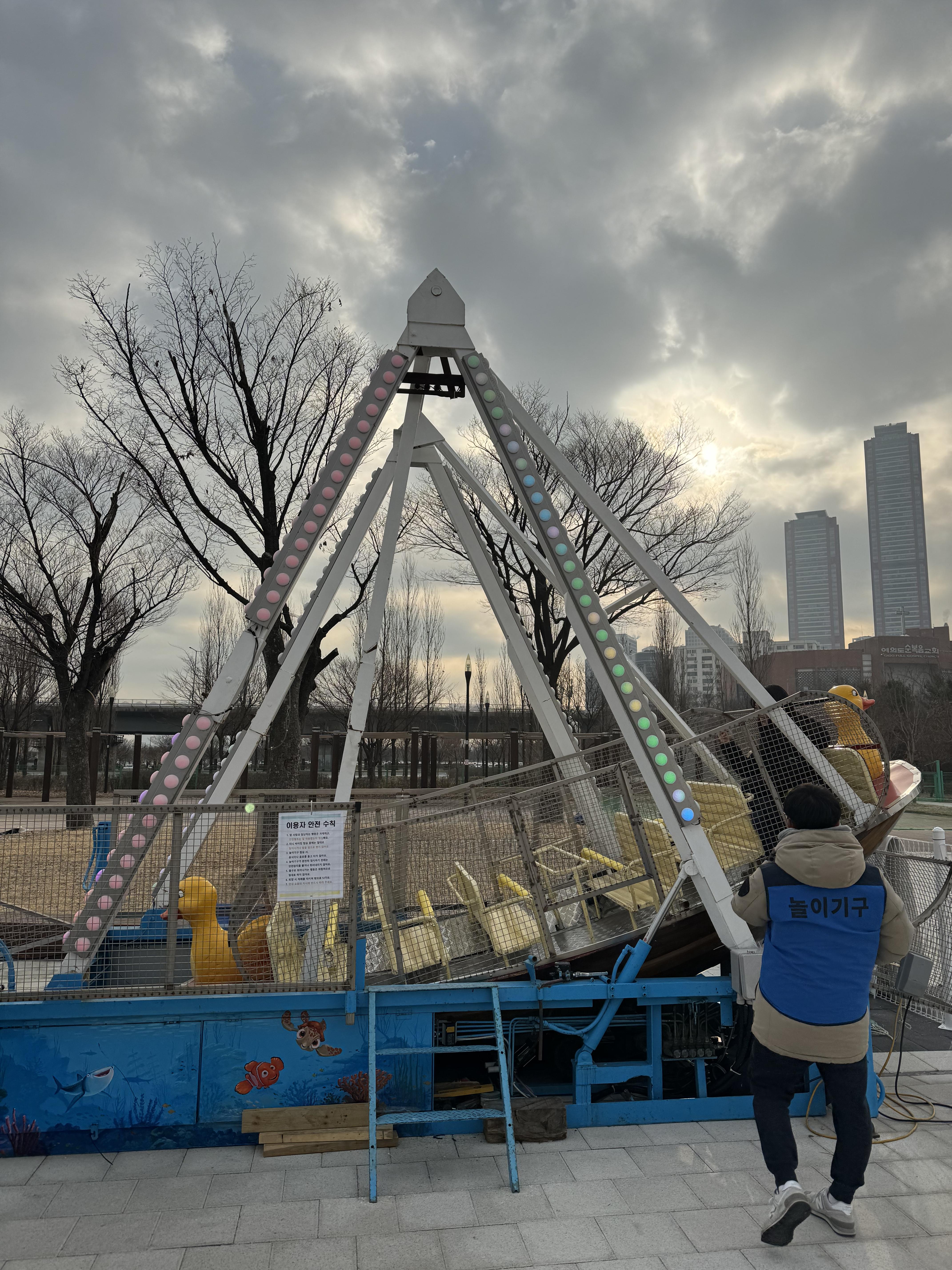 눈썰매장 안쪽 한 켠에는 미니 바이킹도 준비되어 있었는데요. 저희 팀 익명의 꼬부기님이 타고 있어서 우르르 몰려가 구경했습니다.