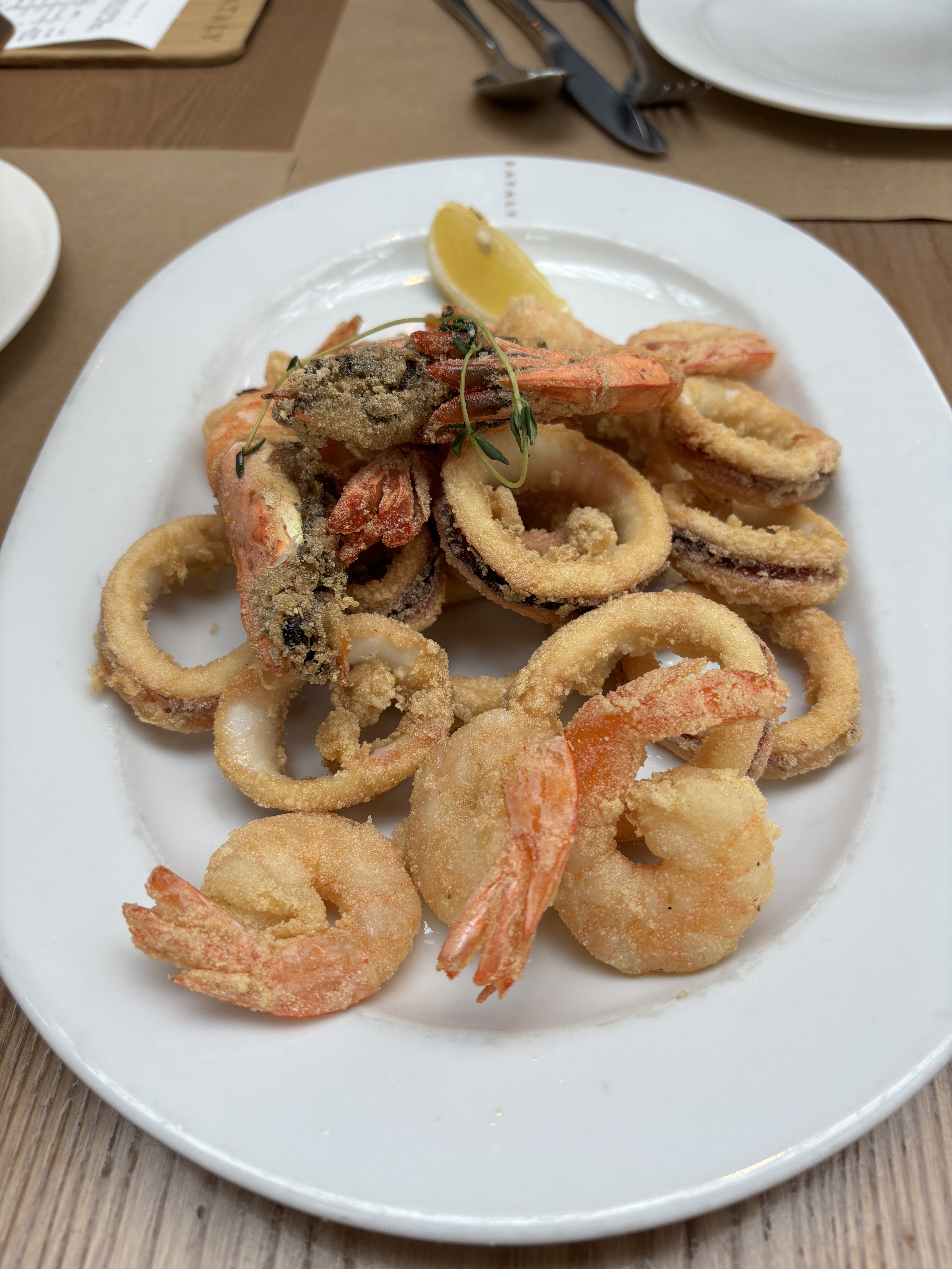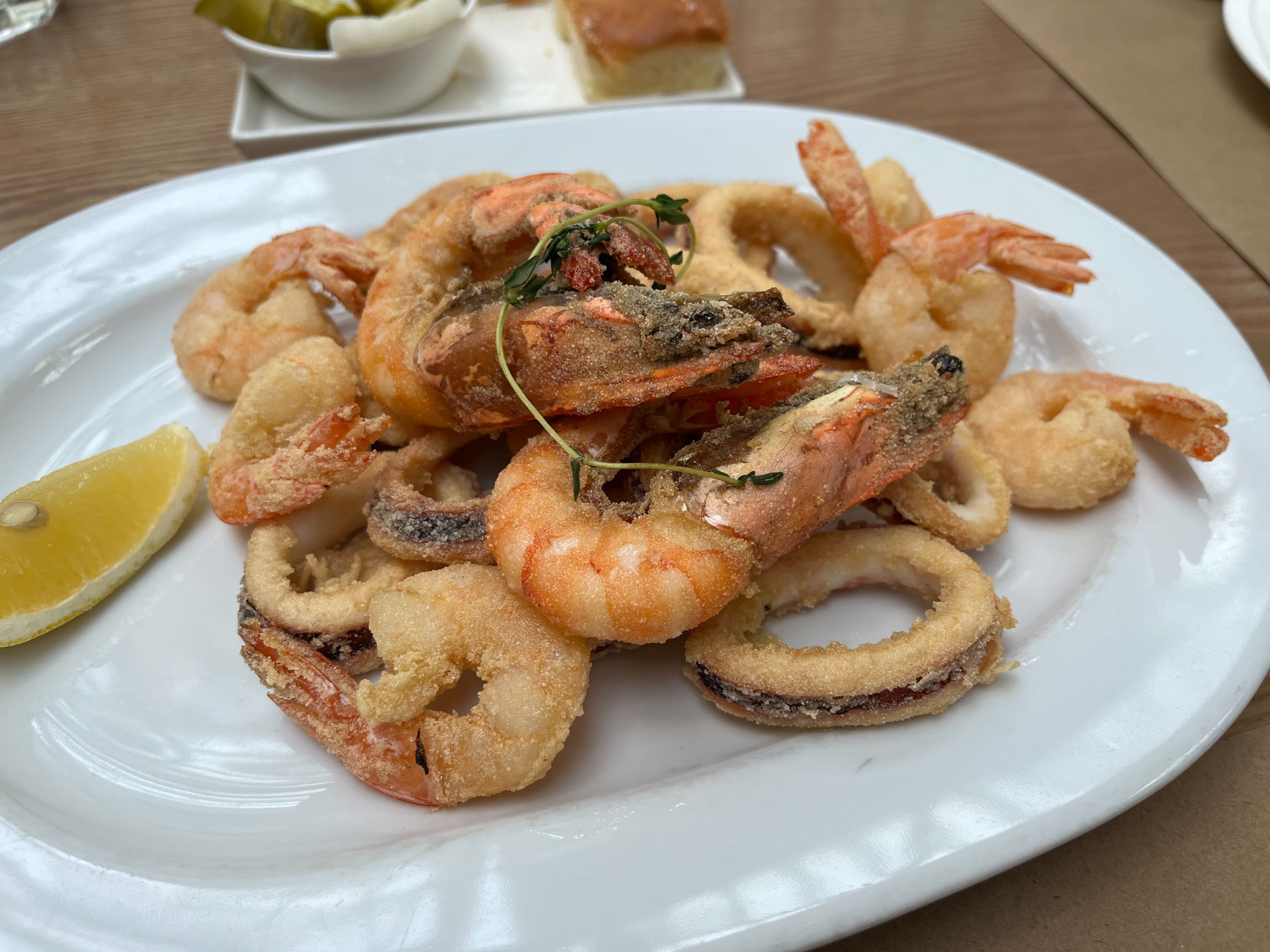 해산물 튀김(Gran Fritto di Mare)이 다음으로 나왔습니다. 새우와 오징어를 바삭하게 튀겨낸 애피타이저 메뉴인데요. 사진만 봐서는 그럴싸해서 짭쪼름한 해산물의 맛이 느껴지는데, 실제로는 간이 슴슴해 놀라운 맛이었다고 합니다.