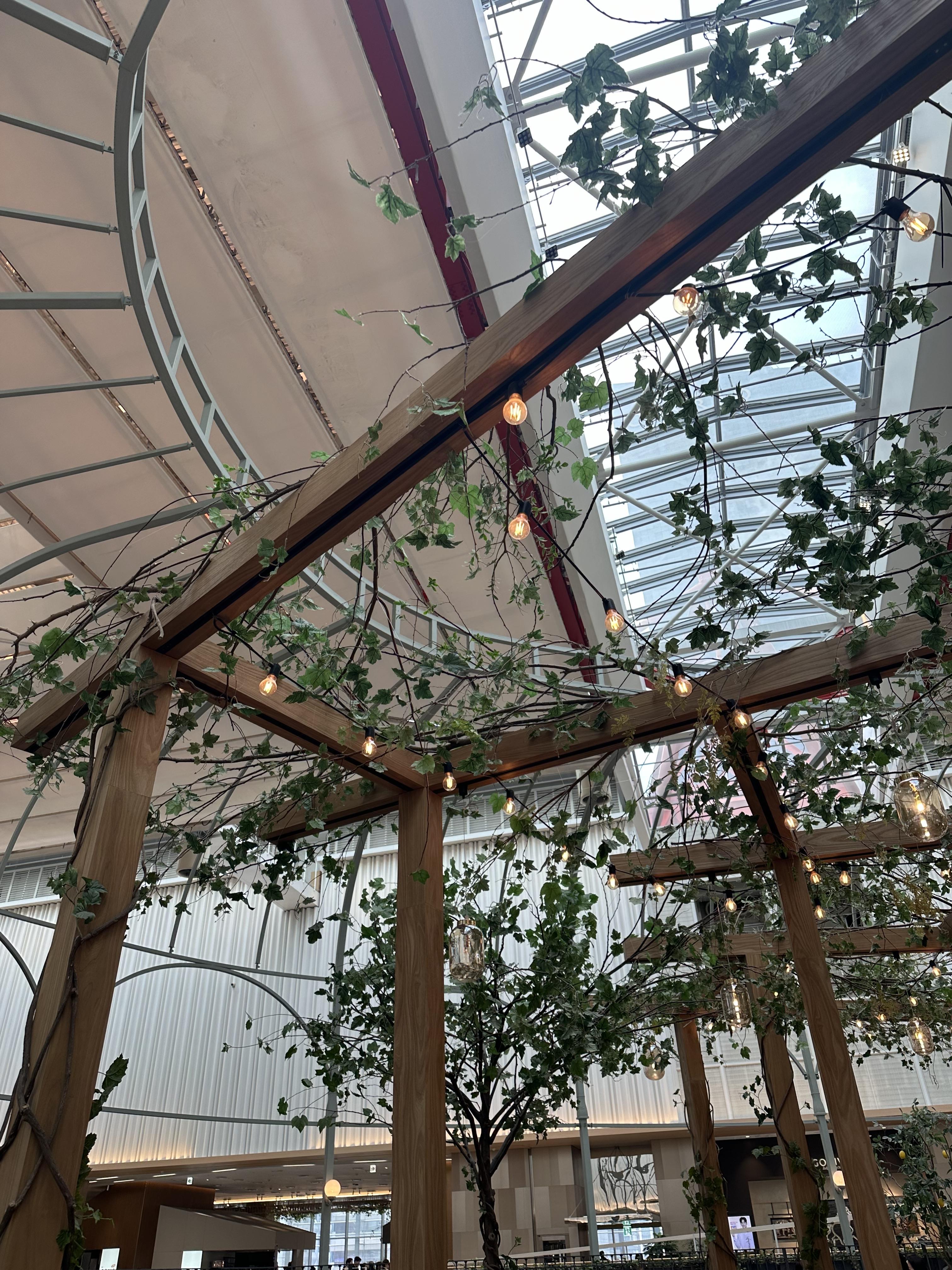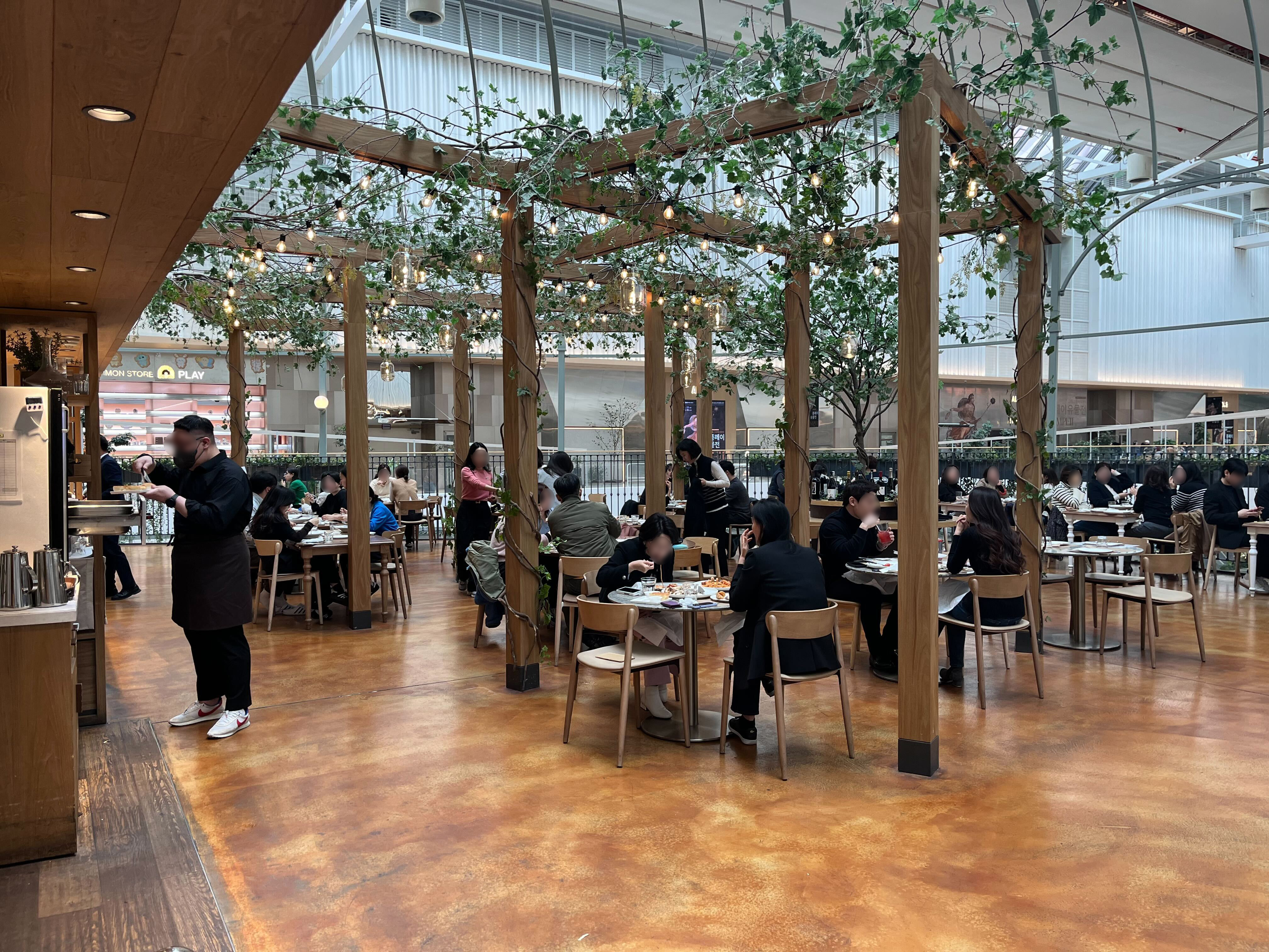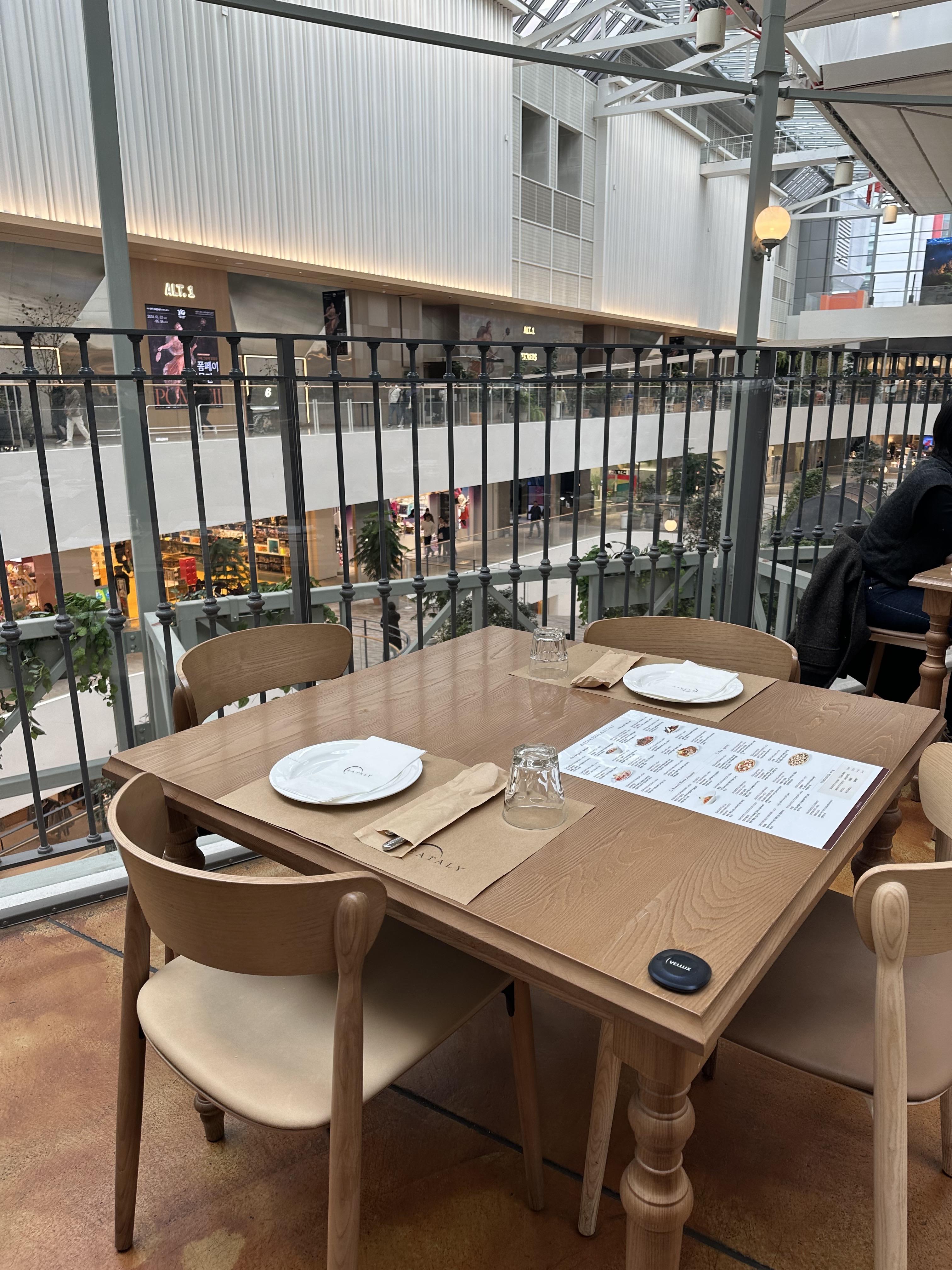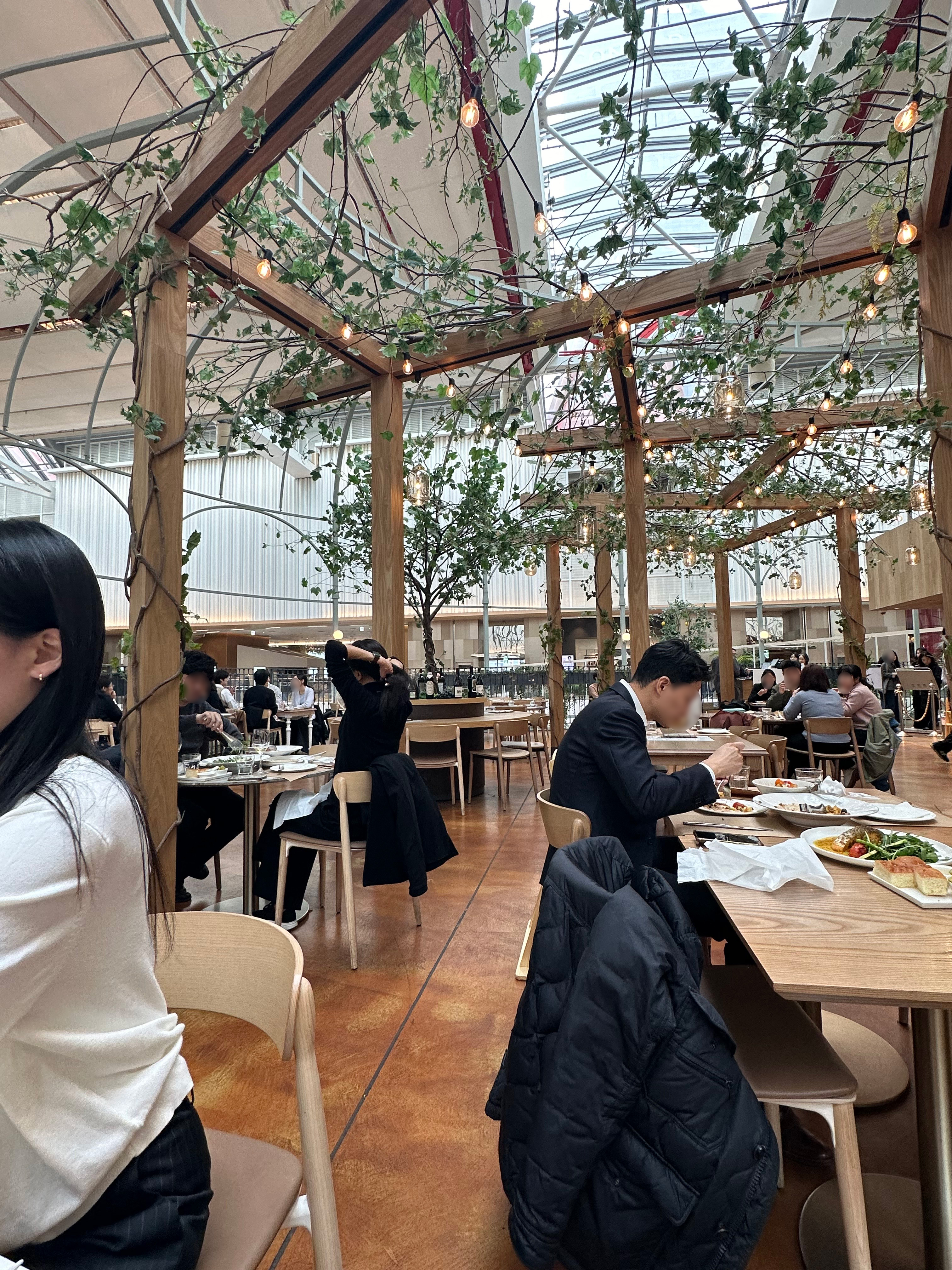 점심시간은 직장인에게 황금과 같은 존재니까. 상품기획팀도 현대식품관 어플리케이션에서 미리 입장 대기를 걸어둬서 빠른 입장이 가능했다고 하네요. 더현대의 인테리어 키워드 자체가 '사운드 포레스트'이다보니 꼭대기층에 위치한 이탈리의 내부도 갖가지 풀이파리들로 꾸며져 있습니다. 이름에서 느껴지는 느낌처럼 이탈리아 시골 마을의 레몬트리를 따라한 건가 했는데, 음 그냥 바짝 마른 조화예요.