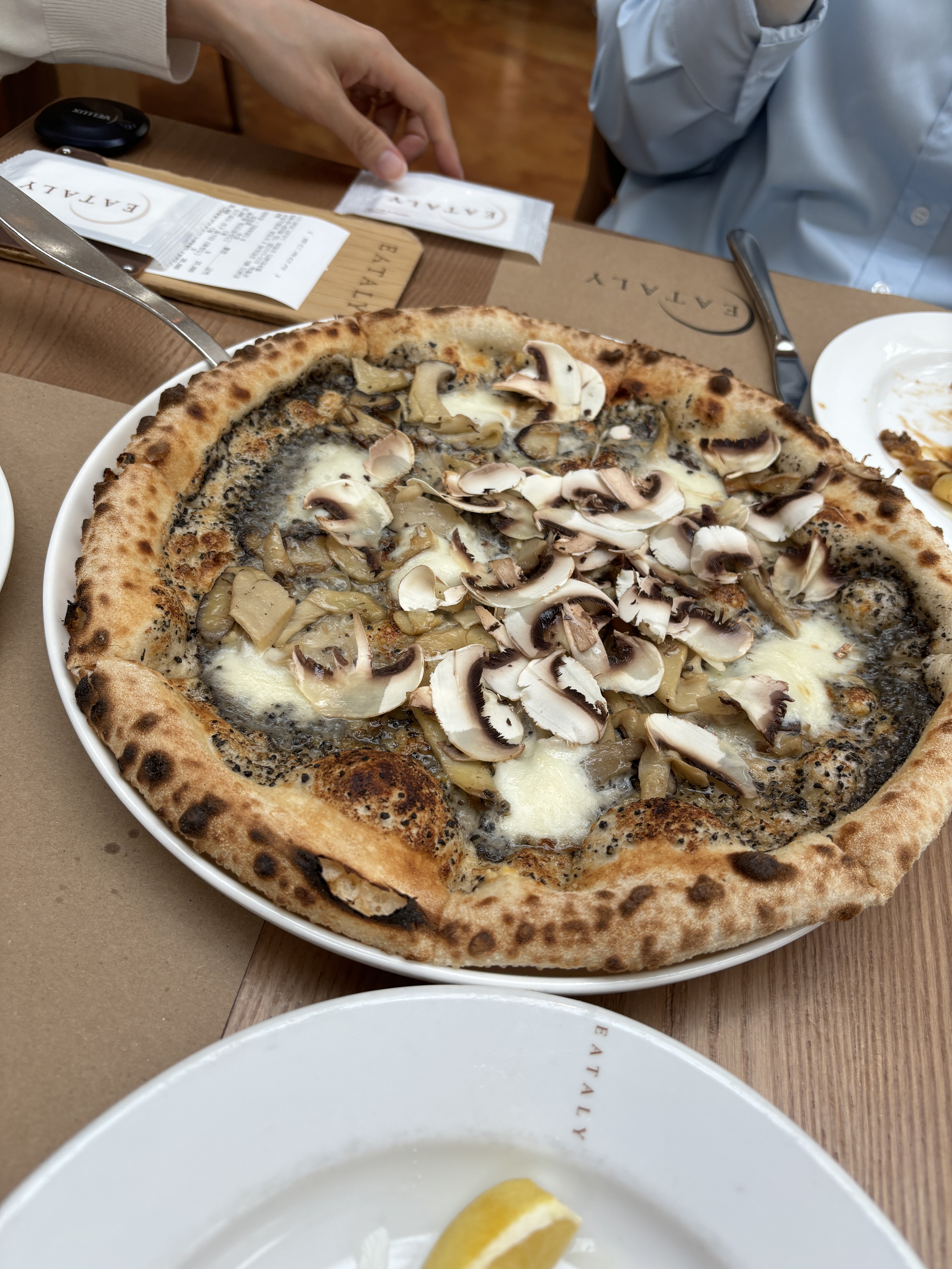 뭐가 심심했네 건강식이네 했지만 깔끔하게 한 메뉴씩 격파하고 있는 과정샷. 한꺼번에 주문해도 각 메뉴가 서빙되는 타이밍이 다르기 때문에 풀샷을 찍기는 힘들었다고 하구요. 다들 이탈리를 '더현대 맛집' 또는 '여의도 맛집', '여의도 회식'을 검색하면 격조있게 포크질 할 수 있는 곳으로 추천되는 곳이다보니 한 번쯤은 경험해봄직한 곳이었다고 합니다. 앞 선 메뉴가 준 당황함을 모두 이겨내는 피자와 스테이크의 진한 풍미를 경험하고 싶은 분들에게 추천합니다.