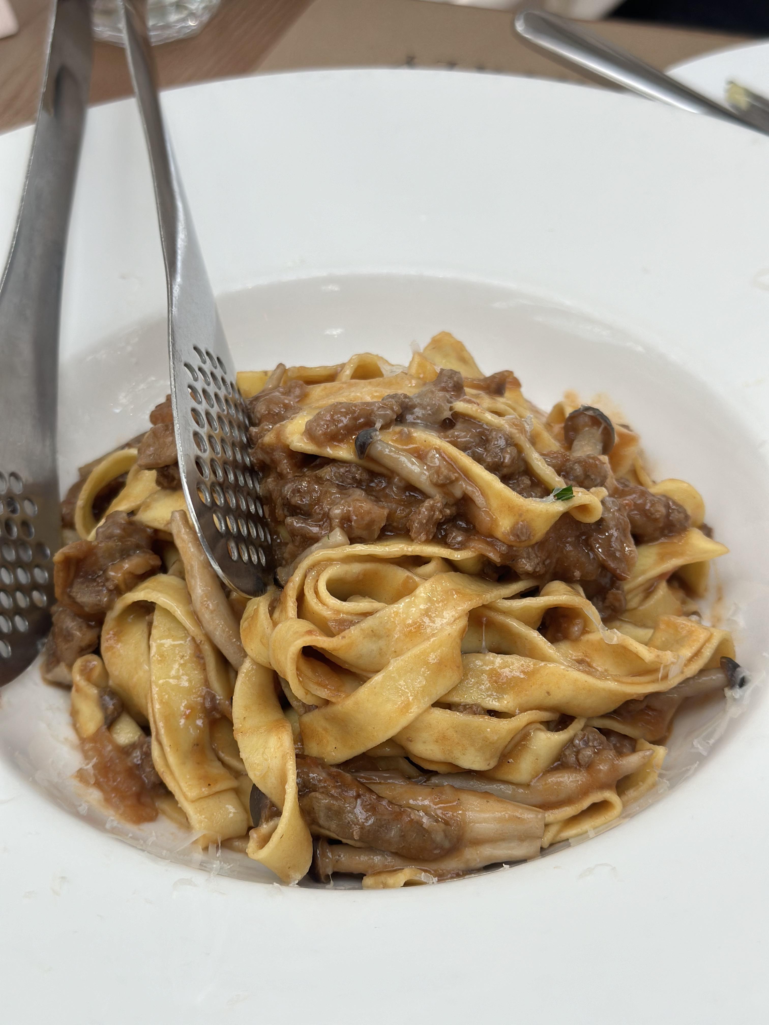 아 아니넹. 하나 더 나옵니다(대체 몇 개를 시킨 거요? 부자라고 자랑하는 거요?). 포르치니 라구 파스타(Talgliatelle Al Ragu' di Porcini)가 나왔습니다. 포르치니 버섯과 다진 소고기가 들어간 라구 생면으로 만든 파스타라고 하네요. 쫀득쫀득 감칠맛이 황홀할 것 같지만, 이들이 가장 격렬한 환호를 보낸 메뉴는 바로 다음입니다.