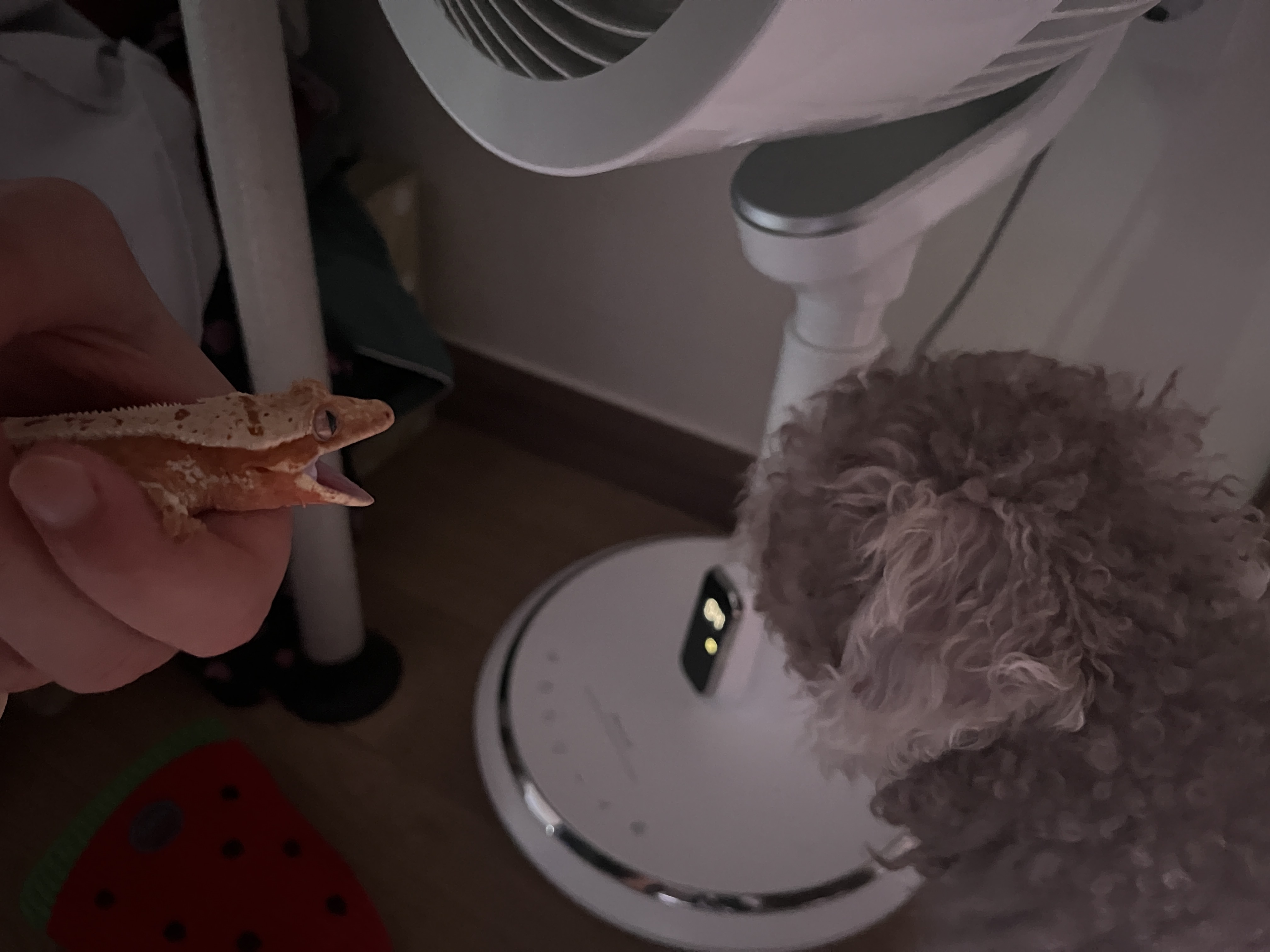 첫 번째 사진을 보고 다들 이게 뭔가- 하셨겠지만. 다음으로 소개해드릴 이들이야 말로 반려동물과 반려파충류의 공존의 현장입니다. 꼬부랑 털이 매력적인 강아지는 이름이 해리라고 해요(성은 홍씨). 입양할 때는 티컵푸들인줄 알고 데려왔다는데, 발육 상태가 매우 좋아 그냥 실버 푸들로 정정해야겠다는 웃픈 이야기. 나름 덩치에 자부심이 있는지 본인보다 작은 아이들을 만만하게 본다는데, 두 번째 사진이 왠지 까불었다가 외면하는 찰나의 순간 같지 않나요?ㅋㅋ