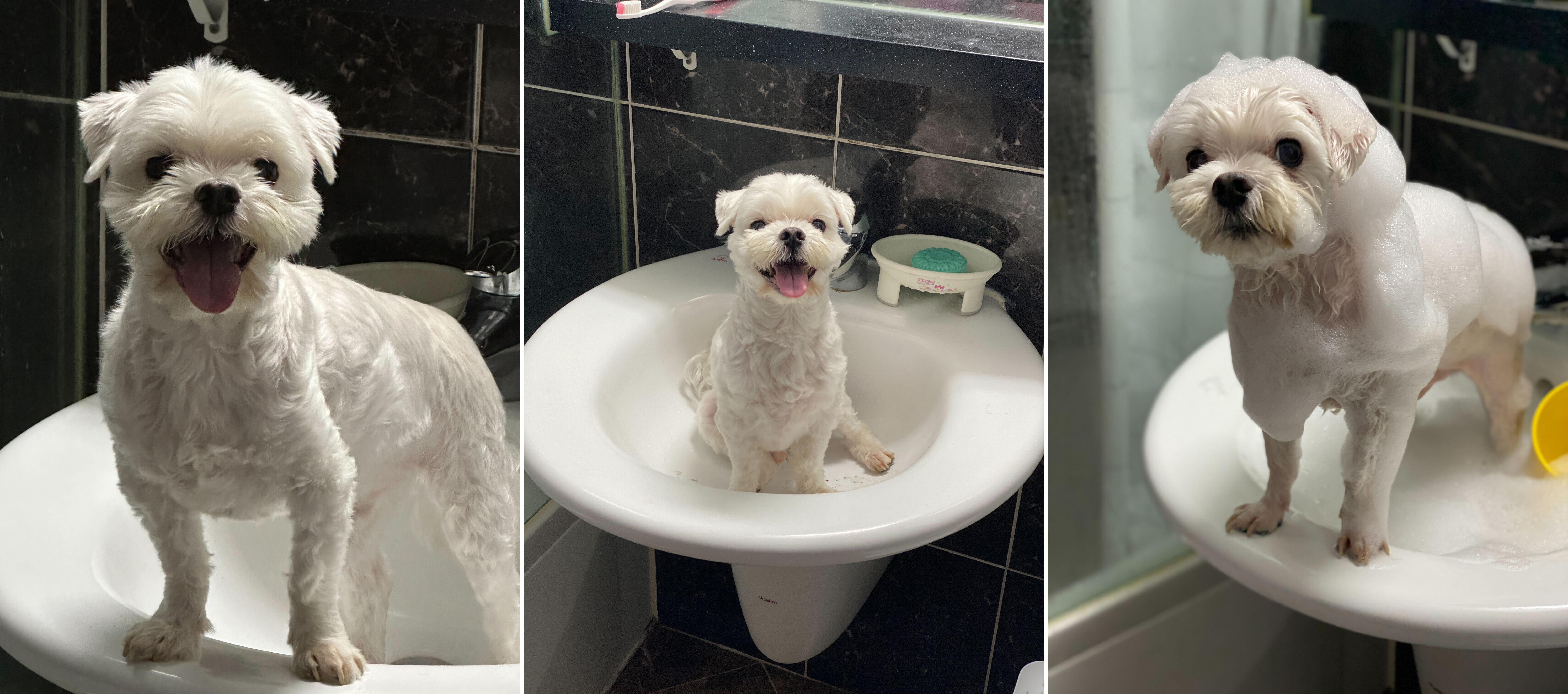 몸집이 작다는 것을 어필하듯 주로 세면대에서 샤워를 즐기는 이 귀여운 존재는 익명의 슈륙챙이님의 터줏대감 배태백군입니다. 아주 작고 귀엽고 새하얀 말티즈예요! (꺄아) 벌써 15살이라는 나이가 전혀 느껴지지 않을 만큼 작고 소중하지 않나요? 슈륙챙이님이 보내준 배태백군 소개서에도 이렇게 기재돼있어요.