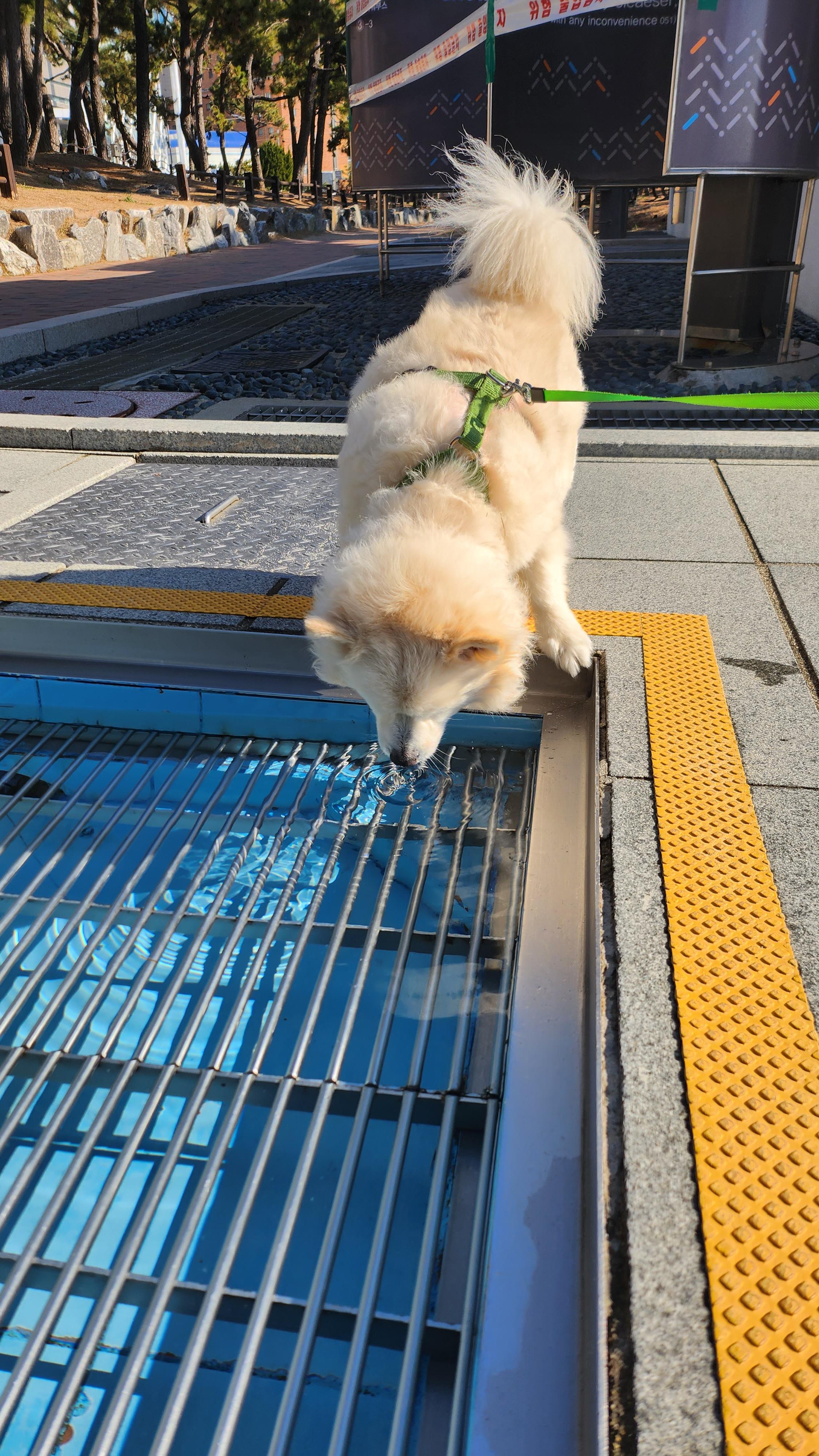 여긴 현재 한류라는 놈이 살고 있는 해운대구 백사장 앞입니다. 저긴 강아지 물 먹으라고 친절하게 만들어둔 게 아니라 해수욕 즐긴 사람들 발에 모래 씻으라고 받아둔 물인데요. 류는 그걸 먹어요. 물을 안챙겨나가냐구요? 아니요? 얘는 그것도 먹고 이것도 먹어요. 네... 요즘은 그냥 먹으라고 둡니다.