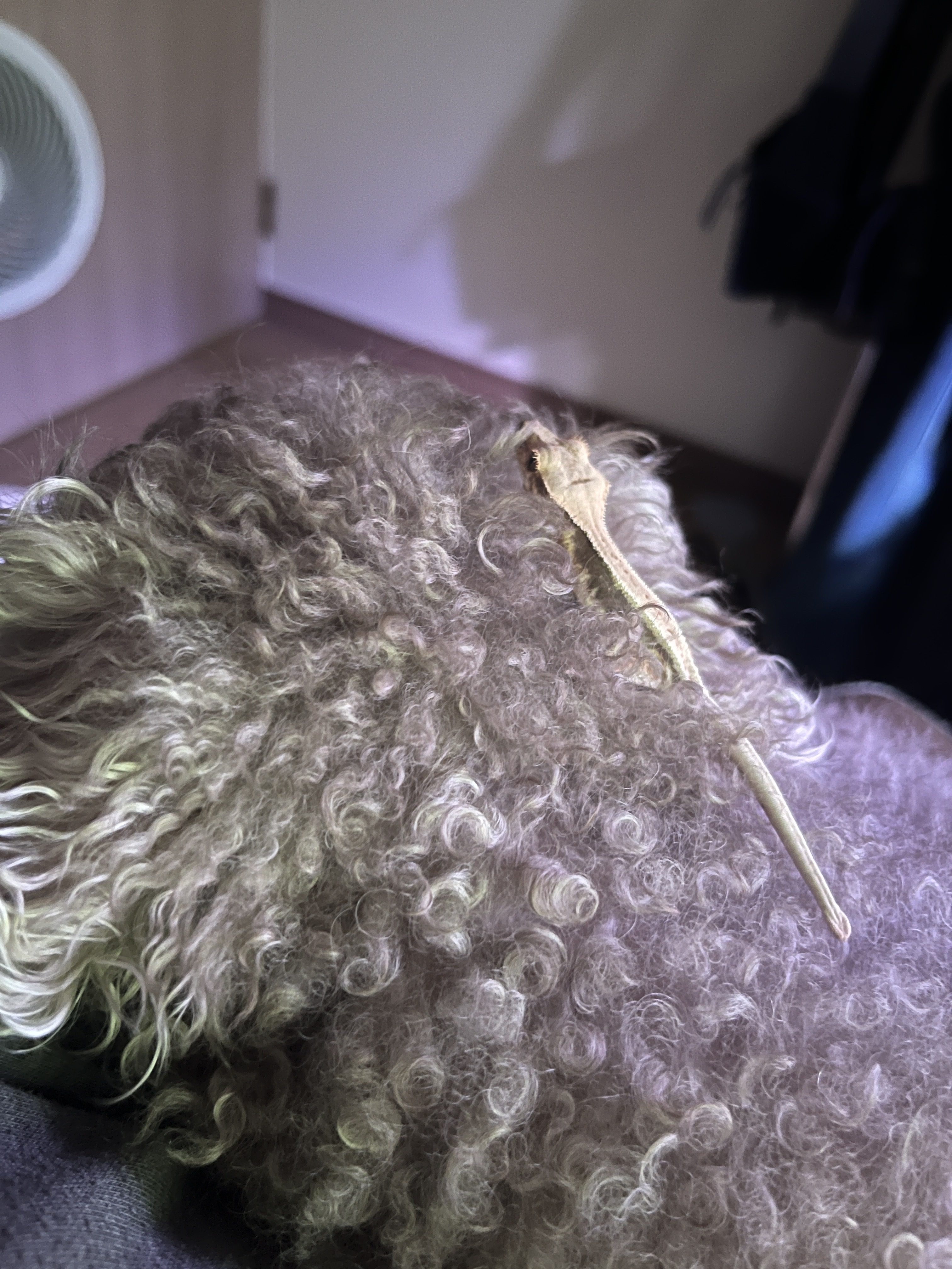 첫 번째 사진을 보고 다들 이게 뭔가- 하셨겠지만. 다음으로 소개해드릴 이들이야 말로 반려동물과 반려파충류의 공존의 현장입니다. 꼬부랑 털이 매력적인 강아지는 이름이 해리라고 해요(성은 홍씨). 입양할 때는 티컵푸들인줄 알고 데려왔다는데, 발육 상태가 매우 좋아 그냥 실버 푸들로 정정해야겠다는 웃픈 이야기. 나름 덩치에 자부심이 있는지 본인보다 작은 아이들을 만만하게 본다는데, 두 번째 사진이 왠지 까불었다가 외면하는 찰나의 순간 같지 않나요?ㅋㅋ