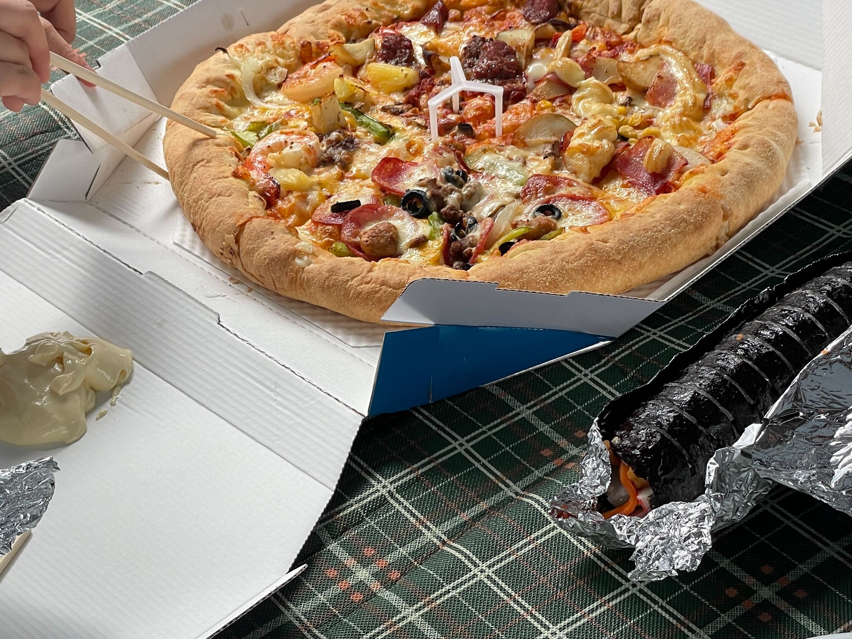 피자는 모두의 입맛을 맞추기 위해 콰트로로 주문했고 김밥도 종류별로 조달해온 덕에 옴뇸뇸 맛있게 먹었습니다. 그리고 드디어 치킨 도착! 분명 보통맛과 매운맛으로 주문했는데 모두 똑같은 매운맛인 거 실화? 맵찔이인 저는 남겨둔 김밥과 함께가 아니라면 콧물 찔찔에 속쓰림을 이기지 못했을 것이라는 단언. 자, 이제 배 든든히 먹었으니 소화시키러 떠나볼까요?