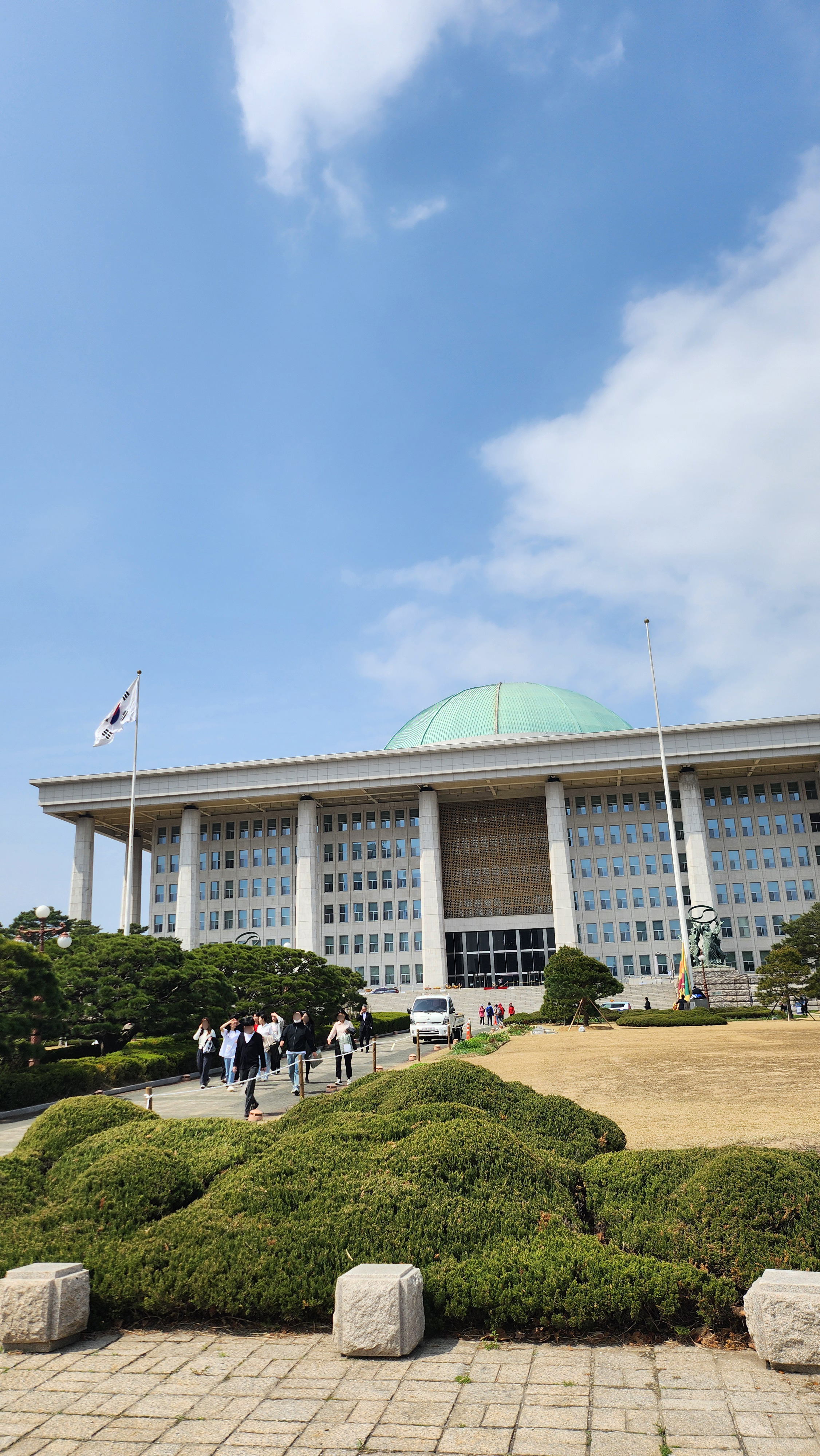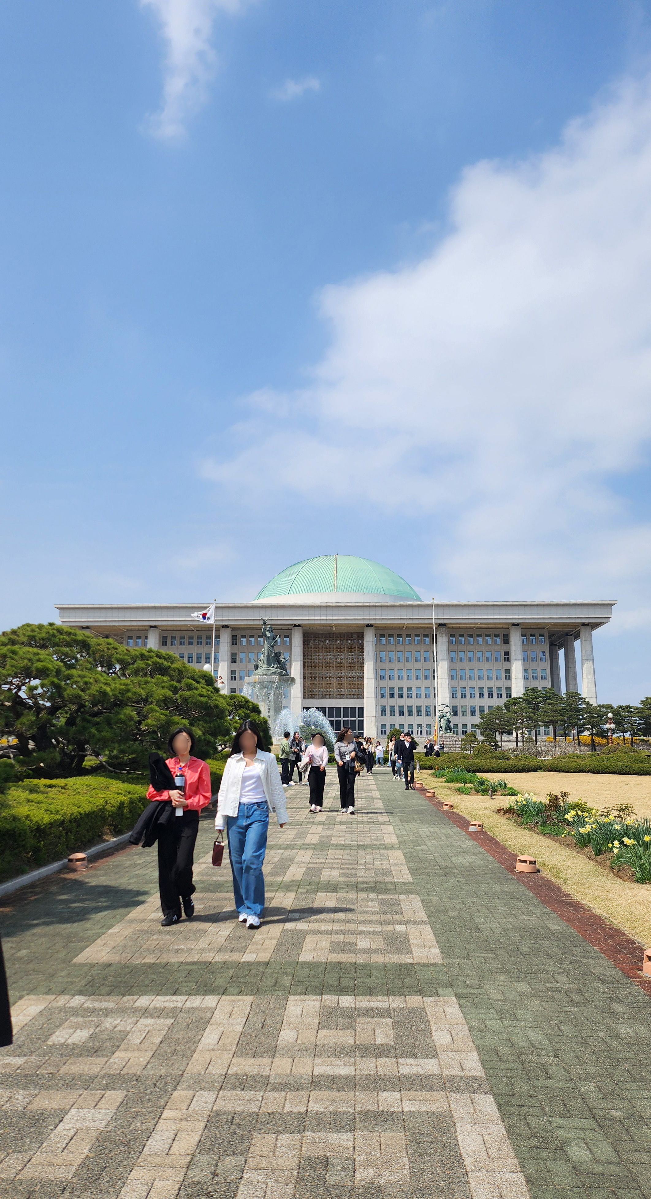 가는 길에 호가든 맥주 홍보 부스가 있어 혹시나 시음을 할 수 있을까 했는데 요트선착장까지 걸어야 하는 것 같아 중간에 국회의사당으로 들어가기로 결정하고 꺾었습니다. 윤중로는 생각보다 길다란 코스여서 하염없이 걷다보면 도저히 오후 근무를 못할 것 같은 느낌이었달까? 마침 사무실 이전 날짜까지 확정이 되었던 터라 한 번도 가보지 않았던 코스로 국회의사당을 선택한 건 탁월했다는 생각이 듭니다(는 여의도 6년차 붙박이의 왈). 국회의사당은 다들 들어가면 안되는 줄 아시는데, 아니거든요. 모든 국민에게 오픈된 장소라 '나는 정치가 너무 싫어서 저 쪽으로는 발 끝도 안 닿을 거야'하는 분만 아니라면 모두 출입이 가능합니다. 그리고, 국회의사당 대부분이 정원으로 이뤄져 있어서 봄에 즐기는 절경도 한 몫 하고요. 저기, 대한민국에 위기가 닥치면 태권V가 지붕을 가르고 출동한다던 국회 돔을 등 뒤로 두고 다시 IFC를 향해 걸어갑니다(글쓴이 연식 나오넹). 걷는 거 안 좋아하는 분 있나요? 있어요? 아니아니, 업무 시간에 소풍 나와서 걷는 거 안 좋아하는 분 있어요? 없죠. 마음껏 걸어요.