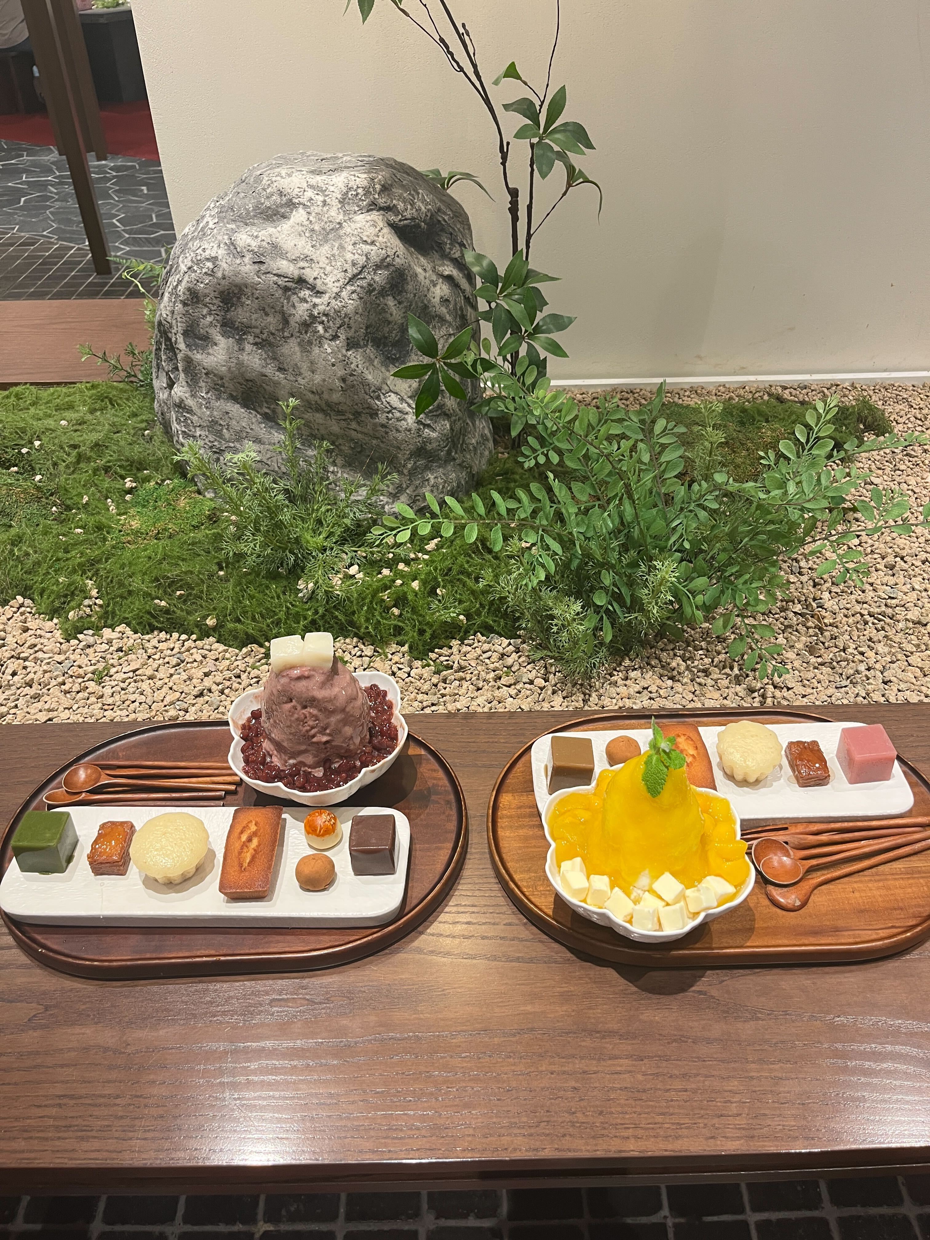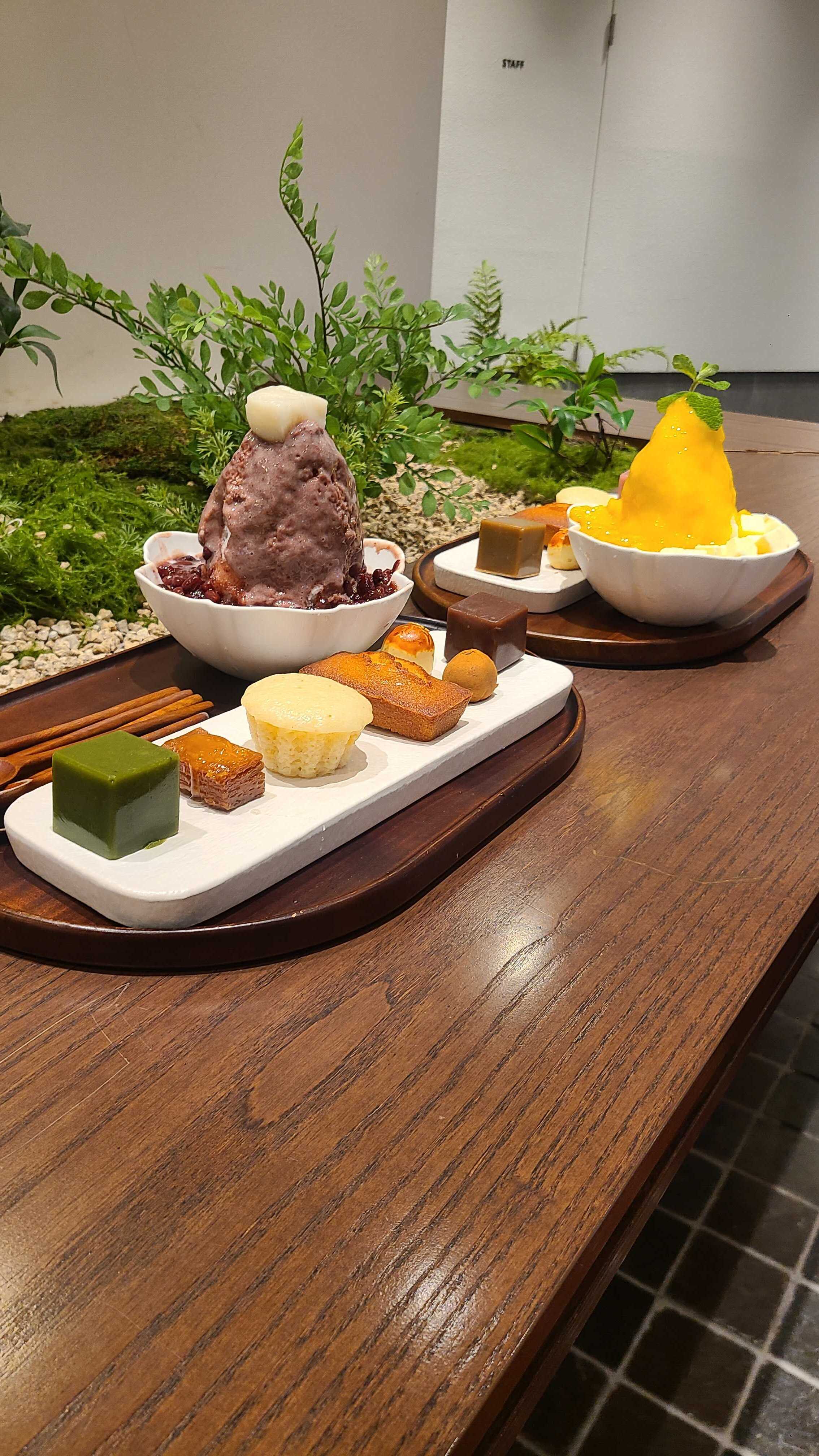 인테리어에 힘을 좀 쓴듯 이끼로 만든 작은 테라리움 분수도 있고 일본식 중정 같은 테이블도 있었어요. 저희는 적당이 팥 전문점이니 팥빙수 하나, 포기할 수 없는 망고빙수도 하나, 그리고 팥양갱과 밤양갱과 개성주악도 함께 맛볼 수 있는 적당 다과 한상차림도 두개 주문했습니다. 계산하고나니 밥값이나 디저트값이나 비슷하더라구요^^ 4개 메뉴 총 해서 6만4천원. 진짜 맛있겠지?