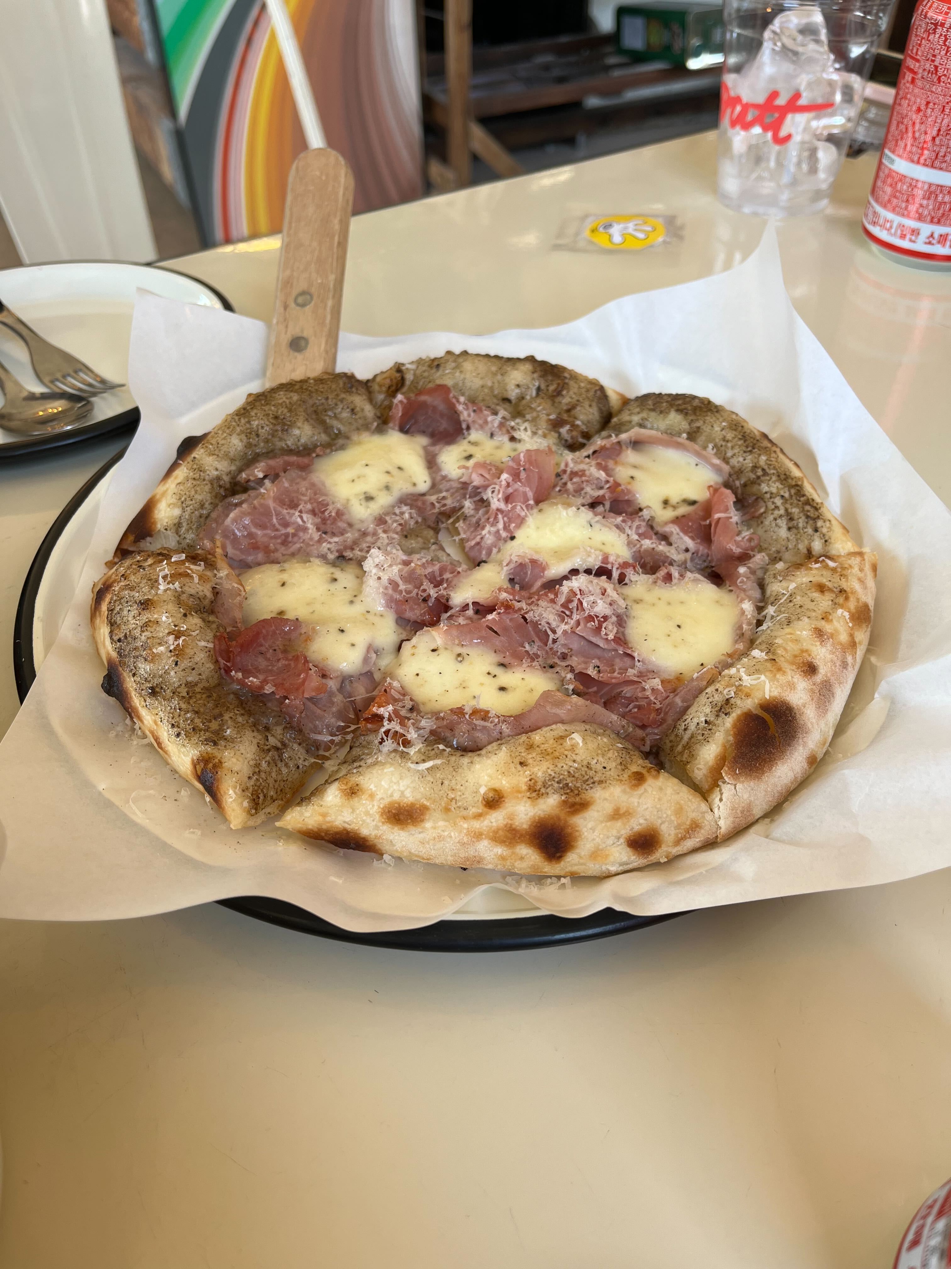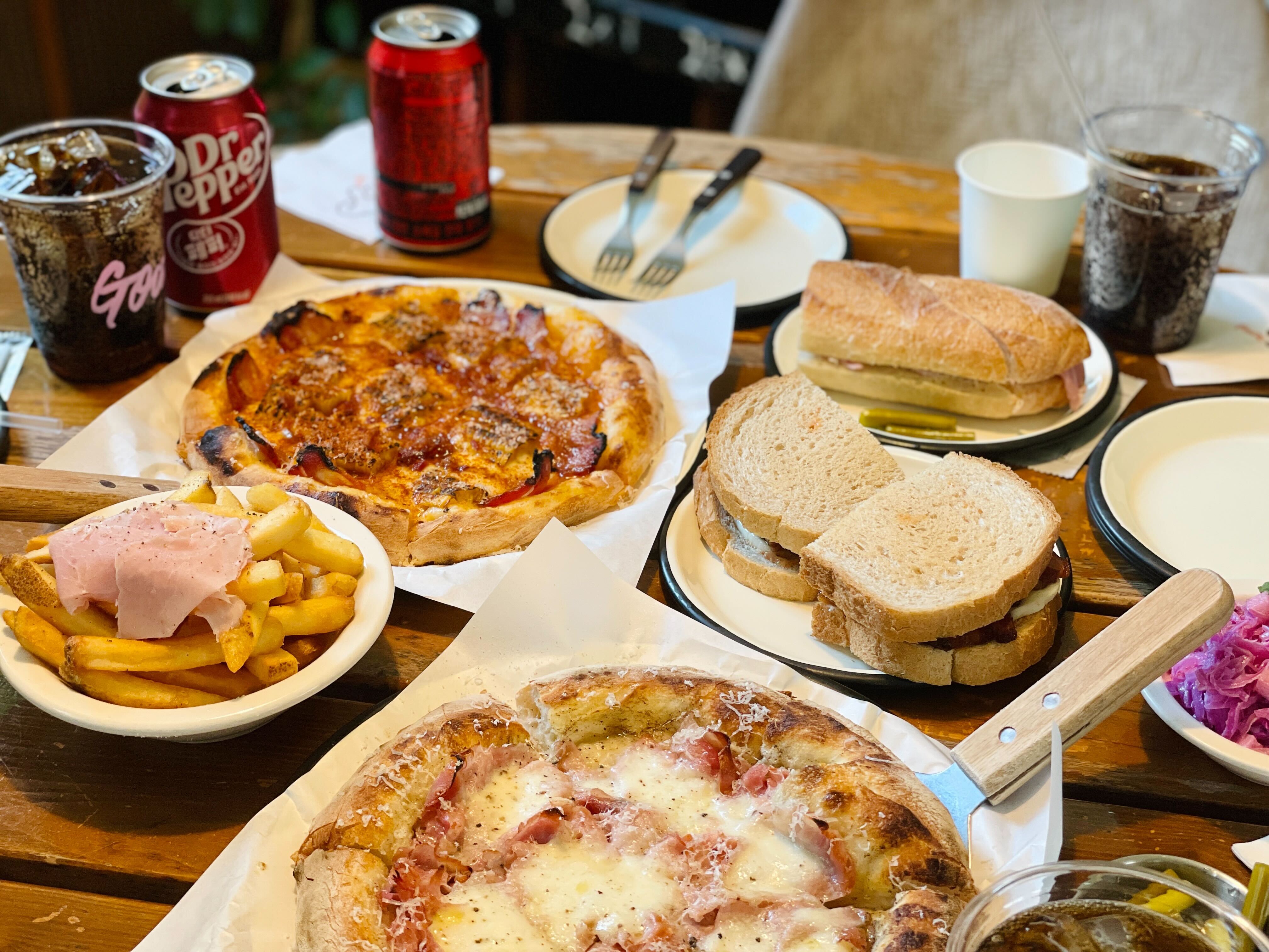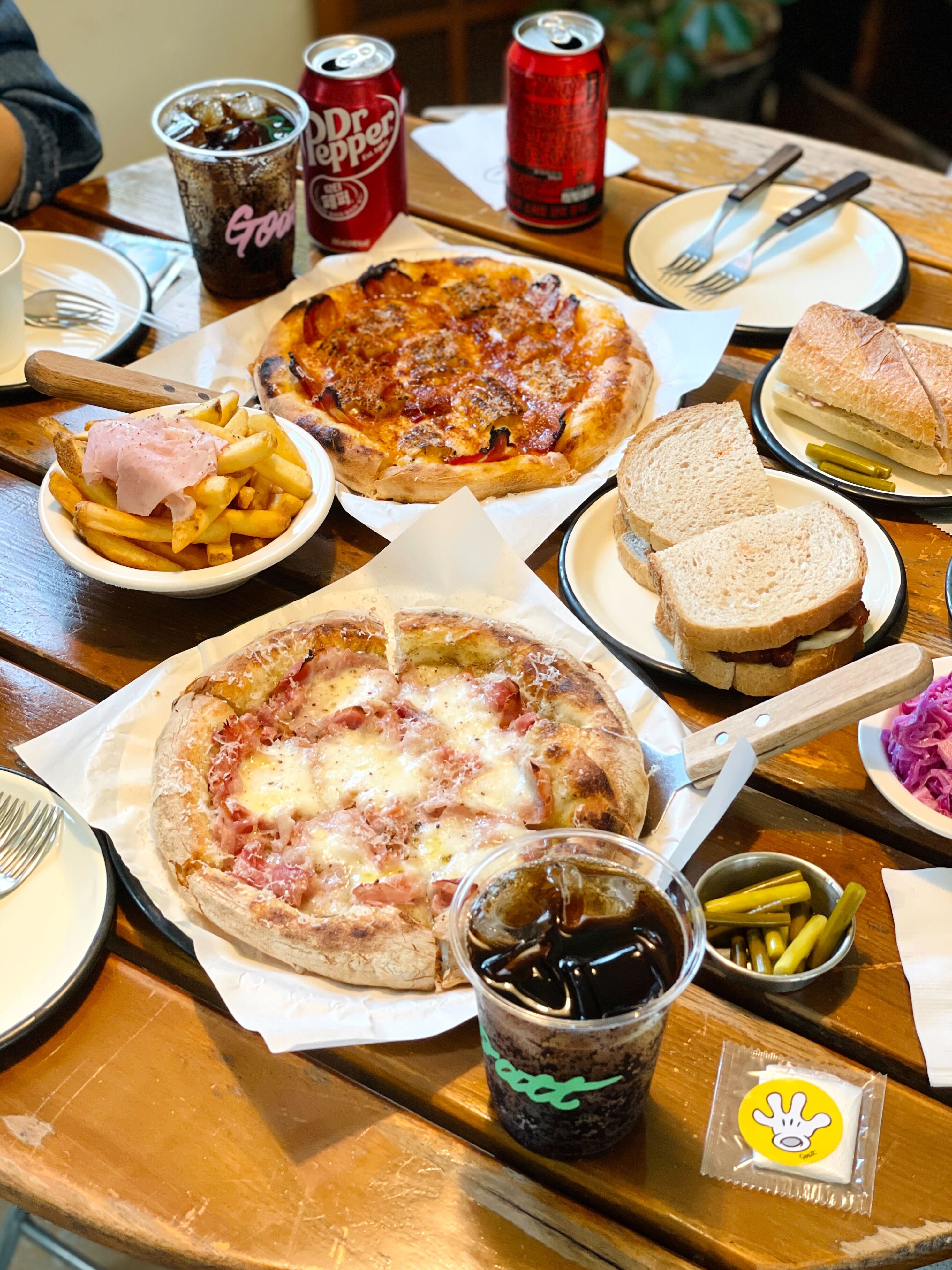 날이 더우니까 일단 음료로 닥터페퍼 먼저 시키고, 머쉬룸고트피자와 스모키베이컨피자 두 종류 다 주문했구요. 애플베이컨 샌드위치와 음료 세트메뉴가 있어서 고것도 주문해보았습니다. 잠봉뵈르는 예전에 런던베이글뮤지엄 갔을 때 먹어보고 짭쪼롬한 것이 넘나 맛도리여서 그 맛과 비슷할까 먹어보려고 주문했구요. 아무래도 느끼할 것 같아 코울슬로 샐러드에 각자 마실 음료까지 한 두개 더 시키고 앉았는데 왠지 영수증을 보니 짧은 느낌이 들더라구요. 그래서 추가로 프렌치프라이도 추가했습니다. 하하핳. 이쯤에서 다른 팀은 무얼 시켰나 한번 살펴보겠습니다.