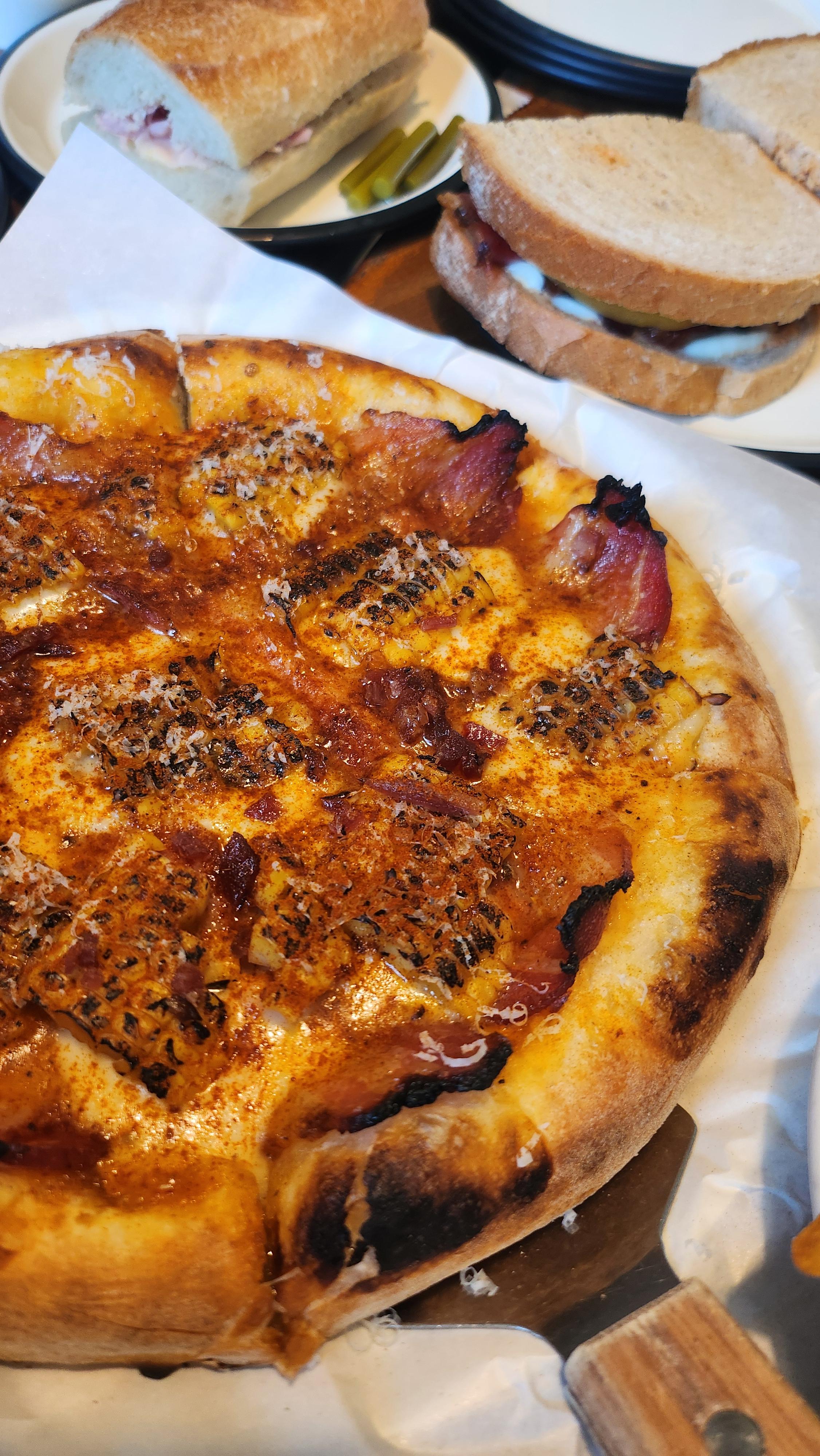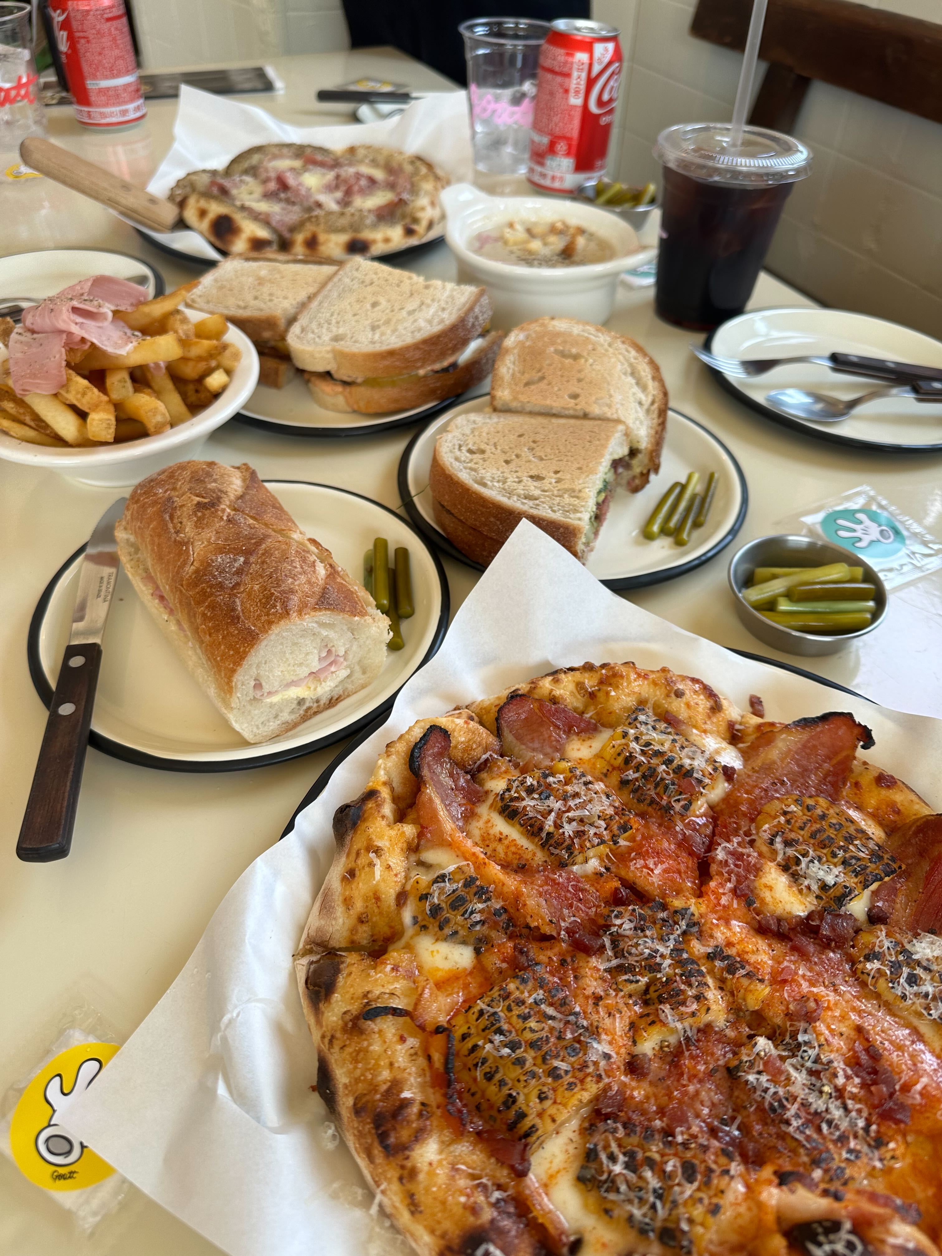 이커머스팀도 역시나 피자 두 종류와 잠봉뵈르는 고정값이네요. 머쉬룸고트피자와 스모키베이컨피자, 그리고 잠봉뵈르, 애플베이컨 샌드위치, 올드스쿨 파스트라미, 스프, 하우스피클이 테이블 빈 곳이 없도록 가득 찼습니다. 잠봉뵈르는 콱 베어 물면 훈제향이 나는 고깃더미와 버터가 함께 어우러지는데요. 쫄깃하고 파삭한 바게트와 잘 어울립니다. 하지만 원픽은 역시 피자! 머쉬룸고트피자는 쥭쥭 늘어나는 치즈와 흐물흐물해진 버섯의 앙상블이 아주 고소하고, 스모키베이컨피자는 짭짤~~~한데다 제가 사랑하는 구운 옥수수까지 얹어져 있어서 환상입니다. 하지만, 절대 방심하면 안되는 것이 모든 음식에 빵이 포함되어 있어 입이 금방 마른다는 사실. 그래서 저는 나중에 왼손 기본값으로 닥터페퍼만 들고 있었다는 후문.
