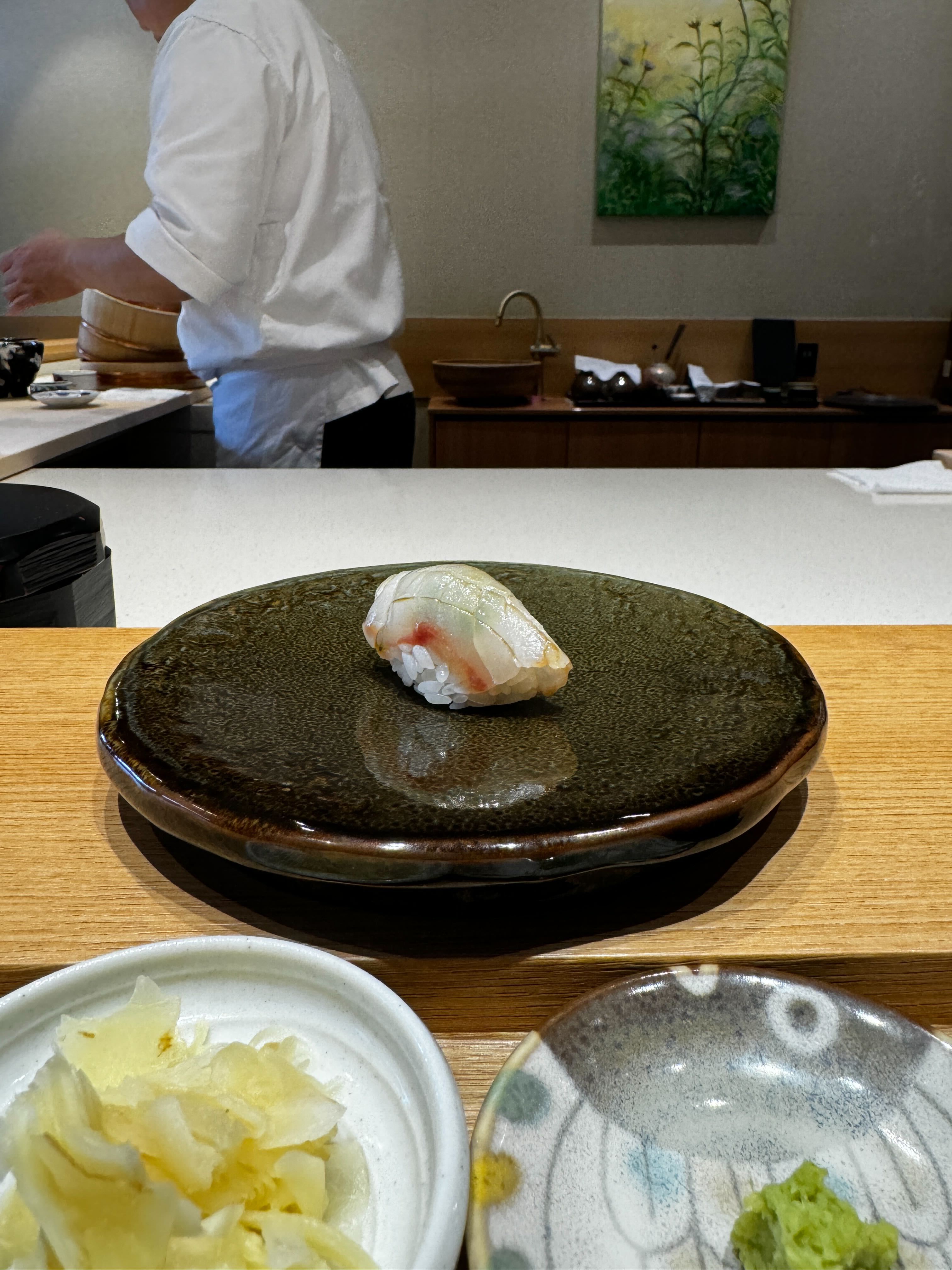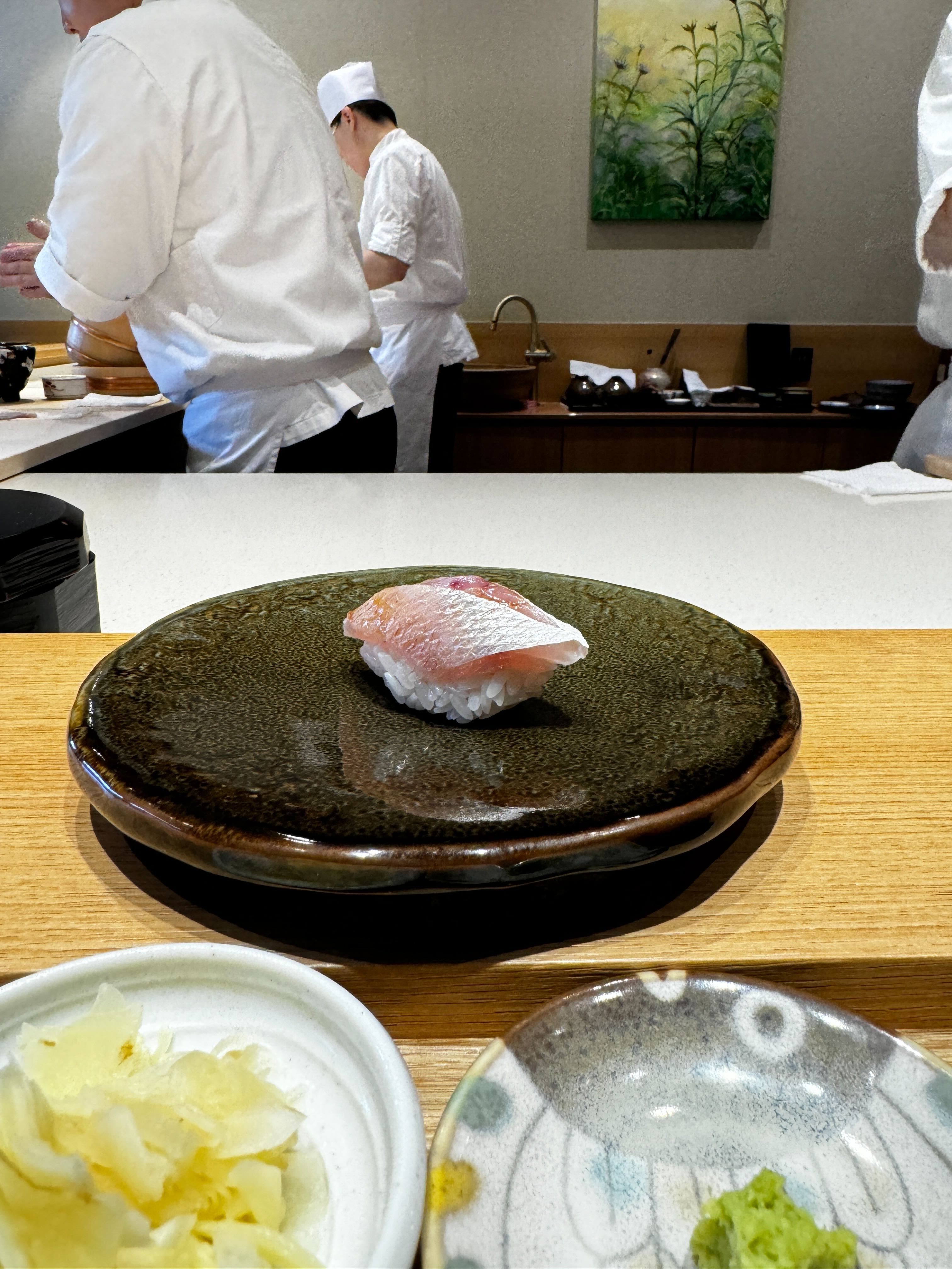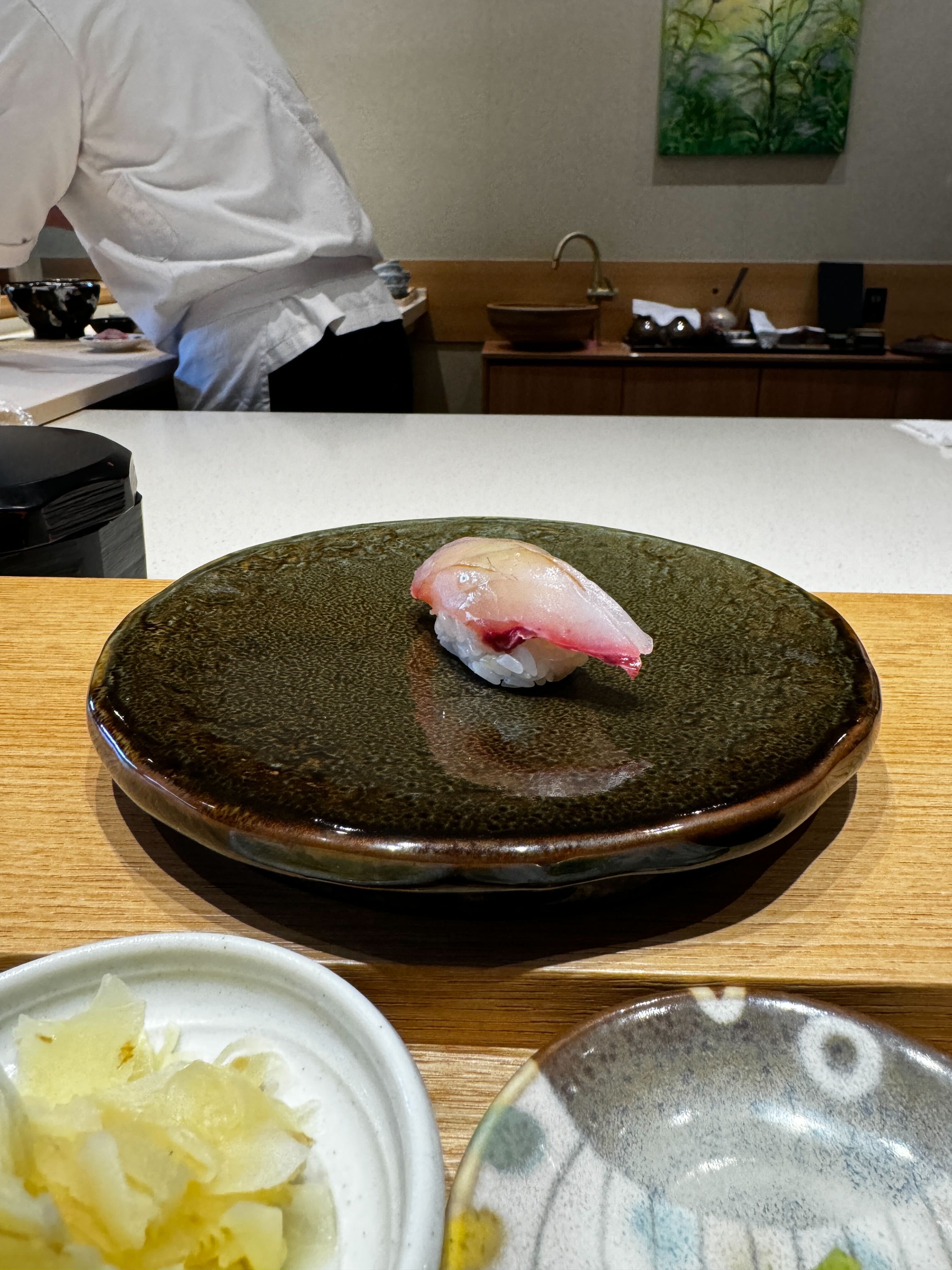 '음~ 맛있는데요!'를 연발하자 나온 다음 메뉴. 샤리 위 다진마늘을 올린 잿방어와 샤리 위 실파를 올린 참돔입니다. 세상에 참돔이라니. 겨우 3만원 대의 오마카세에서 맛볼 수 있는 메뉴였나요? 귀하디 귀한 재료로 샤라락 만들어진 스시를 입 안에 톡 털어넣고 오래오래 씹습니다. 생강채에 간장을 묻혀서 스시에 톡톡 얹어 먹는 감칠맛이 아주 뛰어나요. 아, 목으로 넘어가는 게 너무 아까워요ㅠㅠ