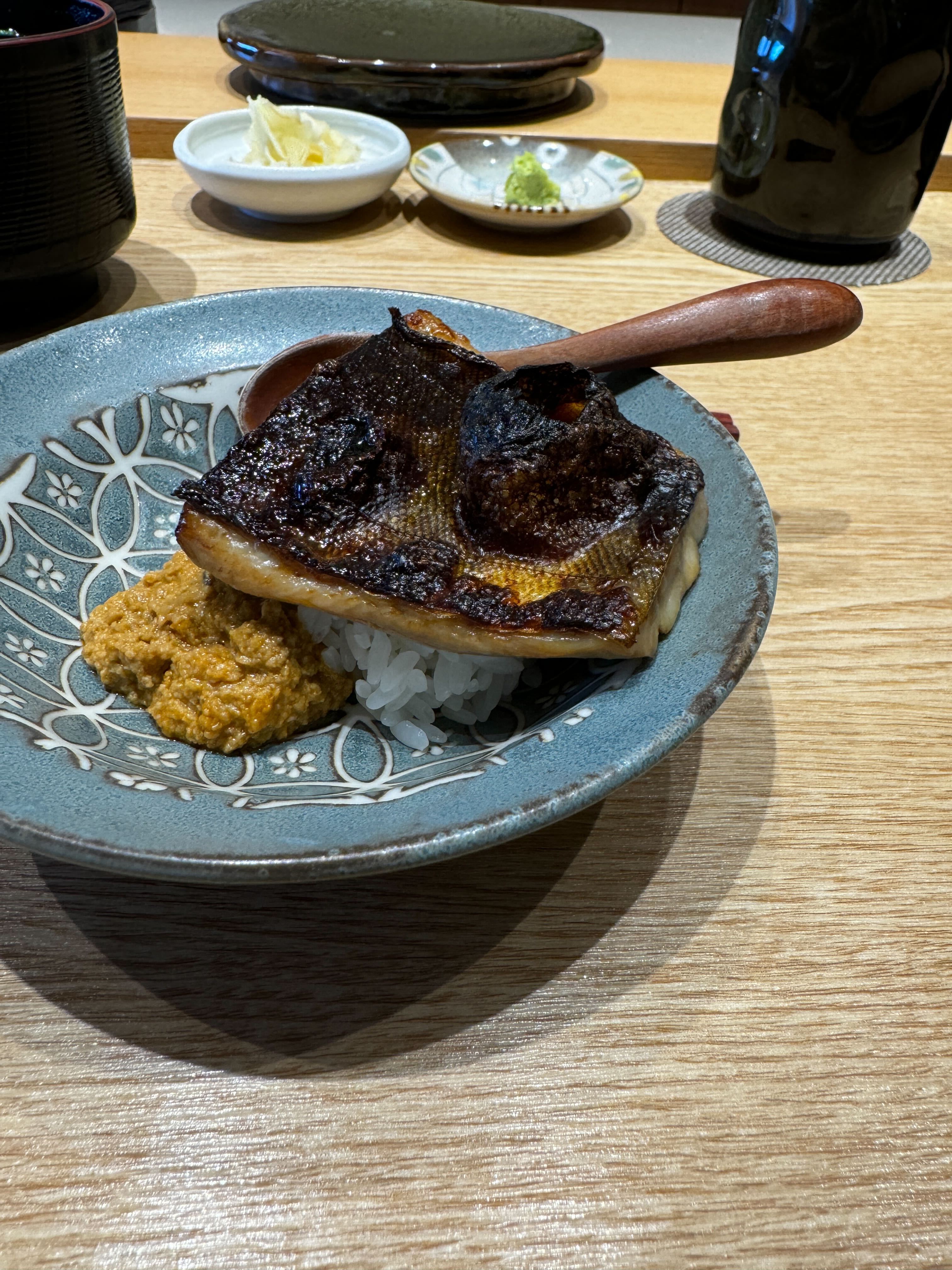 다음으로 아귀간 소스로 맛을 낸 임연수 구이 덮밥이 나왔습니다. 밥을 다 가릴 정도로 큼지막하게 구워져 나온 임연수 구이를 잘게 부순 후 싹싹 비벼 먹으면 되는데요. 밥을 왕창 비벼 먹는다는 느낌보다는 음, 구운 생선 초밥을 먹는 느낌? 고소하고 짭쪼름한 게 정말 맛도리더라구요.