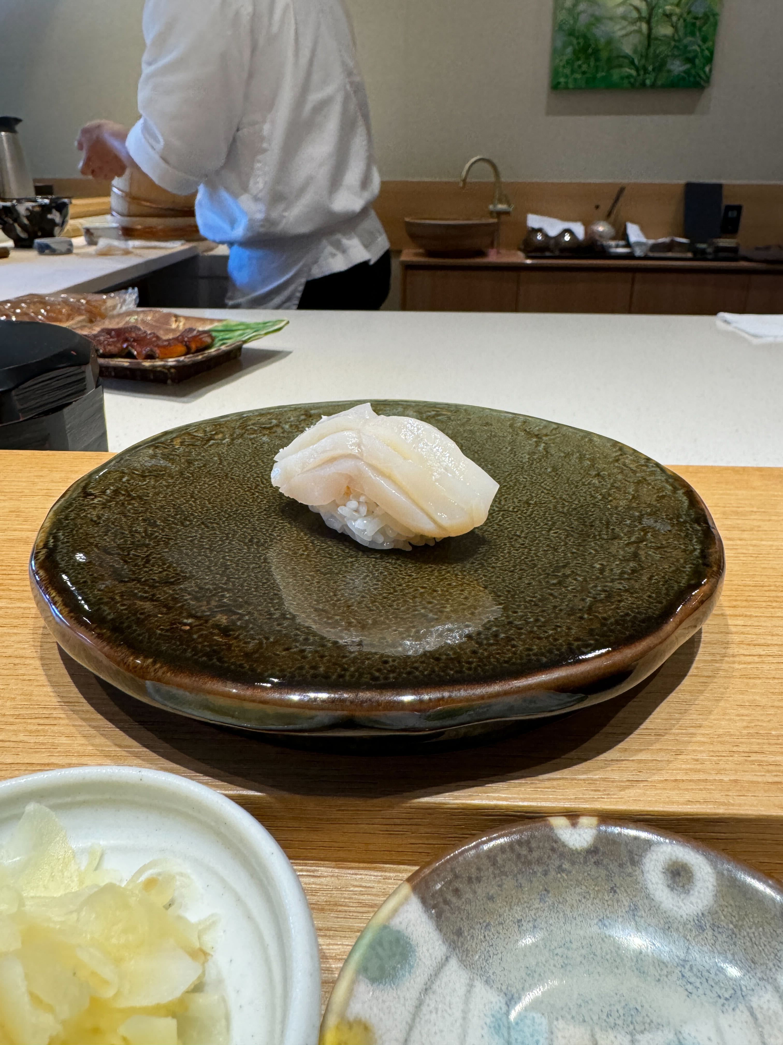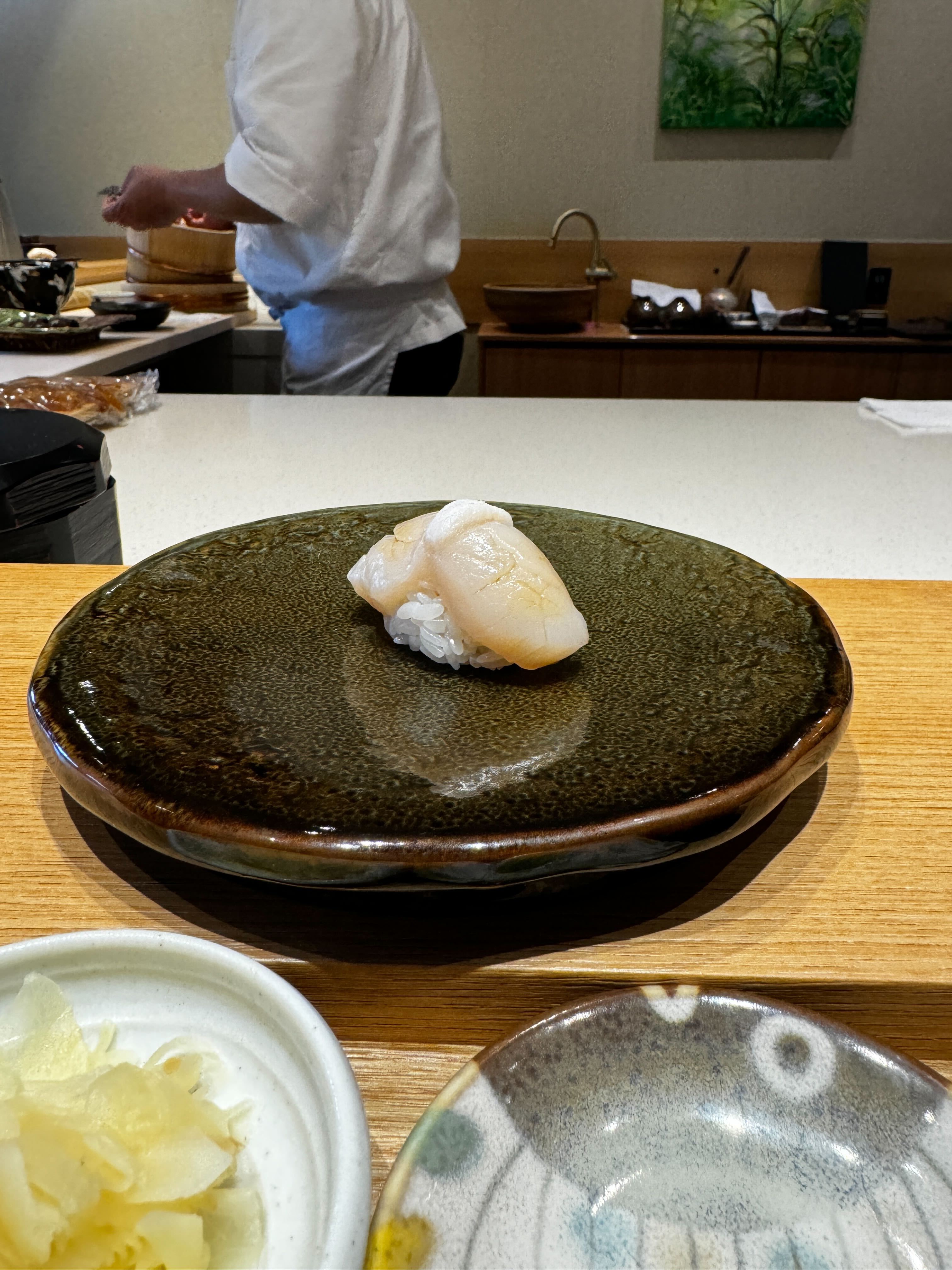 다음도 장어구이를 좋아하지 않는다고 말씀드렸더니 대신 나왔던 관자에 간장소스, 그리고 샤리 위 우메보시를 올린 가리비 관자입니다. 이게 바로 오마카세의 최고 장점 아니겠어요? 손님의 취향에 딱 맞춰 셰프와 소통하니 한 끼의 식사도 더더욱 만족도가 올라가는 거죠!