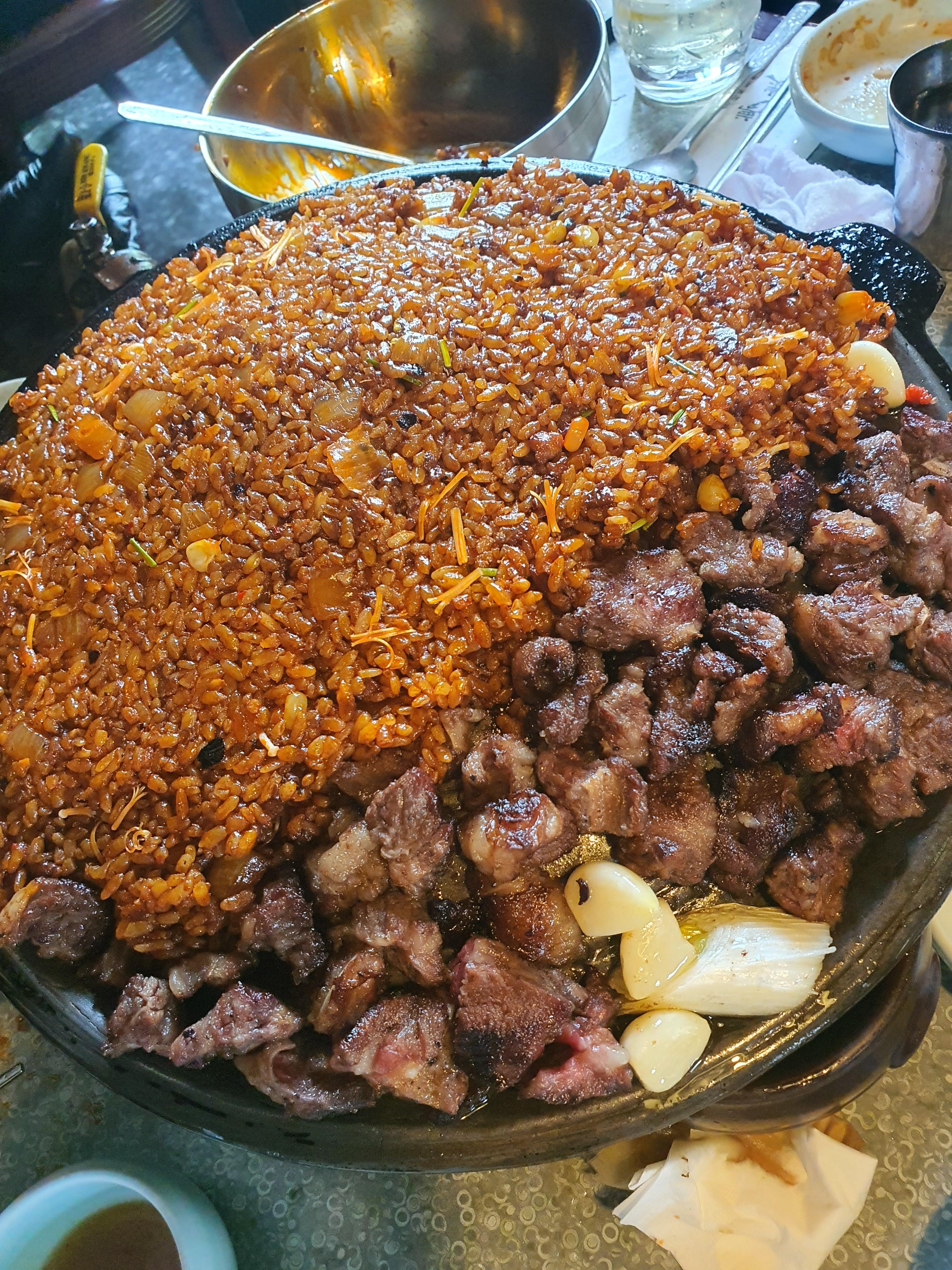 뼈도 지글지글 익혀서 분리한 후에 매콤한 볶음밥과 함께 세팅해주십니다. 다시 봐도... 맛있겠네요. 저건 참으면 안됩니다. 맛있게 먹으면 0칼로리를 계속해서 외치면서, 다이어트 고민따윈 잊고 남들과는 다르게 누구보다 빠르게 한 점이라도 더 먹는데 집중하셔야 해요! 스마트폰 잠깐 보다가 고개를 돌려보면, 고기는 사라지고 없습니다...
