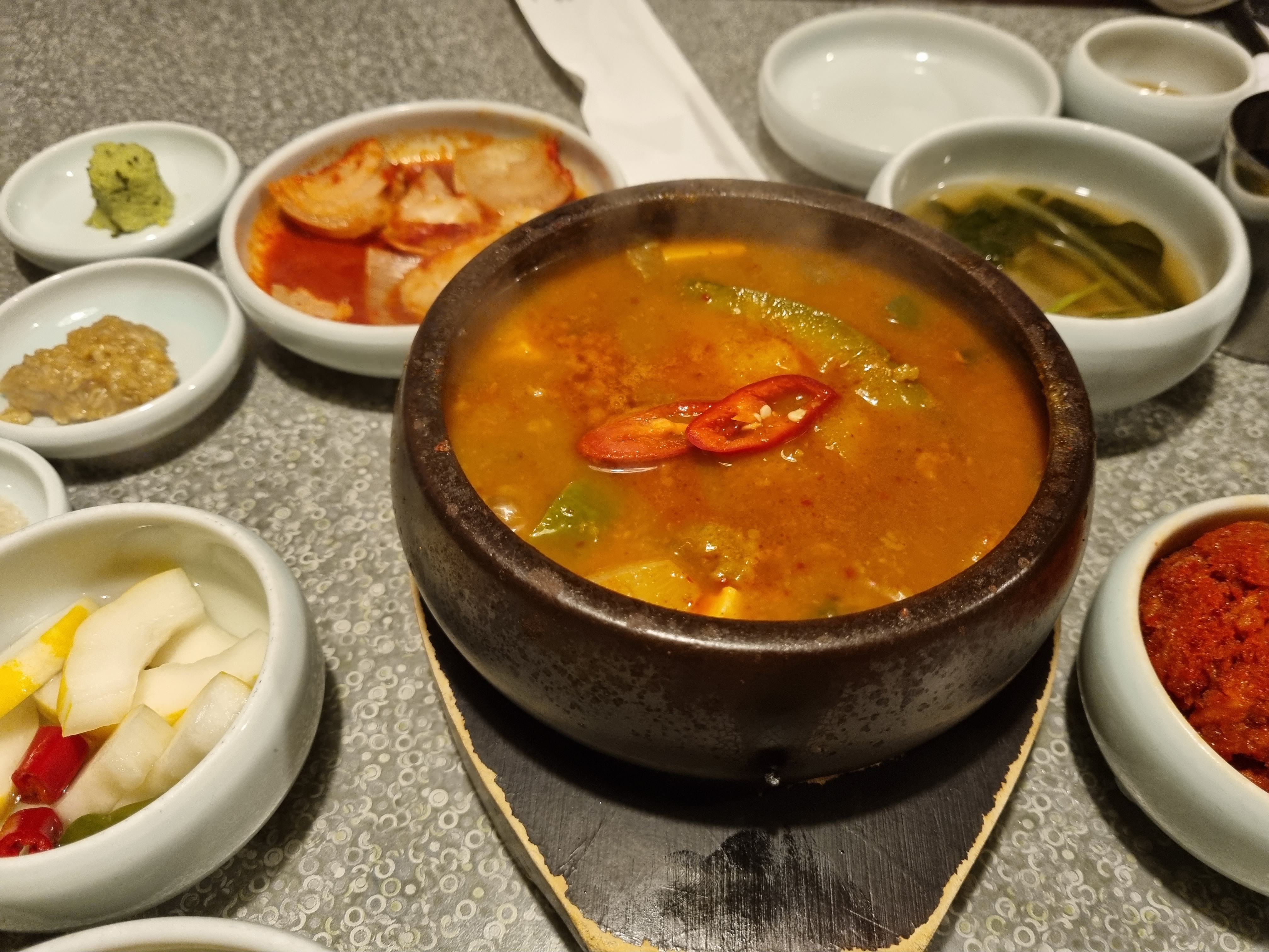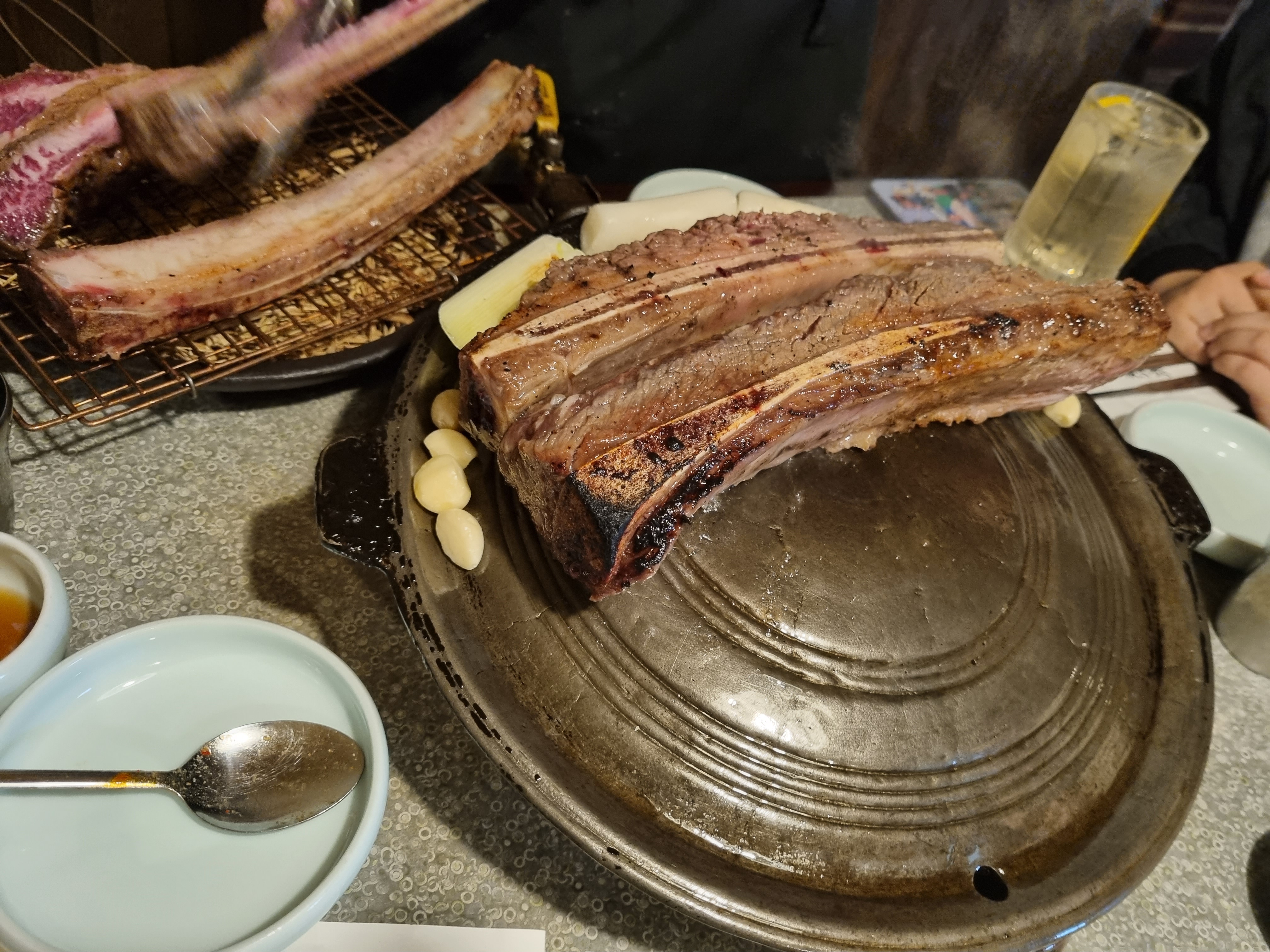두둥. 기다리던 우대갈비가 구워지고 있습니다. 여러분 아~~~하세요. 한 점 집어 드릴게요. 혀에 닿는 순간 육즙이 빠르게 스며들며 적당히 그을린 부분의 바삭함과 온기만 전해진 안쪽의 보드라운 육질이 정말 환상적입니다. 몽탄은 고기 뿐만 아니라 다양한 곁들임 소스와 반찬이 정갈해요. 요리 자체에 대한 공부가 아주 잘 되어있는 기분이 들었습니다.