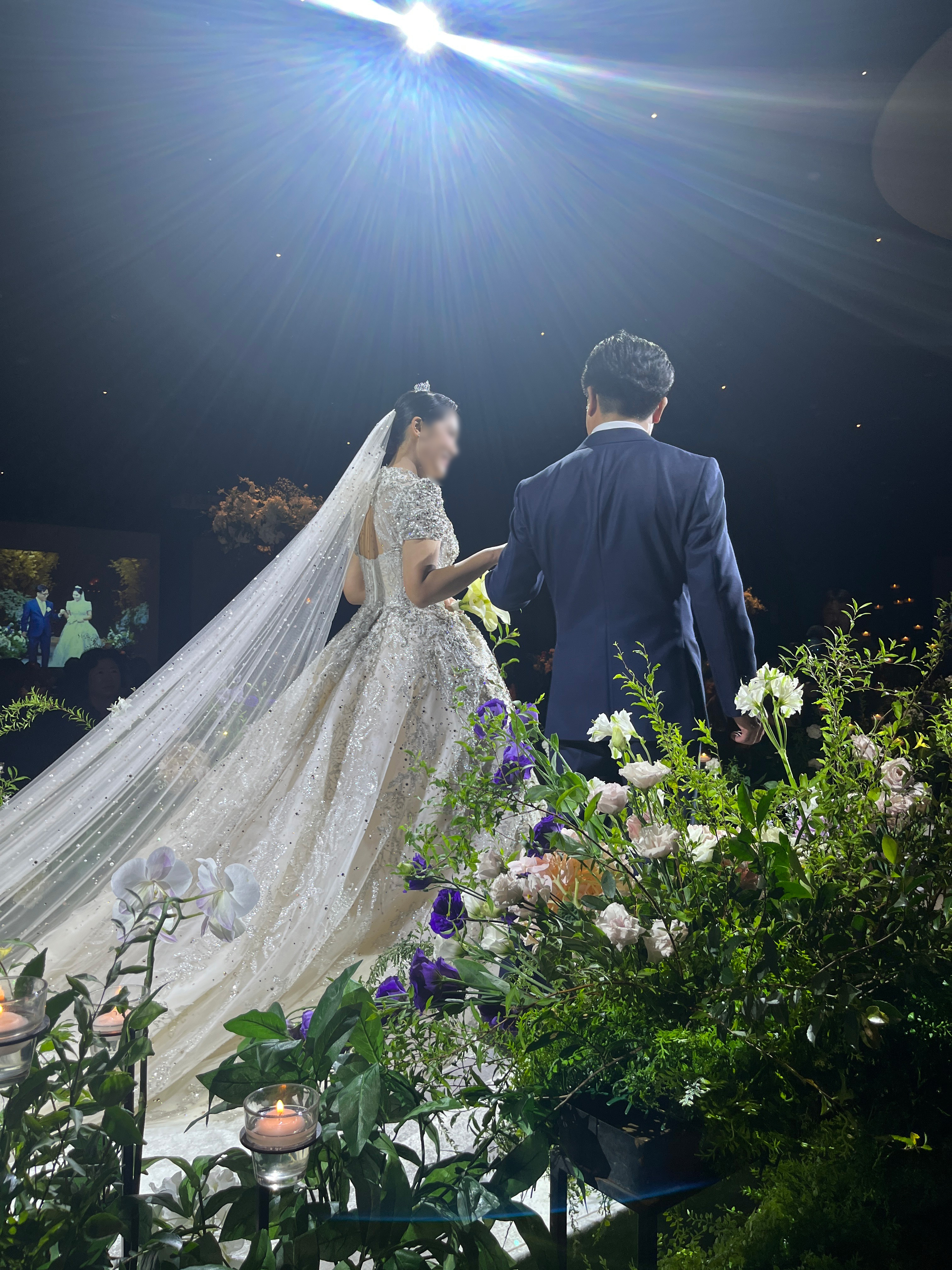 자 이제, 두구두구두구두구두구. 오늘 세상 가장 떨리고 행복할 신부가 아버지의 손을 잡고 입장합니다. 그랜드힐컨벤션은 버진로드에만 조명이 집중되는 것이 특징인데요. 자연광으로 꾸며진 다른 웨딩홀과 달리 조명빨이 확실하다보니 익명의 아르코, 신부가 입은 스왈롭스키 크리스탈 드레스가 쉴 세 없이 반짝이며 황홀경을 선사했어요. 신랑 입장할 때 신랑측 하객이 워낙 많은 환호성을 선보여서, 경쟁의식이 붙은(대체 왜...?) 저희도 신부입장할 때 박수와 환호성을 마음껏 발사했습니다. 아르코 신부님, 혹시 들리셨나요?ㅎㅎ