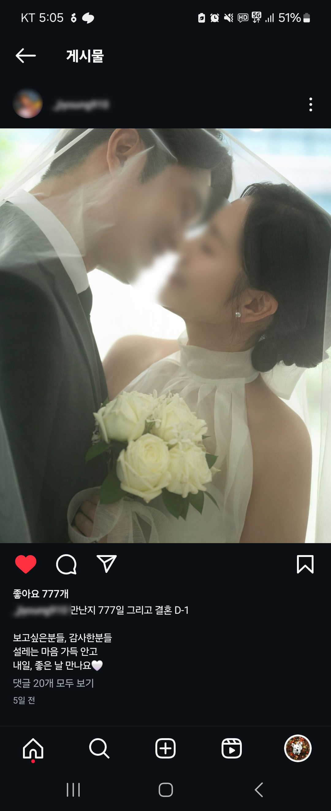 익명의 아르코님은 삼아인터내셔날의 사무실이 여의도 IFC에 있을 무렵 예(비신)랑이를 만나게 되었습니다. 그로부터 D+777하고도 +1일이 되던 날 결혼식을 올리게 된 거죠. 날짜를 일부러 맞춘 건 아니구요. 식장 예약이 폭주해 11월에나 가능하던 것을 취소건이 생겨 9월로 당기게 되었다~ 정도가 제가 아는 전부입니다. 그러니 사귄 일자와 결혼식 날짜가 약간 변태처럼(?) 딱 맞아 떨어지는 건 우연입니다, 우연!