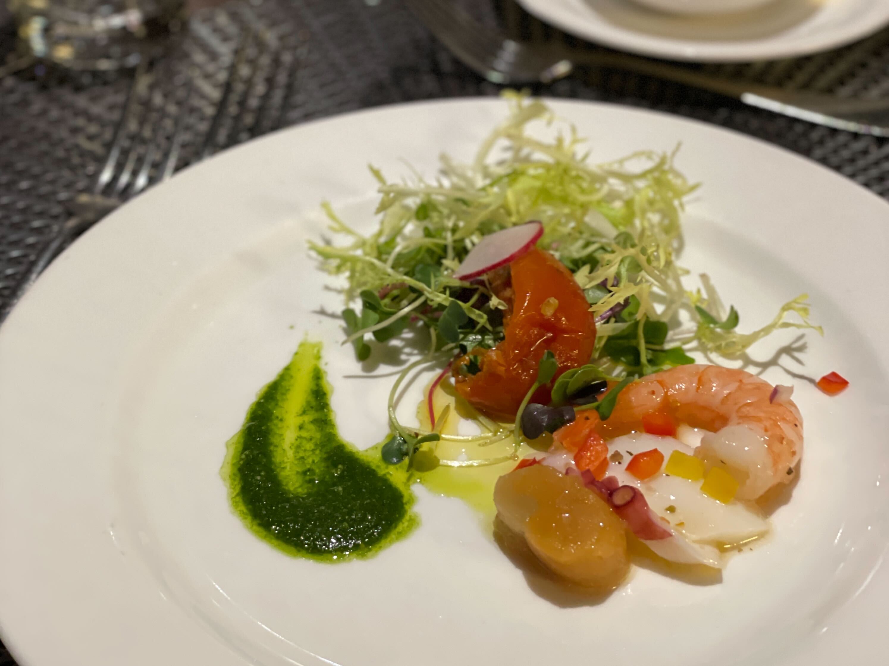 식순은 복잡하거나 길지 않았습니다. 신랑측 부모님께서 준비하신 축복 기도와, 풍부한 성량의 축가가 끝나며 1부가 마무리 되었어요. 삼아인터내셔날 복지몰사업부 임직원이 워낙 많이 하객으로 방문한 터라 12명 정원인 한 테이블에 앉기가 턱없이 부족해 두세 테이블을 점령하고 식사를 시작했네요. 신랑신부가 사진촬영을 준비하는 동안, 식전빵과 에피타이저가 나왔습니다. 새우와 관자, 썬드라이 토마토가 상큼하니 아주 맛있었어요.